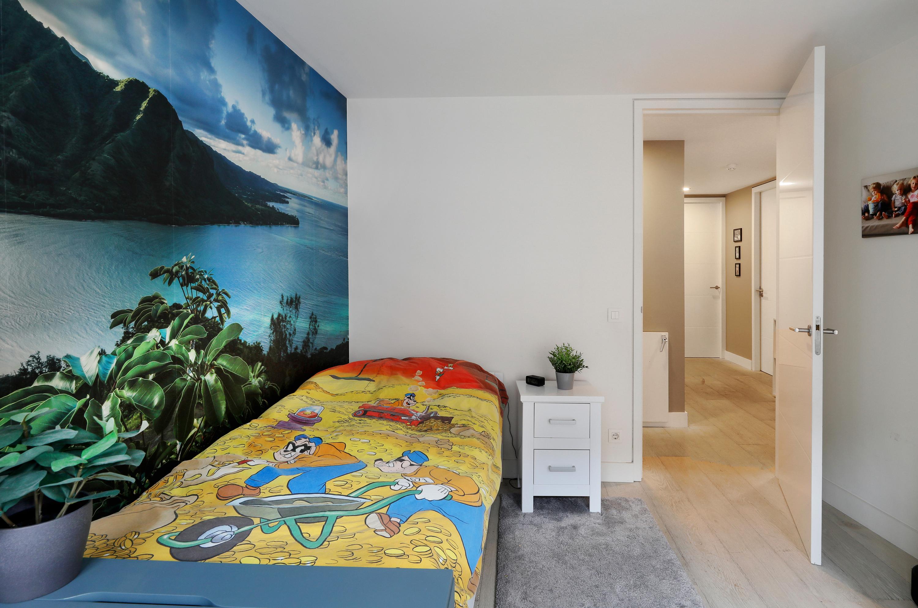 This family finds it convenient to use a bedroom as a study. And when guests come, they find their place here too. It's understandable that the owner chose this room for work. The view alone makes your workday more enjoyable, doesn't it? And in spring, the garden doors naturally open early. There are plenty of built-in closets with space for a TV. Just like the rest of this floor, there's a wooden engineered wood floor with a whitewash finish. It's a tasteful combination with the other sleek finishes.