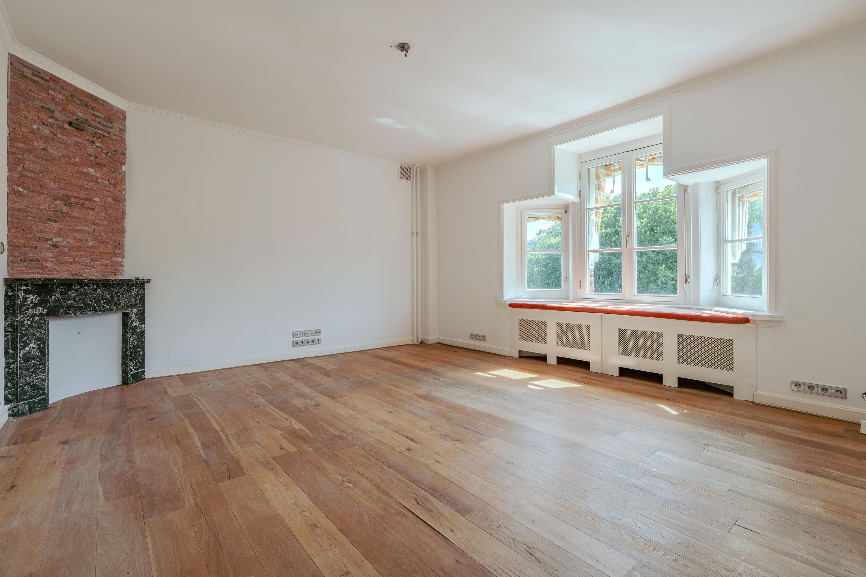 Through the communal entrance, you reach the front door of the apartment on the third floor. From the spacious hallway, you walk directly into the centrally located open kitchen. This kitchen is equipped with an induction cooktop, extractor hood, sink, Quooker, ample storage space, and a convivial bar, making it the heart of the living floor. Adjoining the kitchen is the generous living room, a charming space with large windows and a characteristic bay window that allow abundant natural light and offer beautiful views over the water and the Beatrixpark. Two decorative fireplaces add further character to the room, while the built-in cabinets provide practical storage. The original stained-glass details in the doors highlight the authentic charm of the apartment. At both the front and rear are two spacious bedrooms, one ideally suited as a master bedroom and the other as a guest or study. The bathroom is practically designed with a bathtub, shower, and double washbasin. A separate toilet is located in the hallway.
