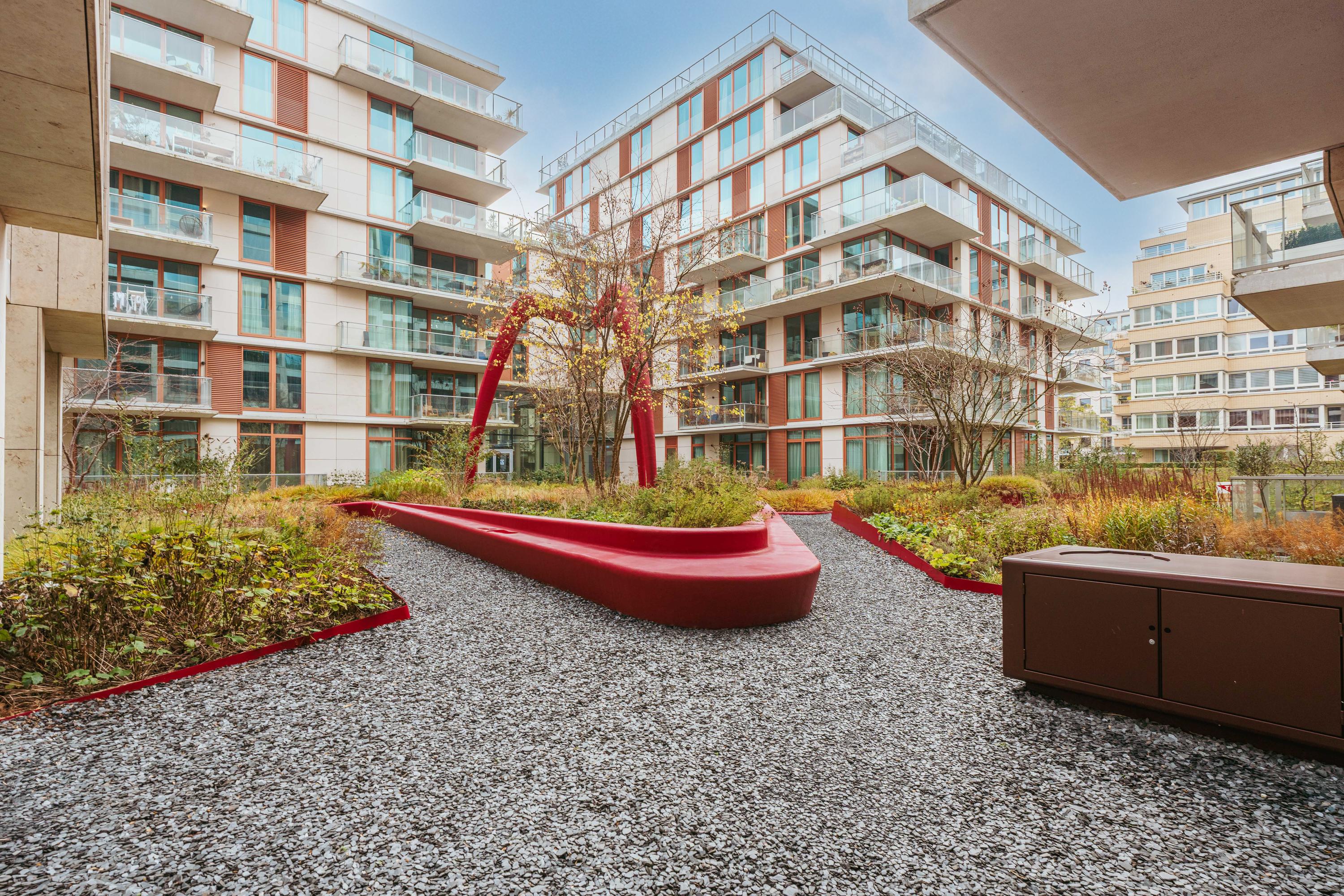 The apartment complex 'The Grid' consists of 68 luxurious residences. Completed in 2021, the building is characterised by its stepped façade and thoughtful design. The spacious lobby features an extra-high ceiling and forms the heart of the building. Situated directly along the street, with plenty of glass and views of the internal garden, it is a wonderful meeting place. The building also includes a shared indoor bicycle storage area and a parcel delivery room.
