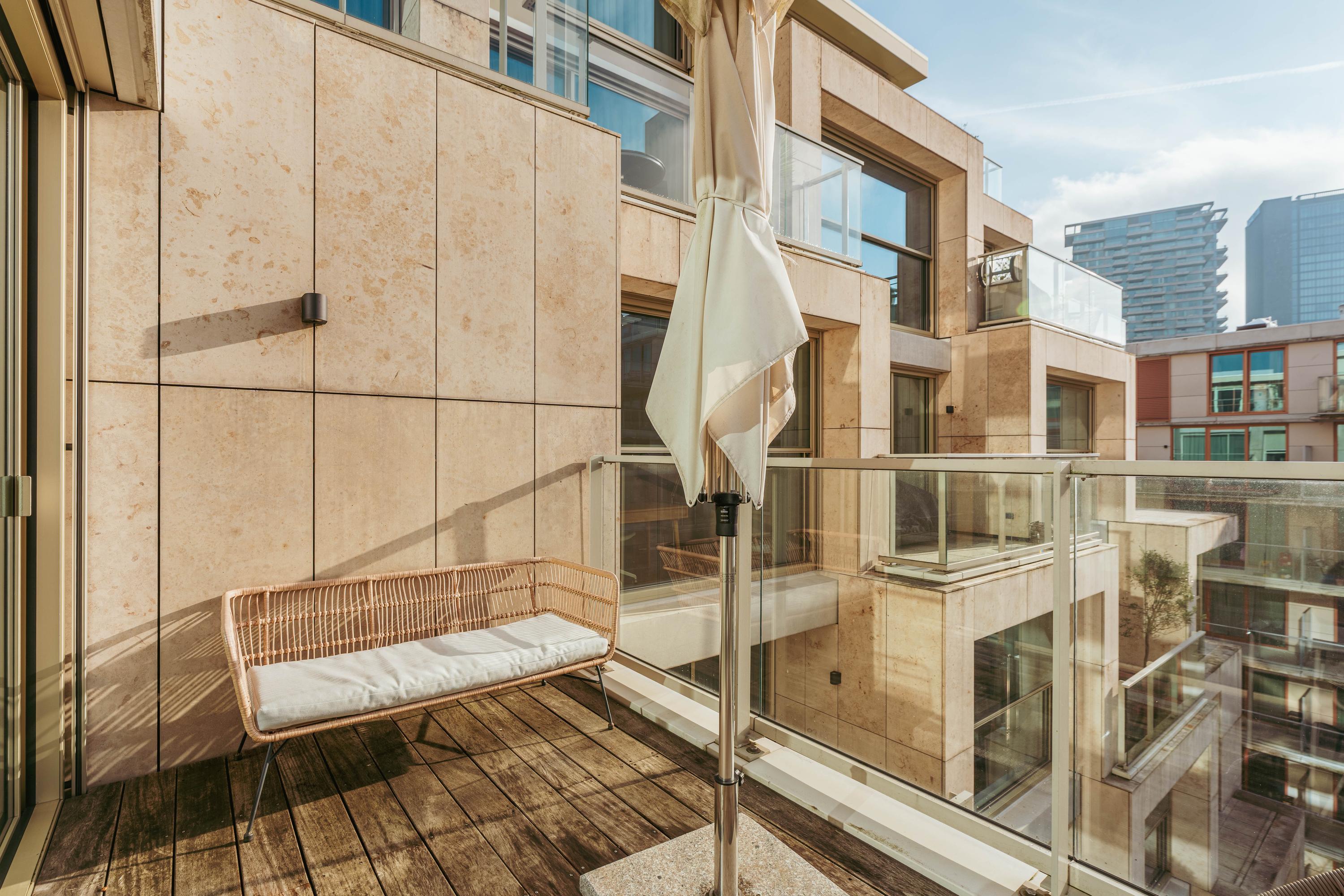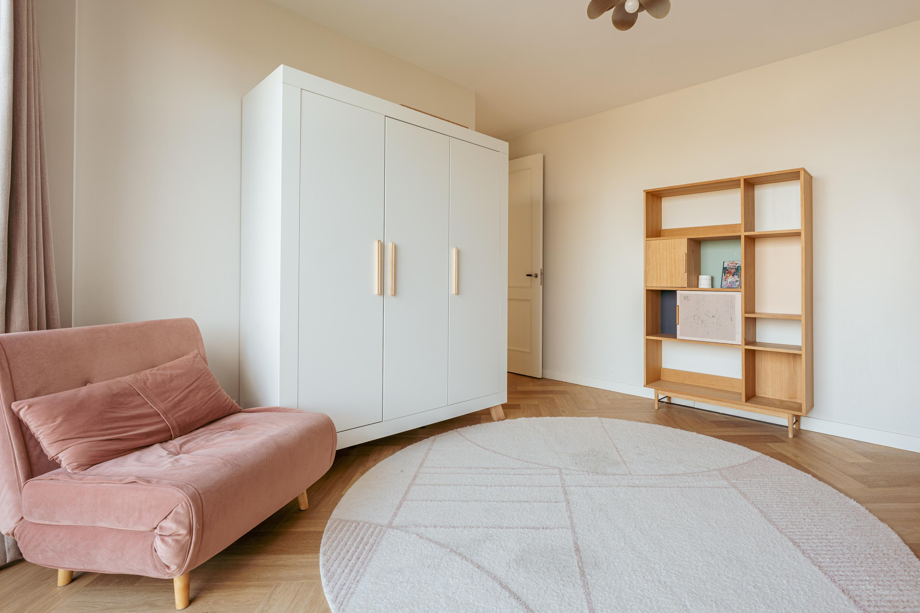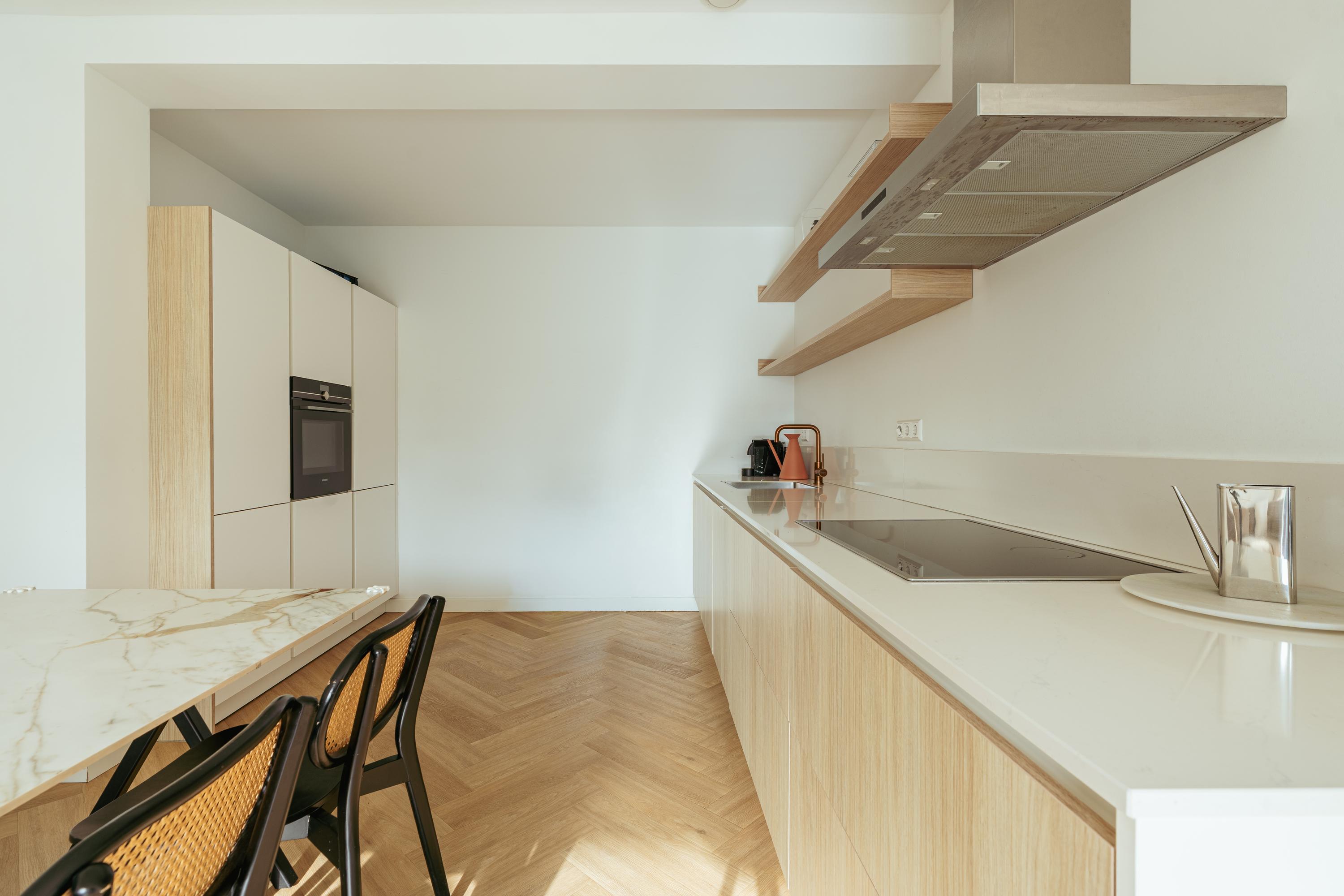 Through the well-maintained entrance of the complex, you reach the fifth floor by lift or stairs. The hallway includes a separate toilet with washbasin and a spacious storage room containing the heat pump and the necessary connections for a washing machine and dryer. From here you have access to all rooms. The generous primary bedroom is located at the front. Impressive windows allow for an abundance of natural light. Adjacent is the spacious living room. A large sliding door provides access to the south-facing terrace. The open-plan kitchen is fully equipped with all modern built-in appliances, including an induction cooktop, dishwasher, fridge-freezer, and combination oven. There is more than enough storage space.