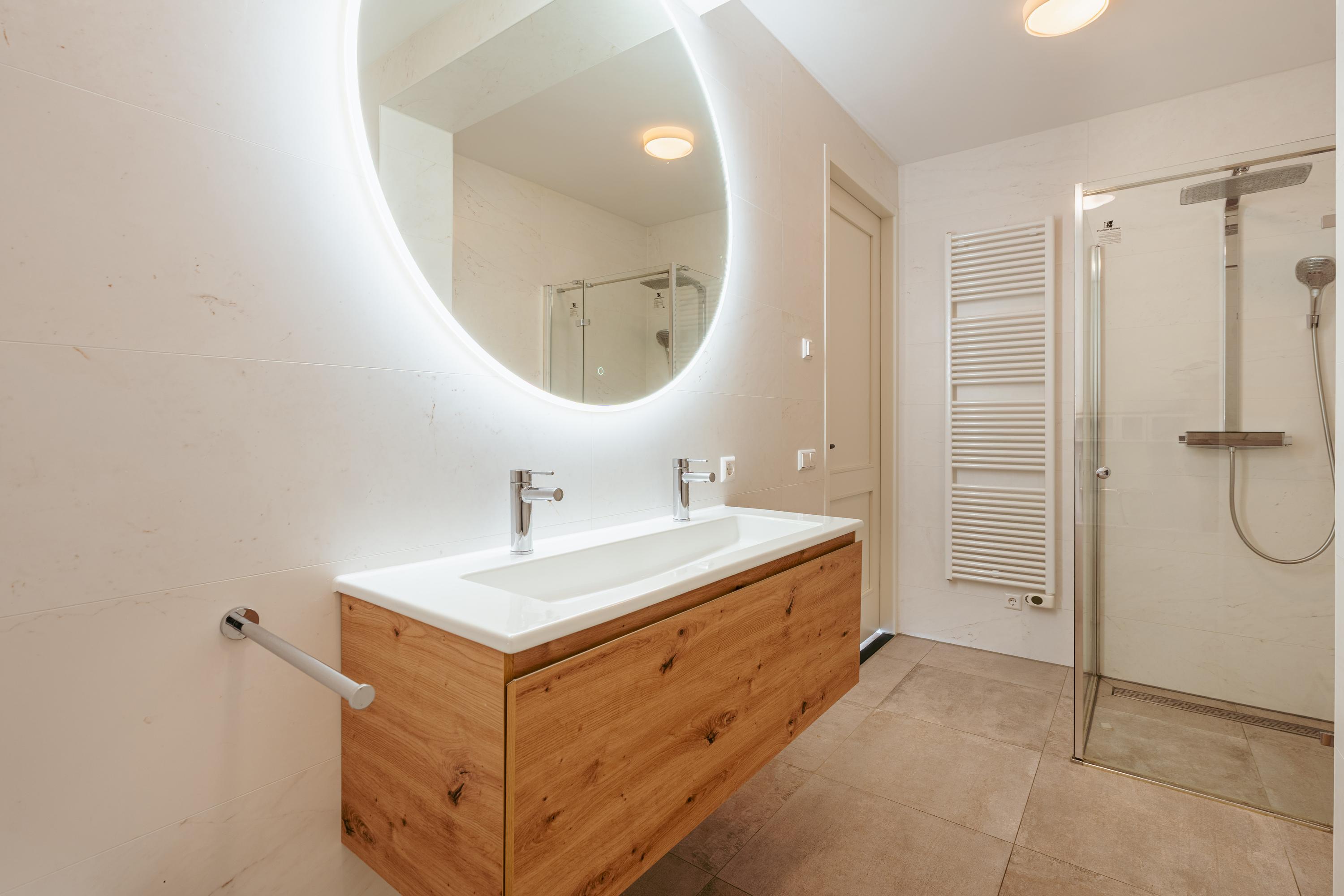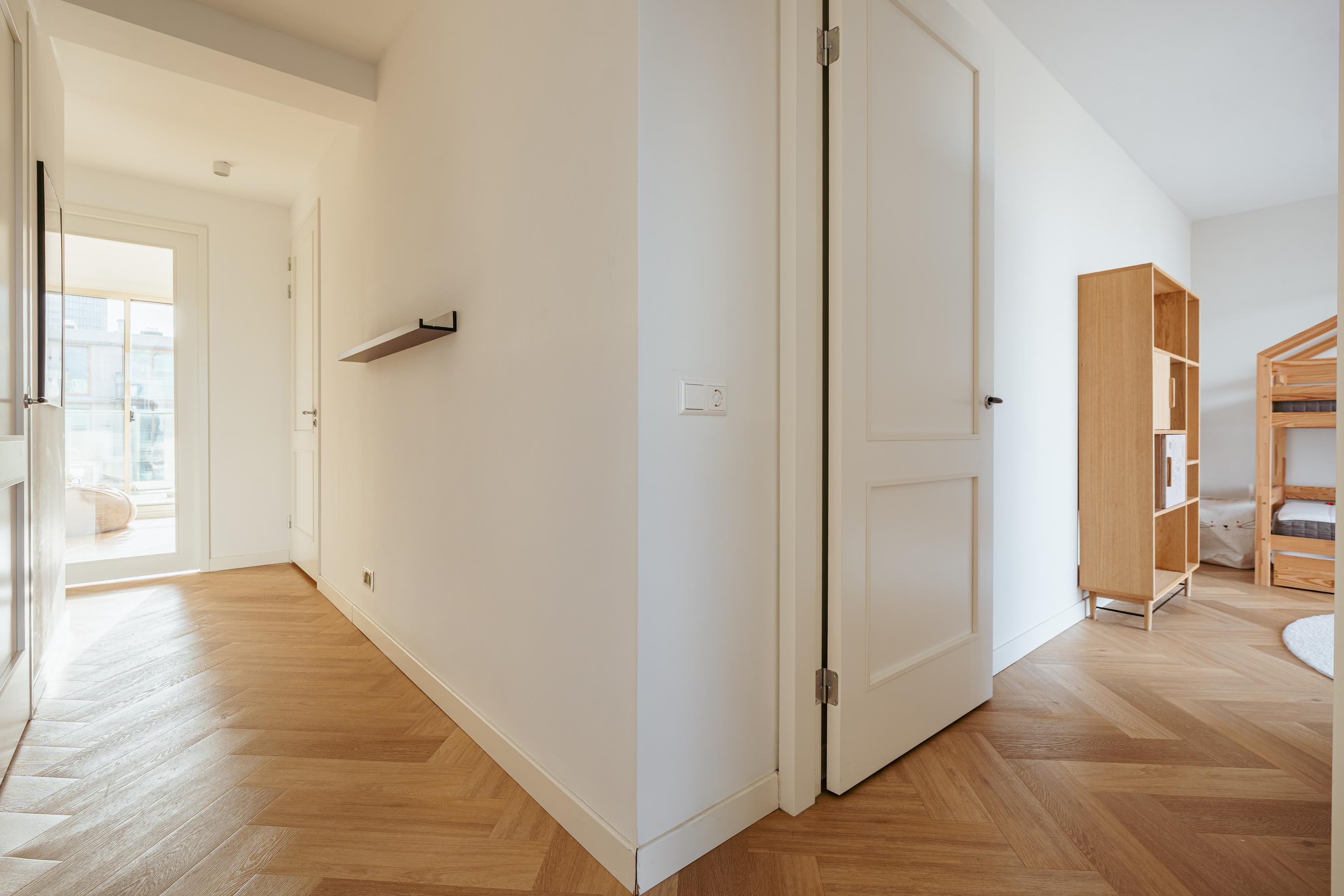 Centrally located is the bathroom, equipped with a double washbasin with cabinet, bathtub, and walk-in shower. At the rear of the home are two well-proportioned bedrooms. A second balcony with sliding doors is also situated at the rear. The entire apartment features a beautiful floor finish. In the basement level, you will find a storage unit of over 7m² and a parking space. The asking price for the parking space is €50,000 (buyer’s costs).