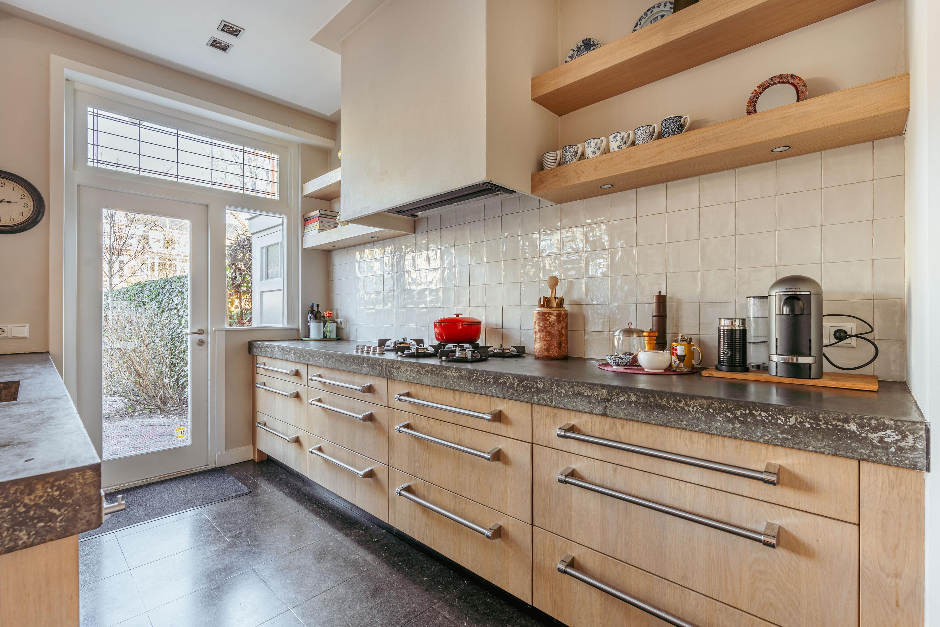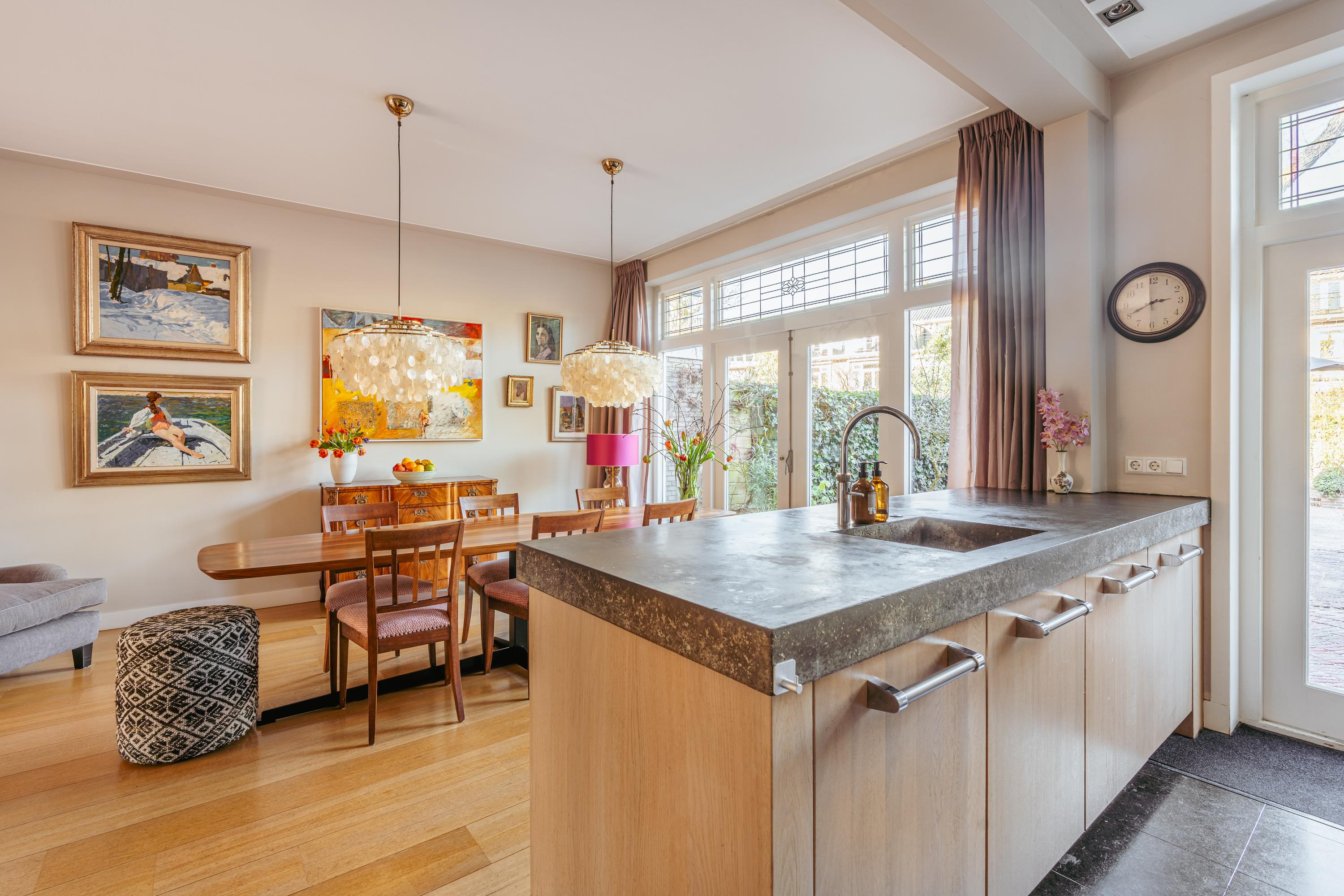 Entrance with a vestibule, followed by a spacious hallway with a cloakroom, staircase, and a separate toilet with washbasin. At the front, the inviting living room features a fireplace and a bay window, providing beautiful natural light. There is ample space for a generous seating area and, if desired, a reading or workspace. Through double French doors, you access the elevated front terrace, a pleasant spot to enjoy the sun. At the rear, behind sliding doors, is the generous dining room with an adjoining open-plan kitchen with cooking island. The kitchen is equipped with a five-burner gas stove, extractor hood, oven, combi-oven, refrigerator, dishwasher, Quooker, and offers extensive storage space. Double doors provide access to the deep and sunny rear garden, offering a high degree of privacy and featuring a detached storage unit, ideal for bicycles and garden tools. Notably, this property—one of the few on Diepenbrockstraat—also benefits from rear access, secured by a wooden gate with a code lock.