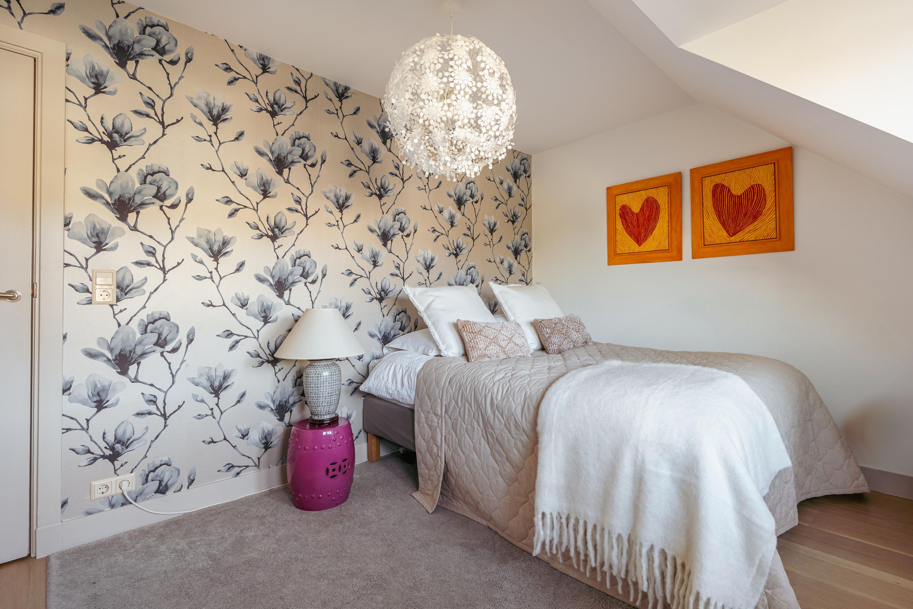 Landing with access to the fifth bedroom of this family home. The top floor boasts an impressive ceiling height and multiple windows, creating a bright and spacious atmosphere. The en-suite bathroom is fitted with a walk-in shower, washbasin with vanity unit, and toilet. A practical storage room is also accessible from the landing. This floor is highly suitable as a home office, guest room, or studio.