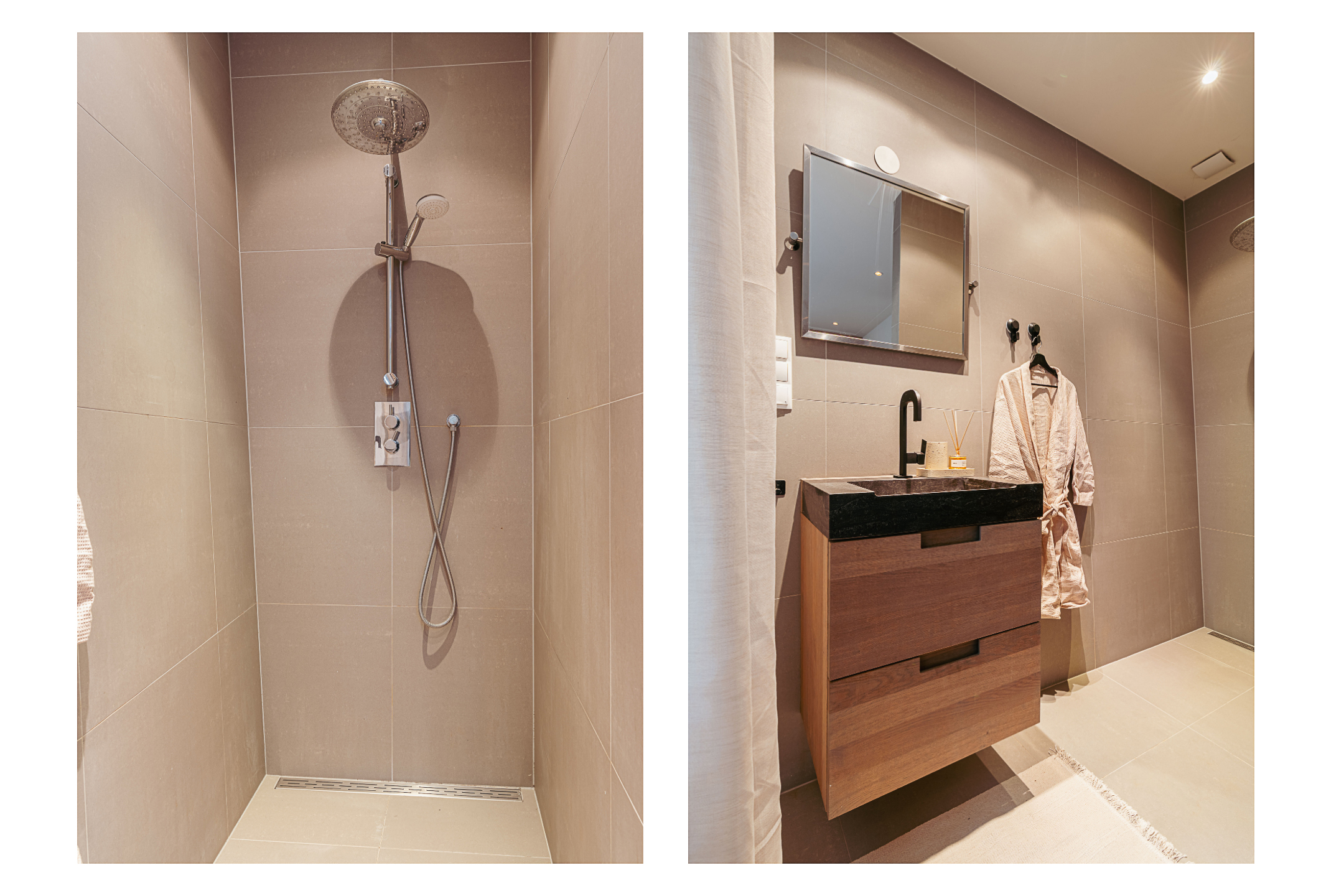 At the centre of this floor is the spacious kitchen-diner of approx. 39 m², fitted with a large cooking island and luxury built-in appliances including a dishwasher, 5-burner gas hob, fridge-freezer, microwave and oven. Warm wood elements, a stone worktop and sleek design give the kitchen a high-end and welcoming look. The island provides generous workspace, and the custom-made cabinetry offers ample storage. At the front, there is plenty of room for a large dining table, perfect for long dinners, drinks and cosy evenings with friends and family.