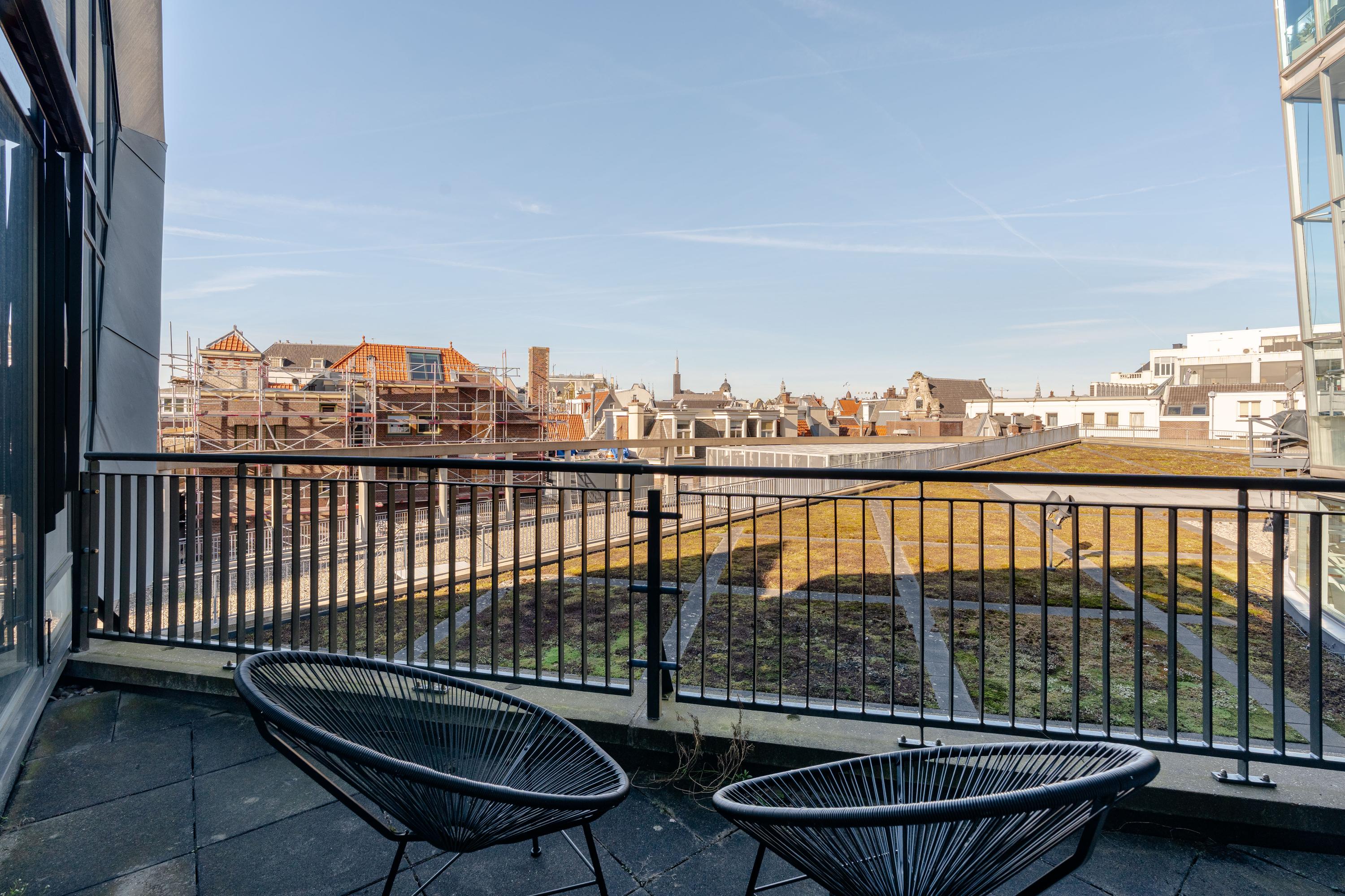 The apartment’s living level occupies the top floor, where large windows and generous ceiling heights invite daylight to animate the interiors. The living room opens to far-reaching views across the Singel and the city’s celebrated Flower Market, setting an atmosphere of refined urban calm. A half-open kitchen, complete with built-in appliances and an adjacent storage area, seamlessly connects to the dining space, ideal for gathering and entertaining.