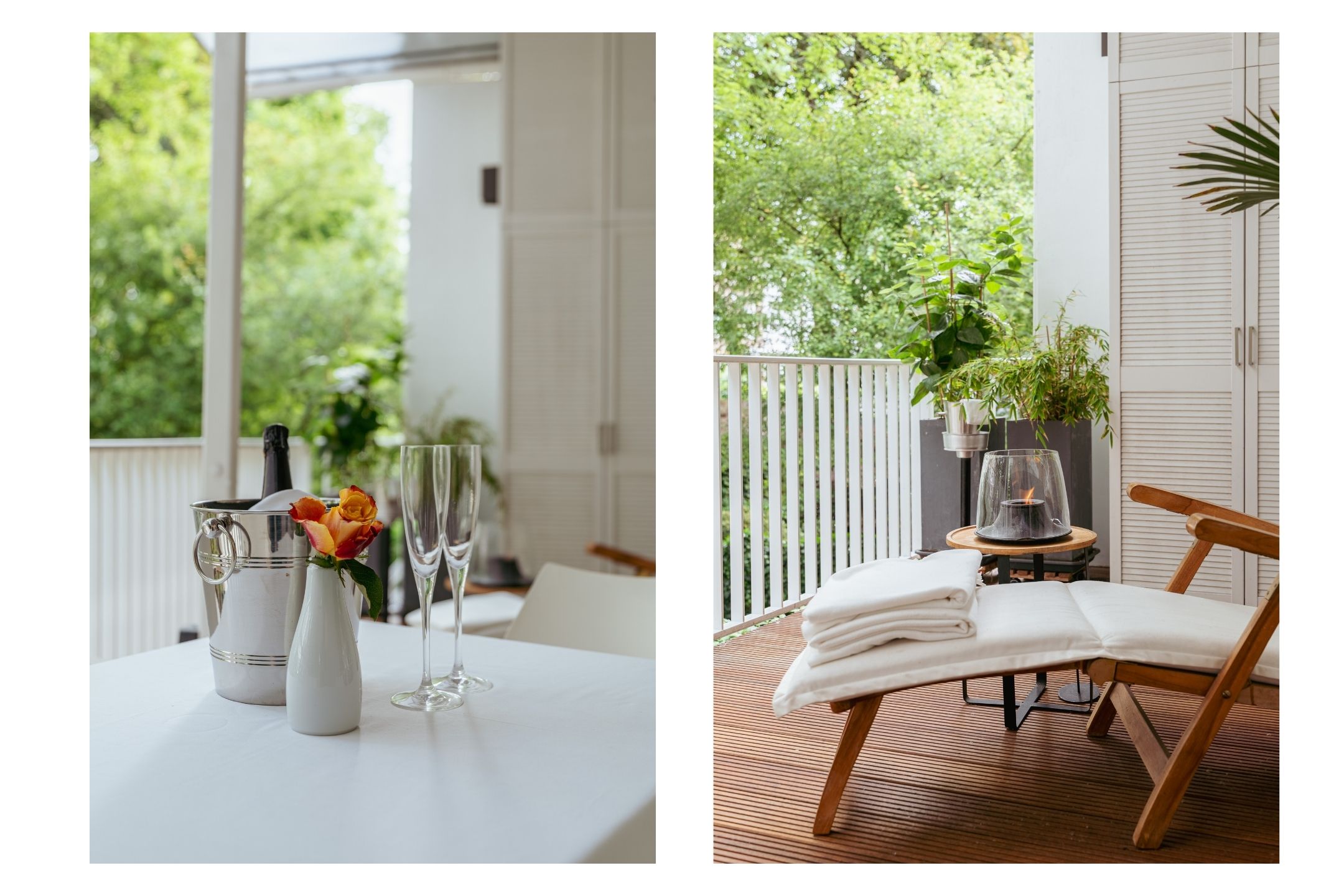 The bedroom is quietly located at the rear of the apartment and also features double French doors to the balcony. The balcony is accessible both from the kitchen and from the bedroom.
