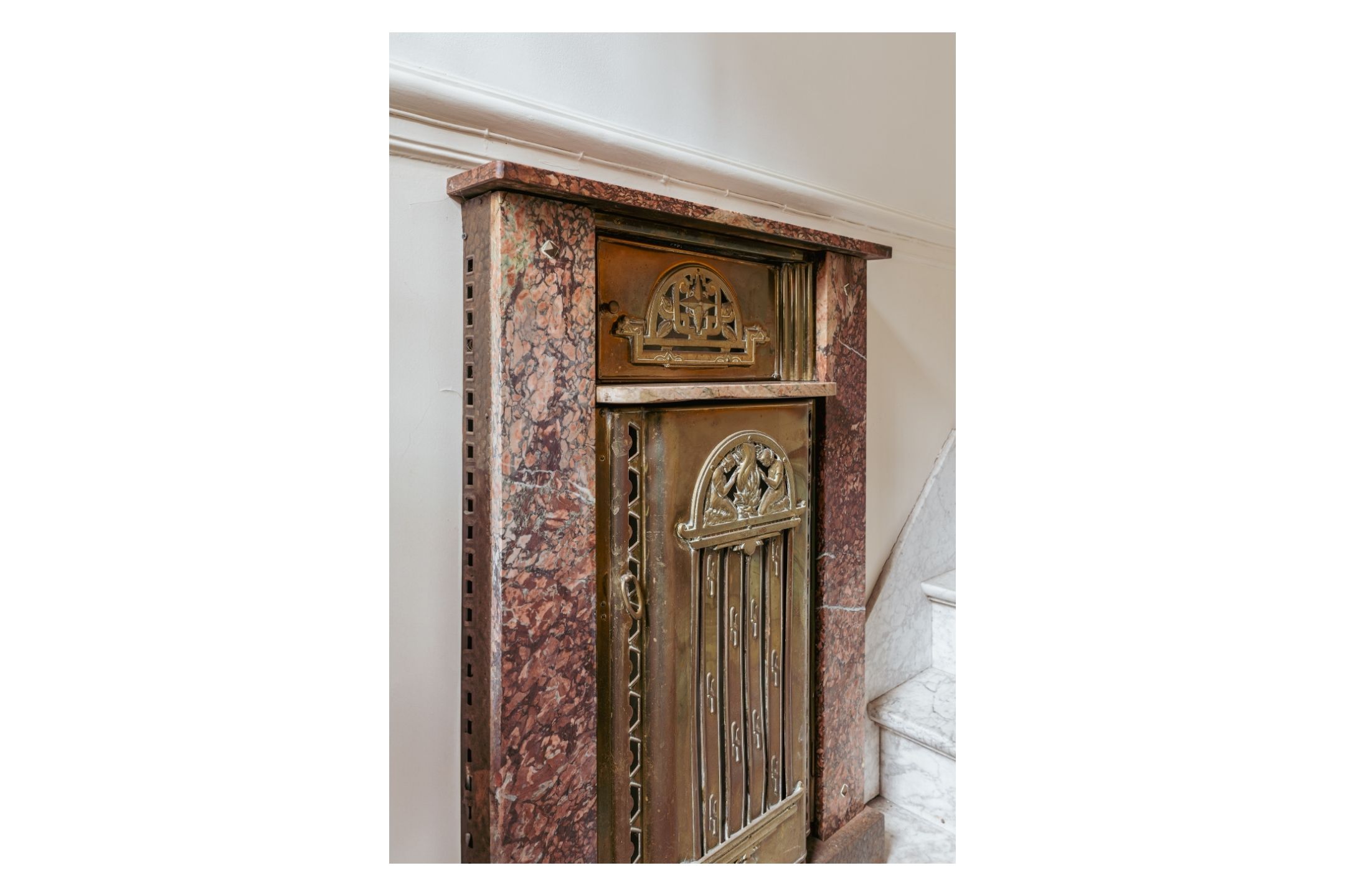 At the front of the property you will find the spacious living room, featuring an attractive (open) fireplace and large windows allowing the space to be filled with natural light. The living room is further characterised by beautiful authentic details, including richly decorated ceiling ornaments and original sliding doors, giving the room an elegant and characterful appearance. Thanks to its generous dimensions, this is an ideal space for a comfortable seating area and generous living space.
