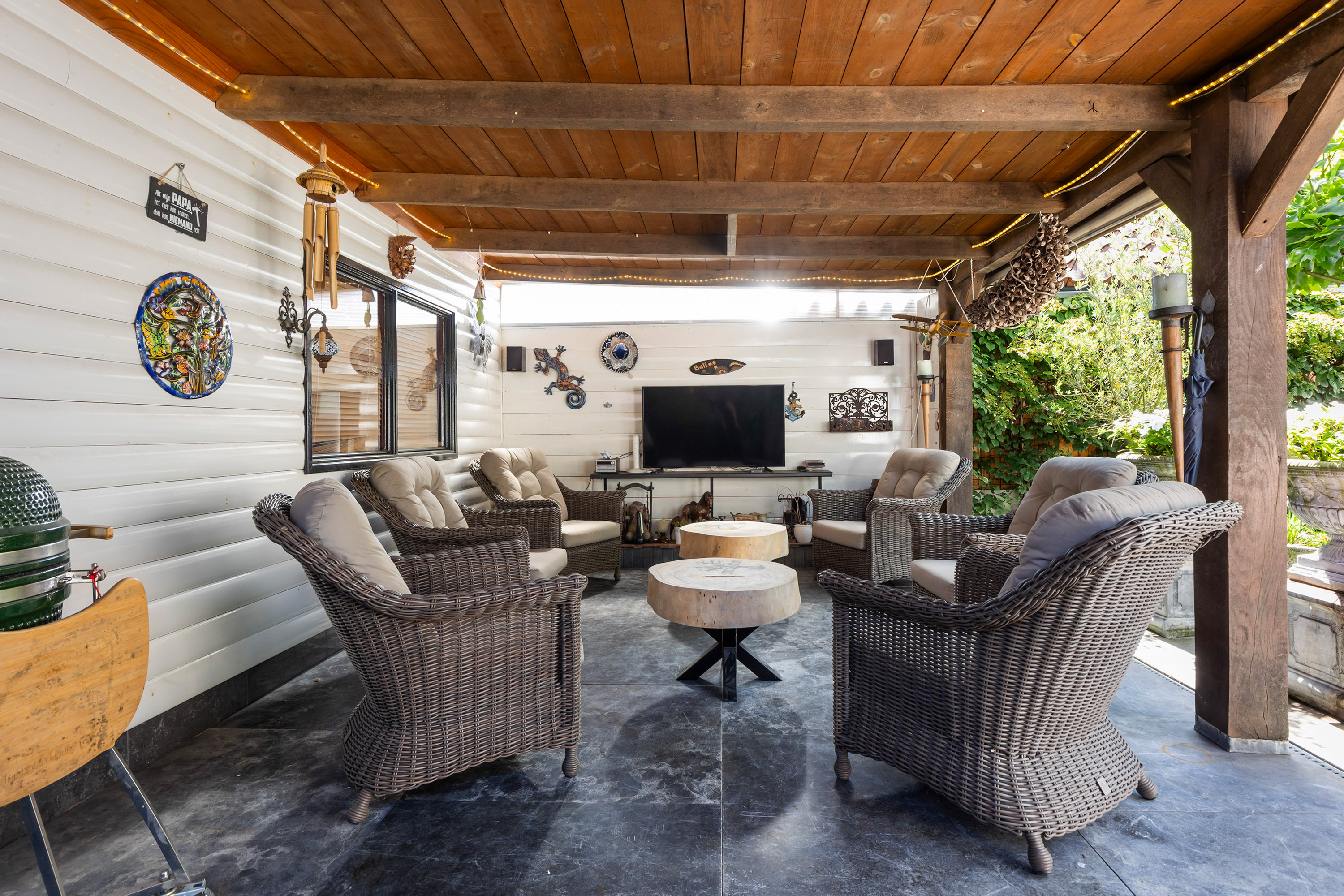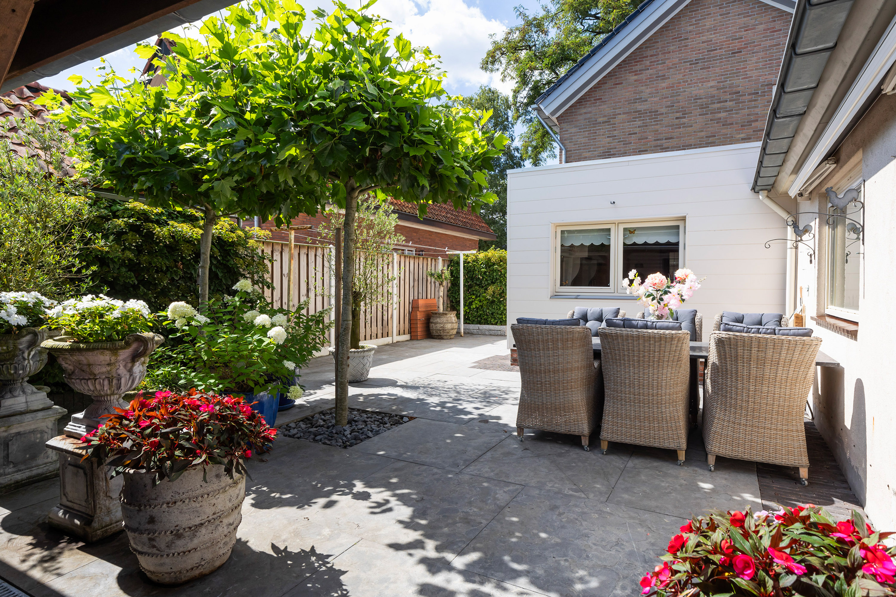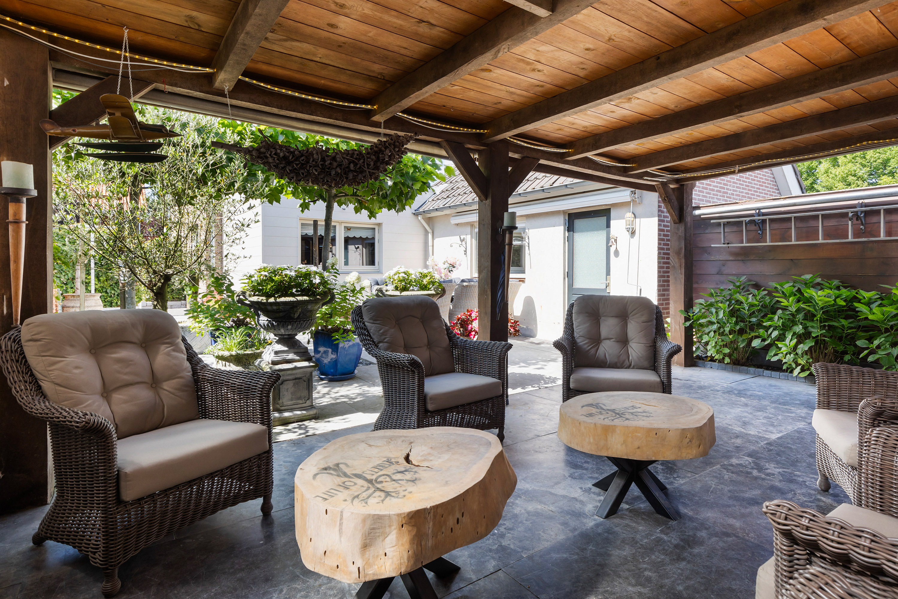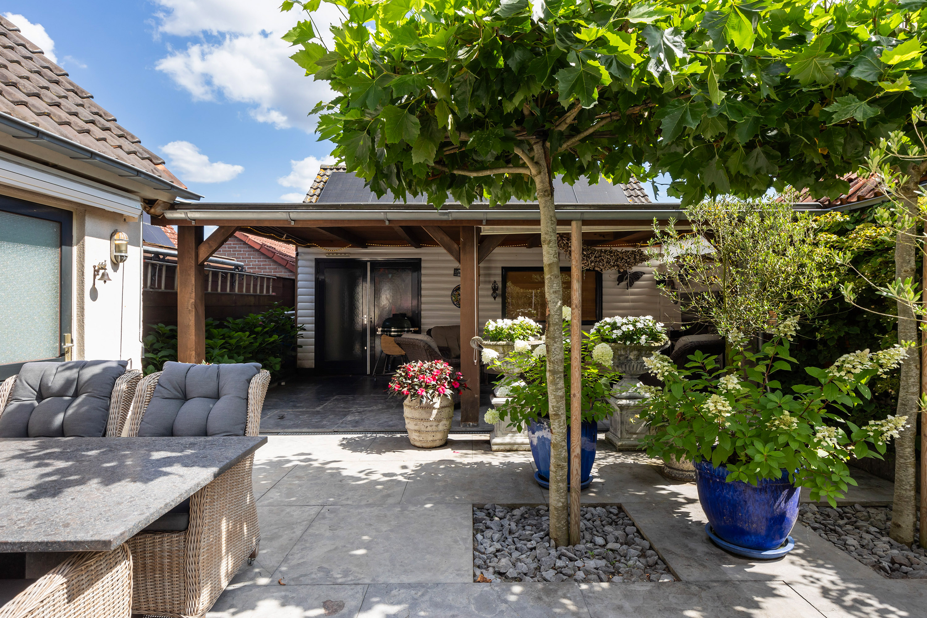 The heart of the home is the luxury live-in kitchen, designed for both daily life and social gatherings, equipped with high-end appliances, granite surfaces, a broad gas stove with oven, and a distinctive Portuguese tiled floor with electric underfloor heating. The versatile garden room connects seamlessly to the landscaped garden, where terraced blue stone, granite planters, and multiple seating areas create a private retreat. The exclusive oak veranda stands before a wooden shed, inviting quiet moments or celebrations outdoors.