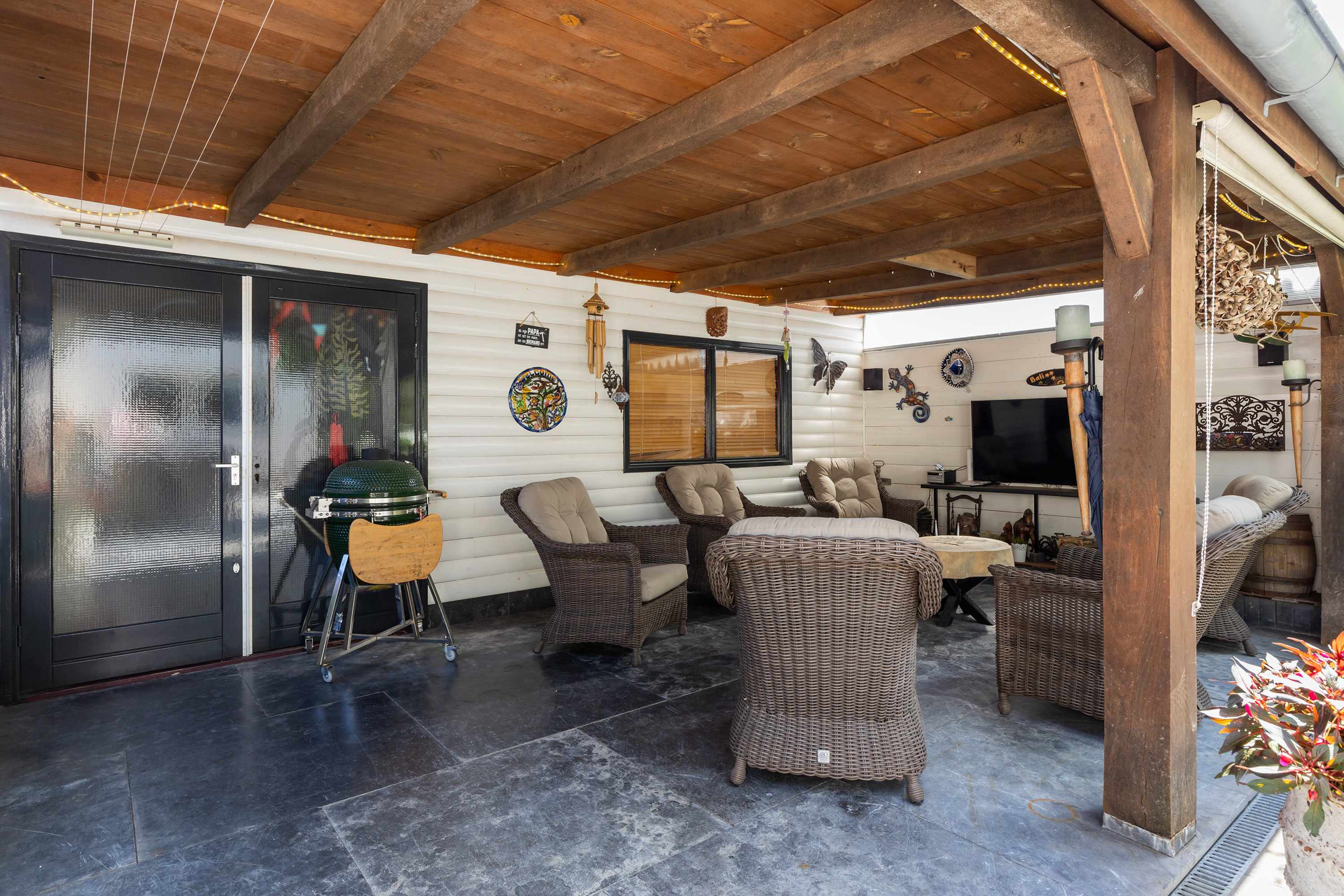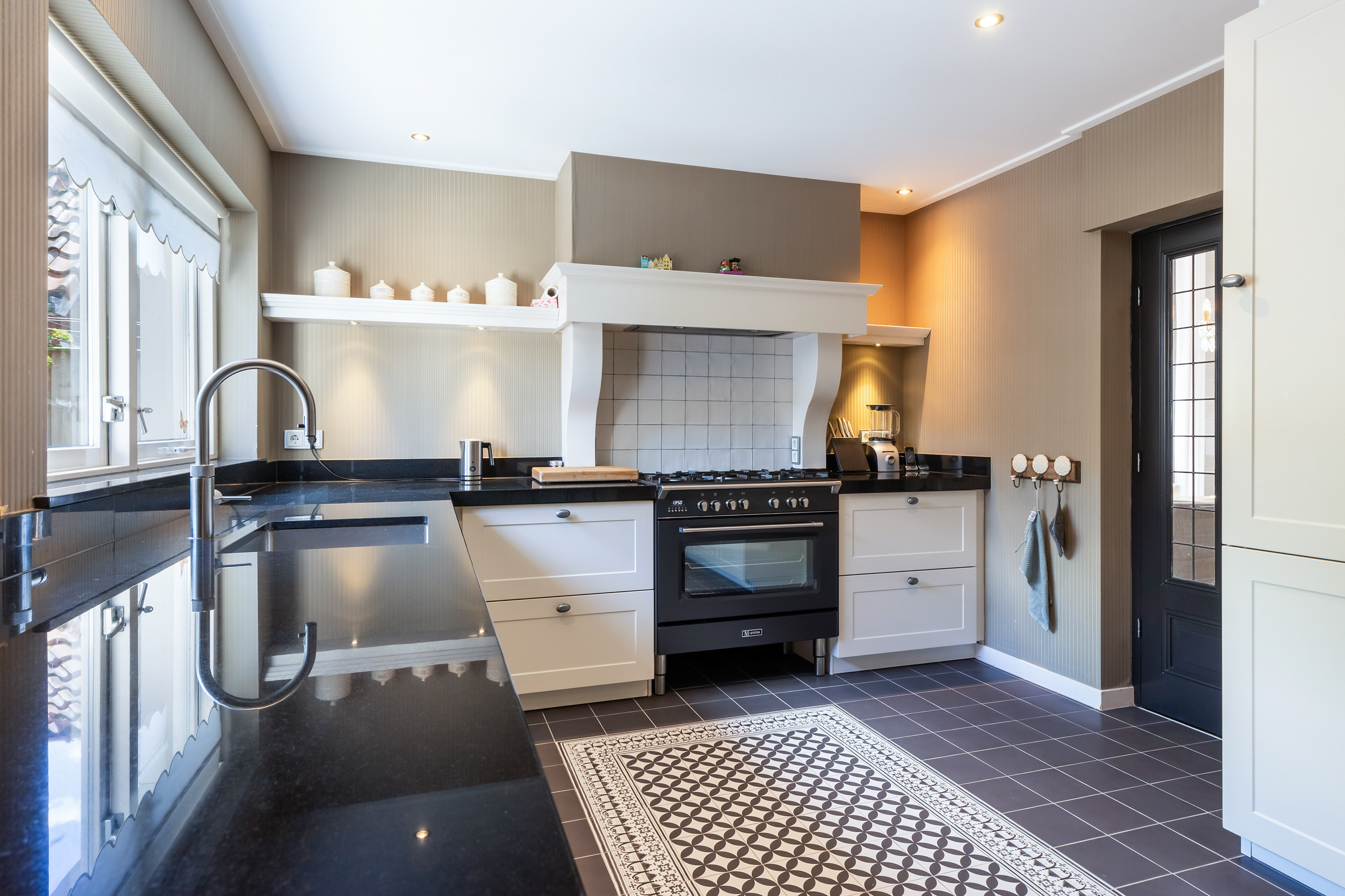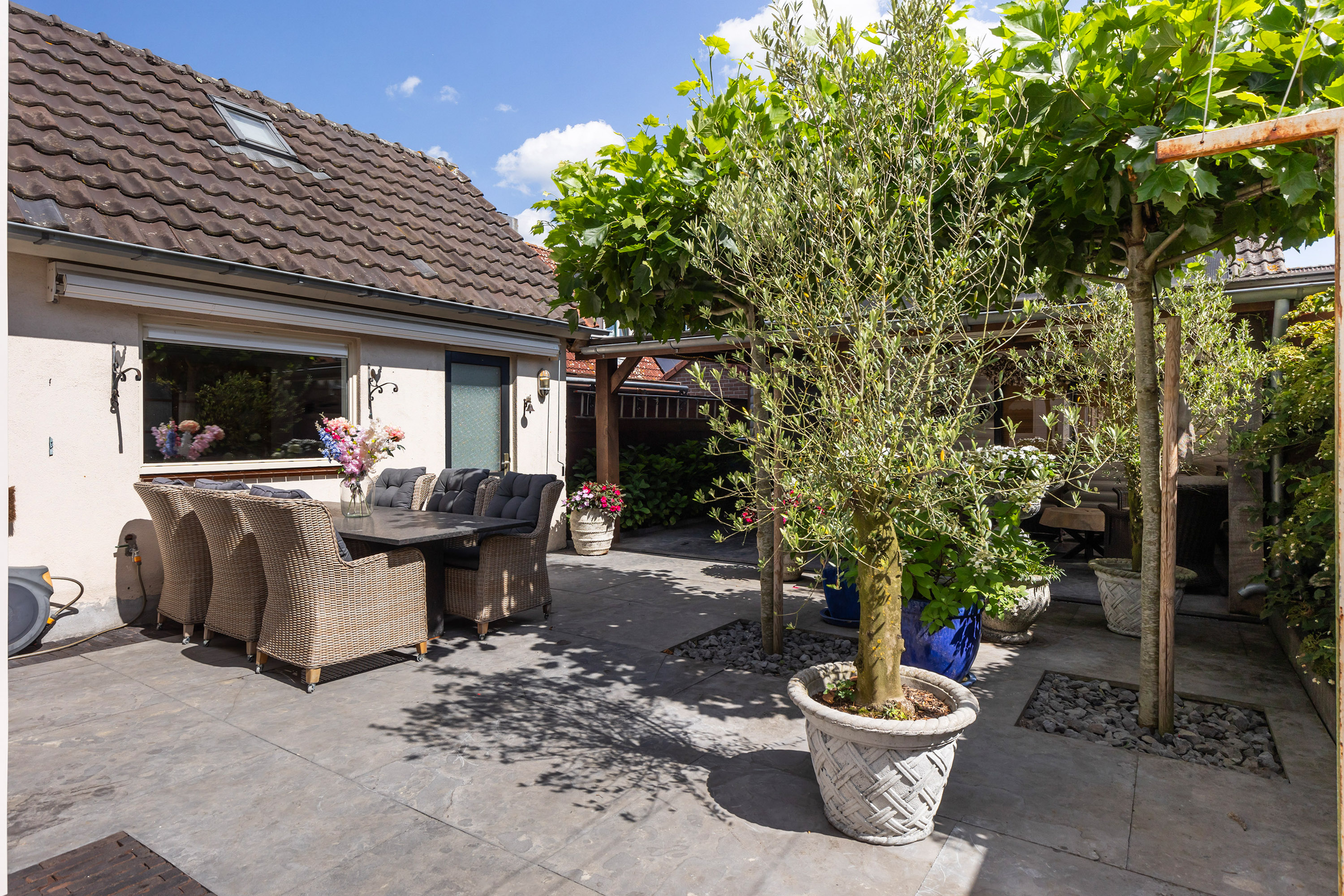 The heart of the home is the luxury live-in kitchen, designed for both daily life and social gatherings, equipped with high-end appliances, granite surfaces, a broad gas stove with oven, and a distinctive Portuguese tiled floor with electric underfloor heating. The versatile garden room connects seamlessly to the landscaped garden, where terraced blue stone, granite planters, and multiple seating areas create a private retreat. The exclusive oak veranda stands before a wooden shed, inviting quiet moments or celebrations outdoors.