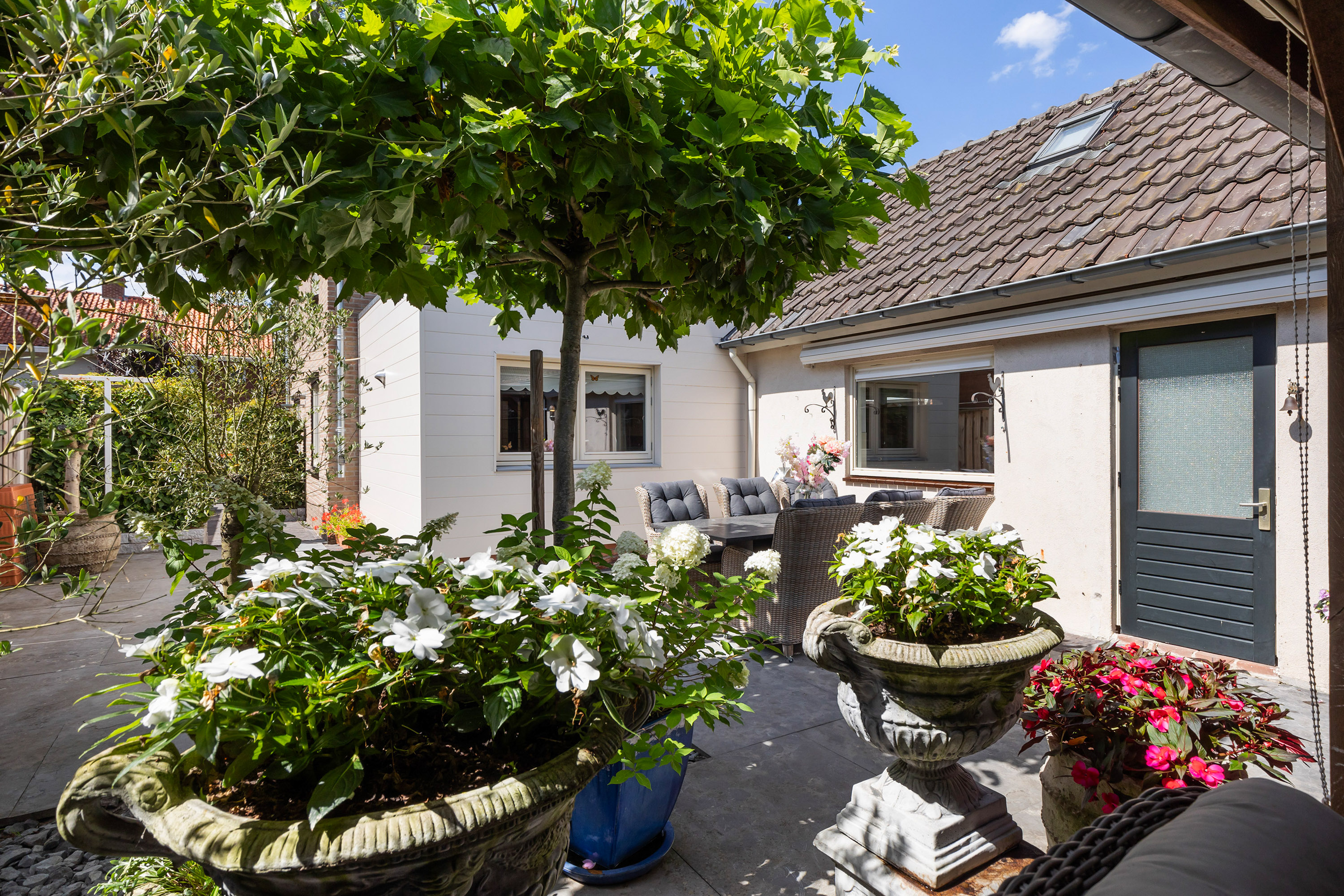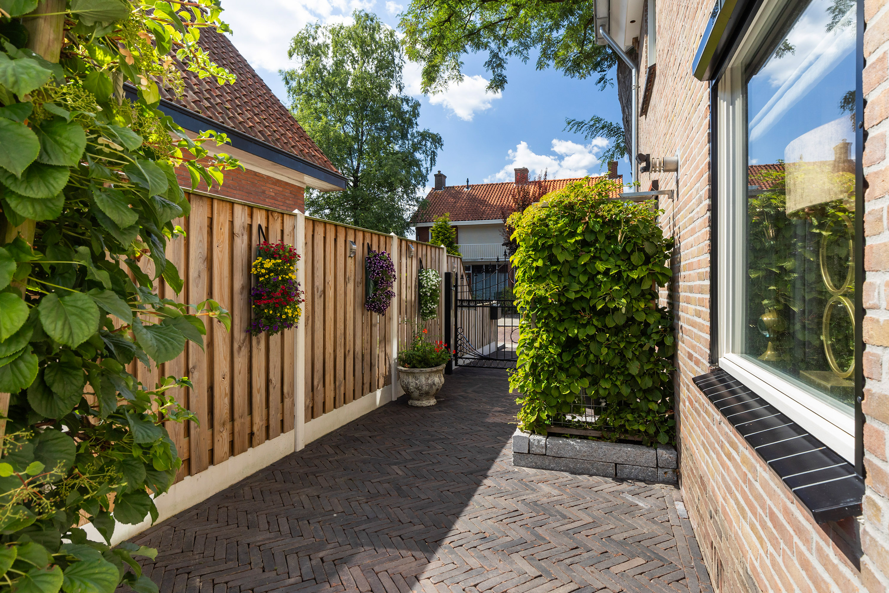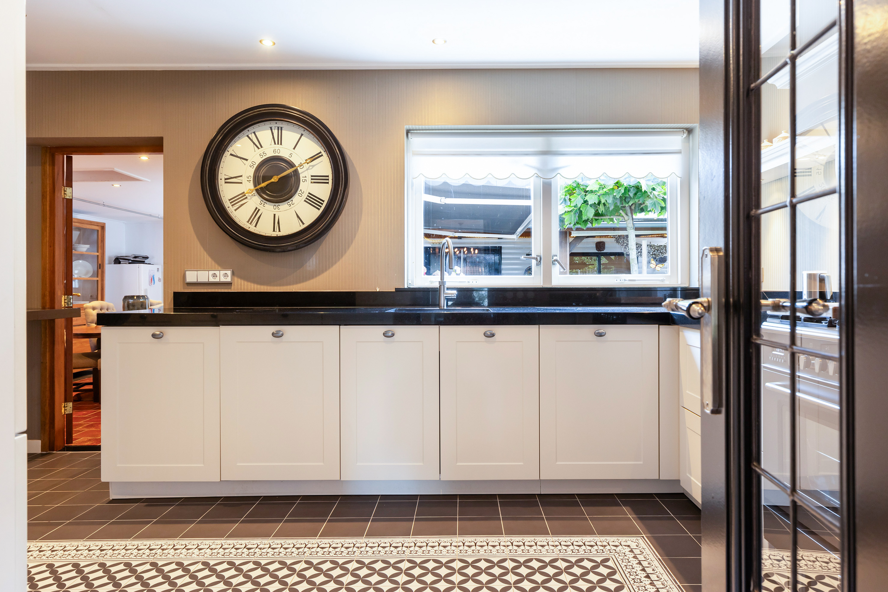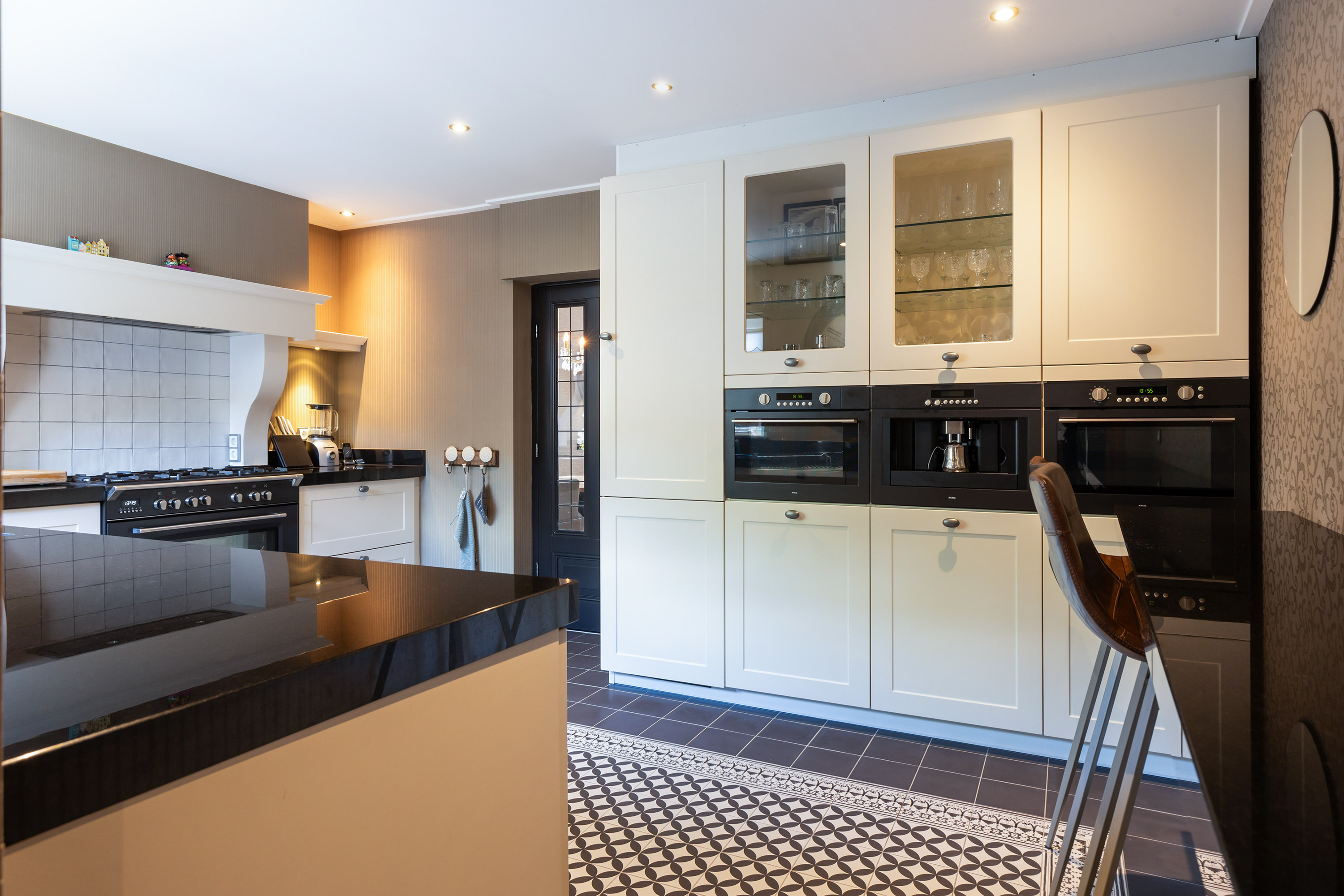 The heart of the home is the luxury live-in kitchen, designed for both daily life and social gatherings, equipped with high-end appliances, granite surfaces, a broad gas stove with oven, and a distinctive Portuguese tiled floor with electric underfloor heating. The versatile garden room connects seamlessly to the landscaped garden, where terraced blue stone, granite planters, and multiple seating areas create a private retreat. The exclusive oak veranda stands before a wooden shed, inviting quiet moments or celebrations outdoors.