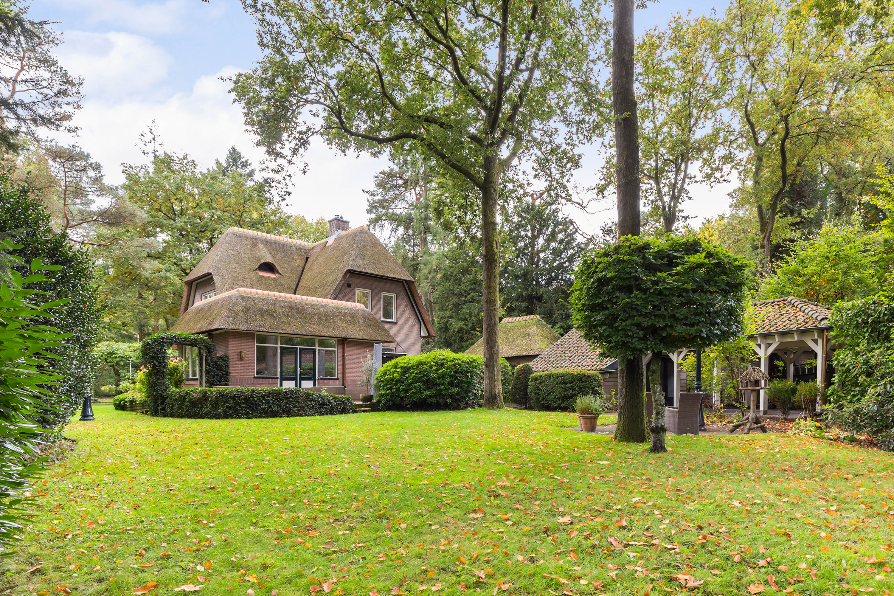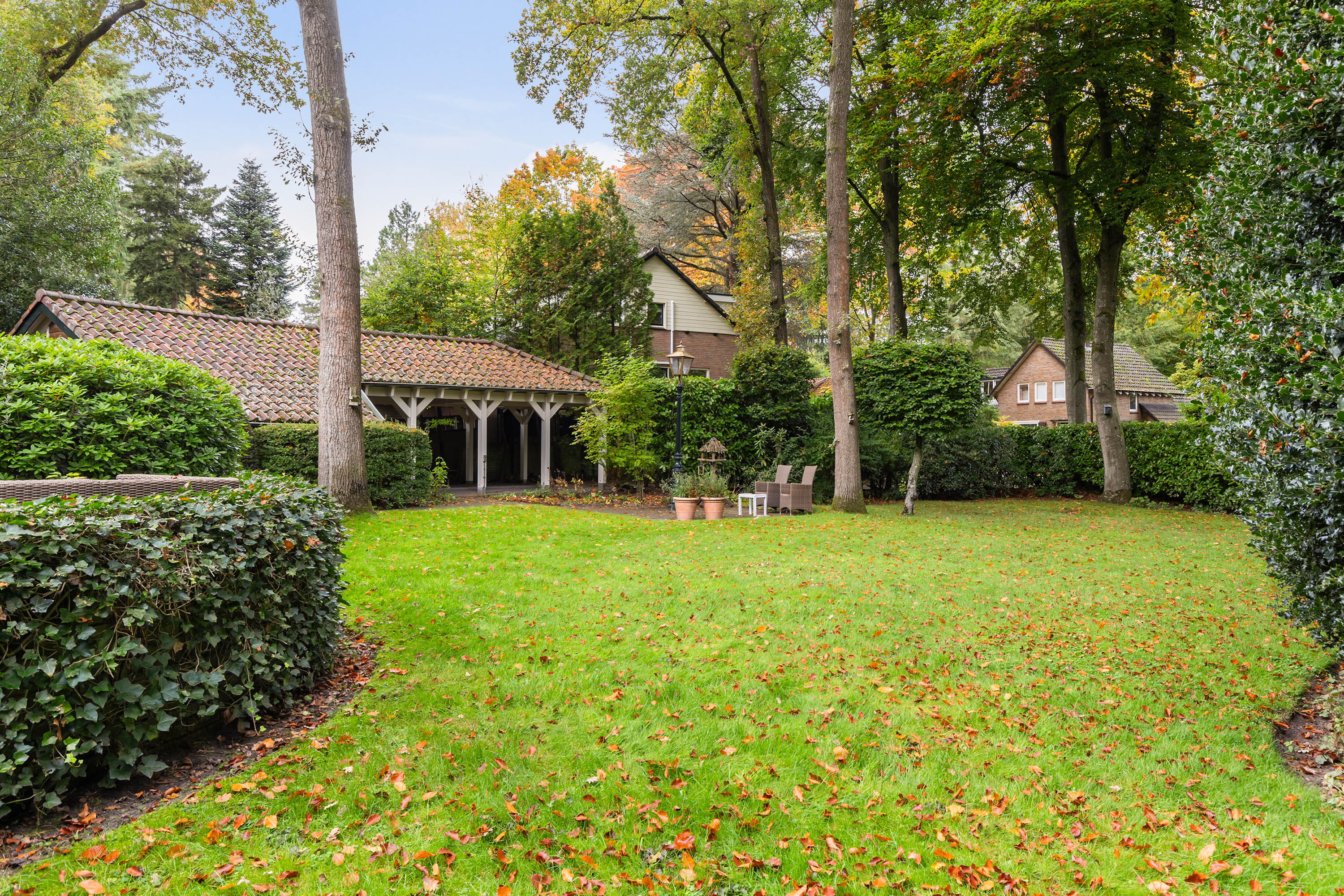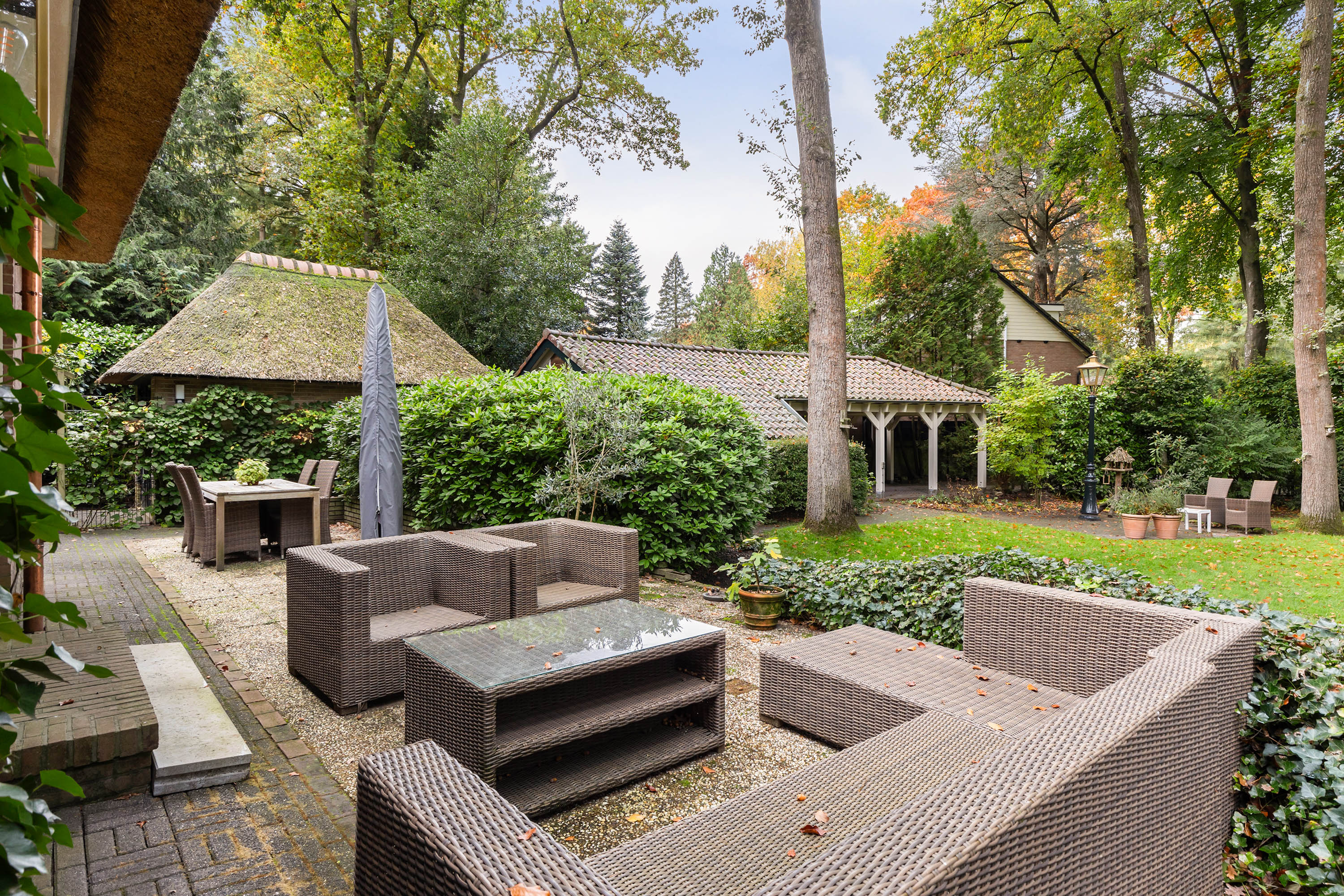 The 1,480 m² plot has dual access. From the driveway at the front, there is space for four cars beside the house. This leads to the garage, whose thatched roof and high ridge perfectly complement the villa’s architectural style. At the rear, via the Cederlaan, a generous driveway provides parking for five cars, alongside a large carport with a tiled roof. Beyond it stands a wooden storage shed with double doors.