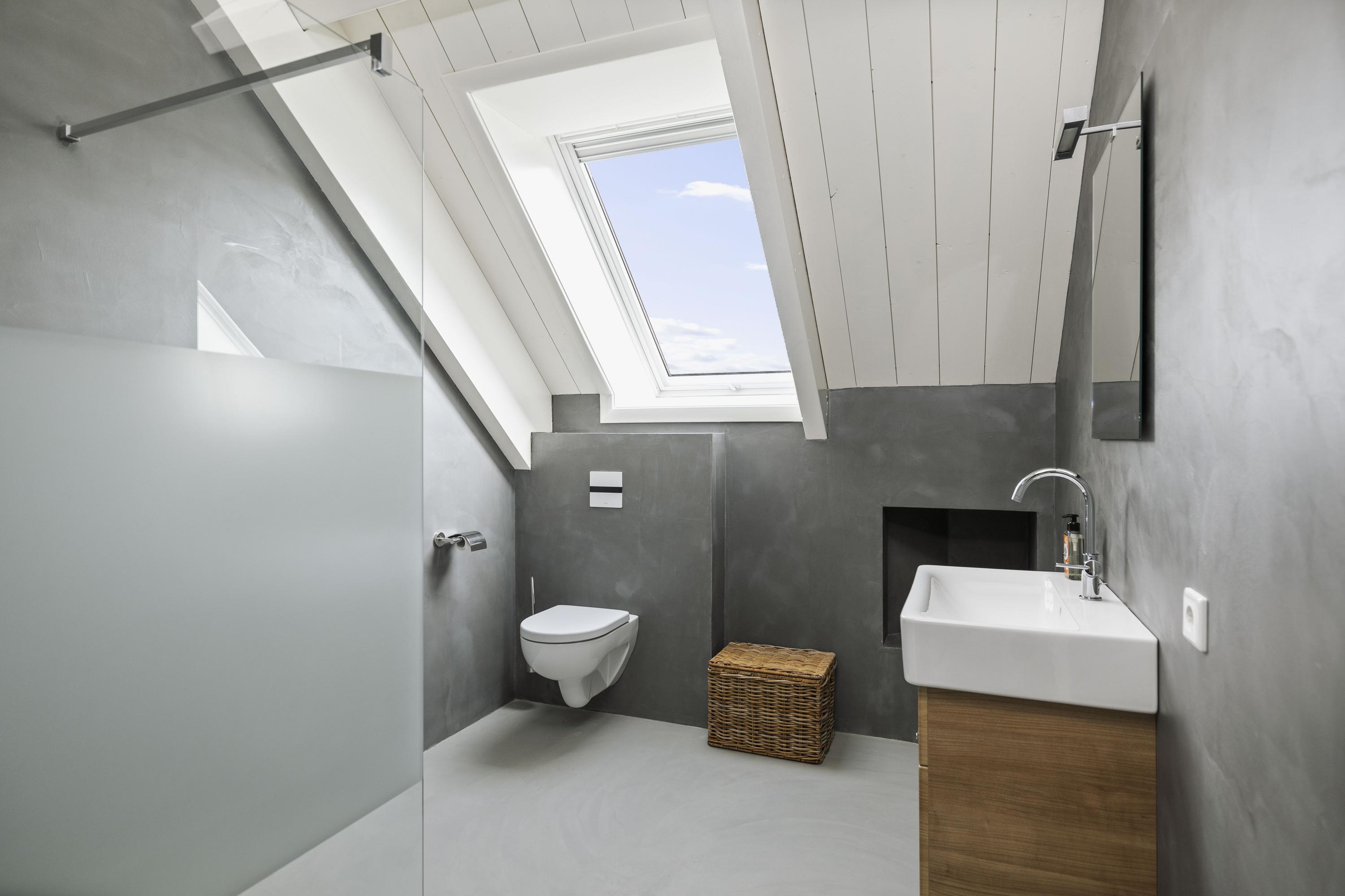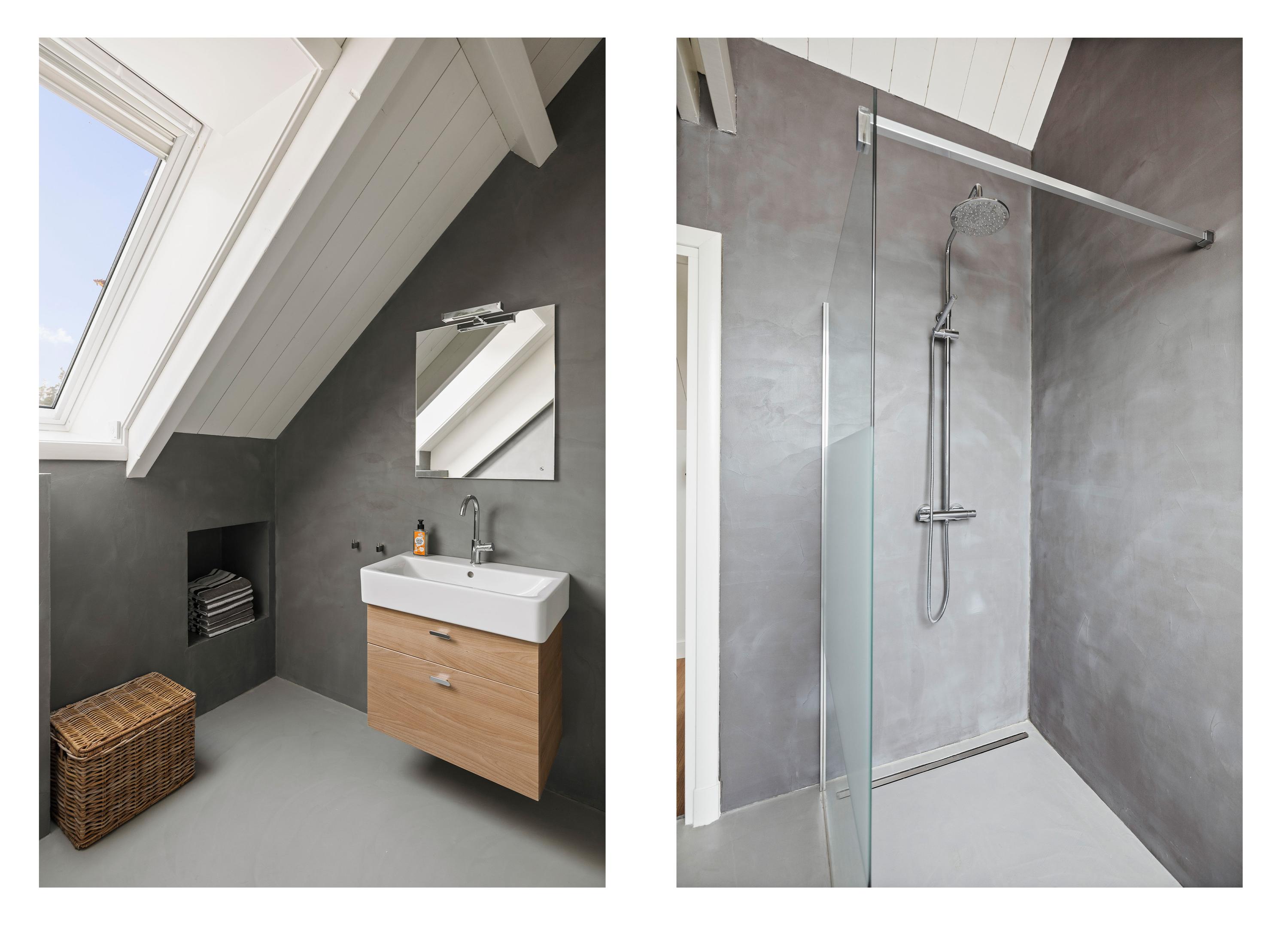 Upstairs is a spacious landing with plenty of storage space and two lovely bedrooms, also with plenty of storage space and each with its own bathroom. The walls with concrete Ciré give the rooms a chic and contemporary look. Both bathrooms have a spacious walk-in shower, toilets with Wisa non-touch flushing system and washbasin (Grohe Sphinx).