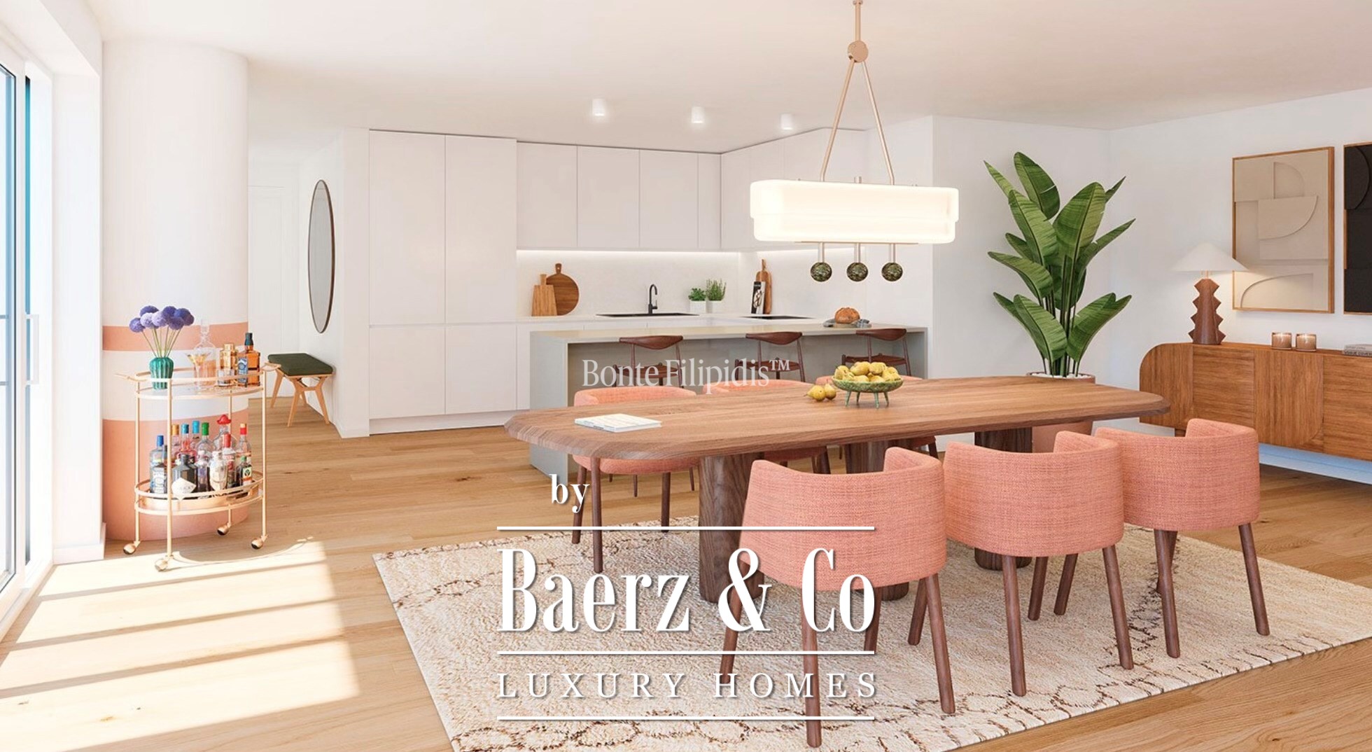 The first level is composed of generous social areas. An open-plan living and dining room stretches along the façade, enhanced by floor-to-ceiling windows that bathe the interiors in southern and eastern light. This fluid space seamlessly connects to a broad balcony and a 69 m² private terrace, where river views provide a tranquil backdrop for outdoor dining or quiet contemplation. The modern kitchen, equipped with high-spec appliances, unfolds naturally from the main living space.