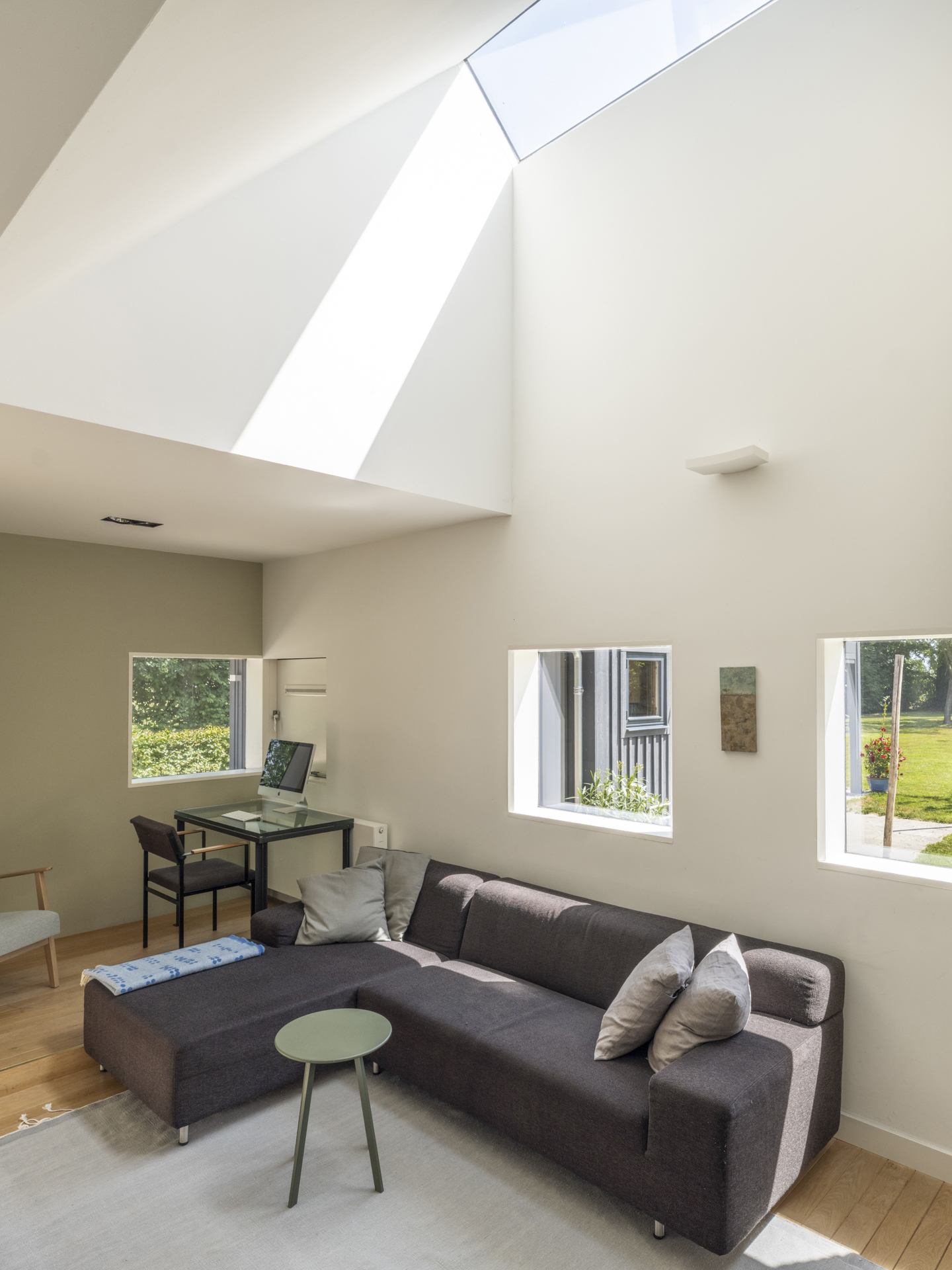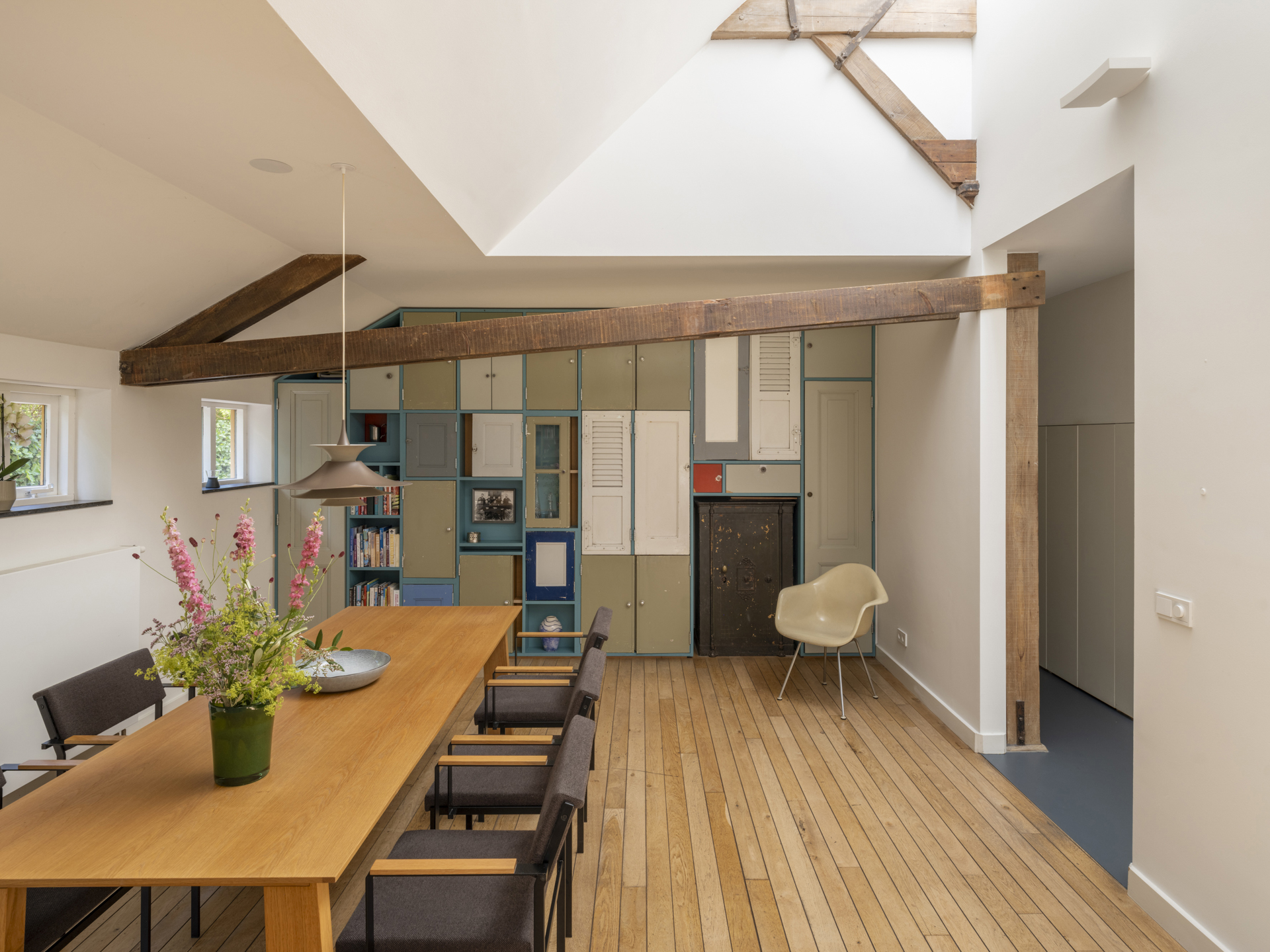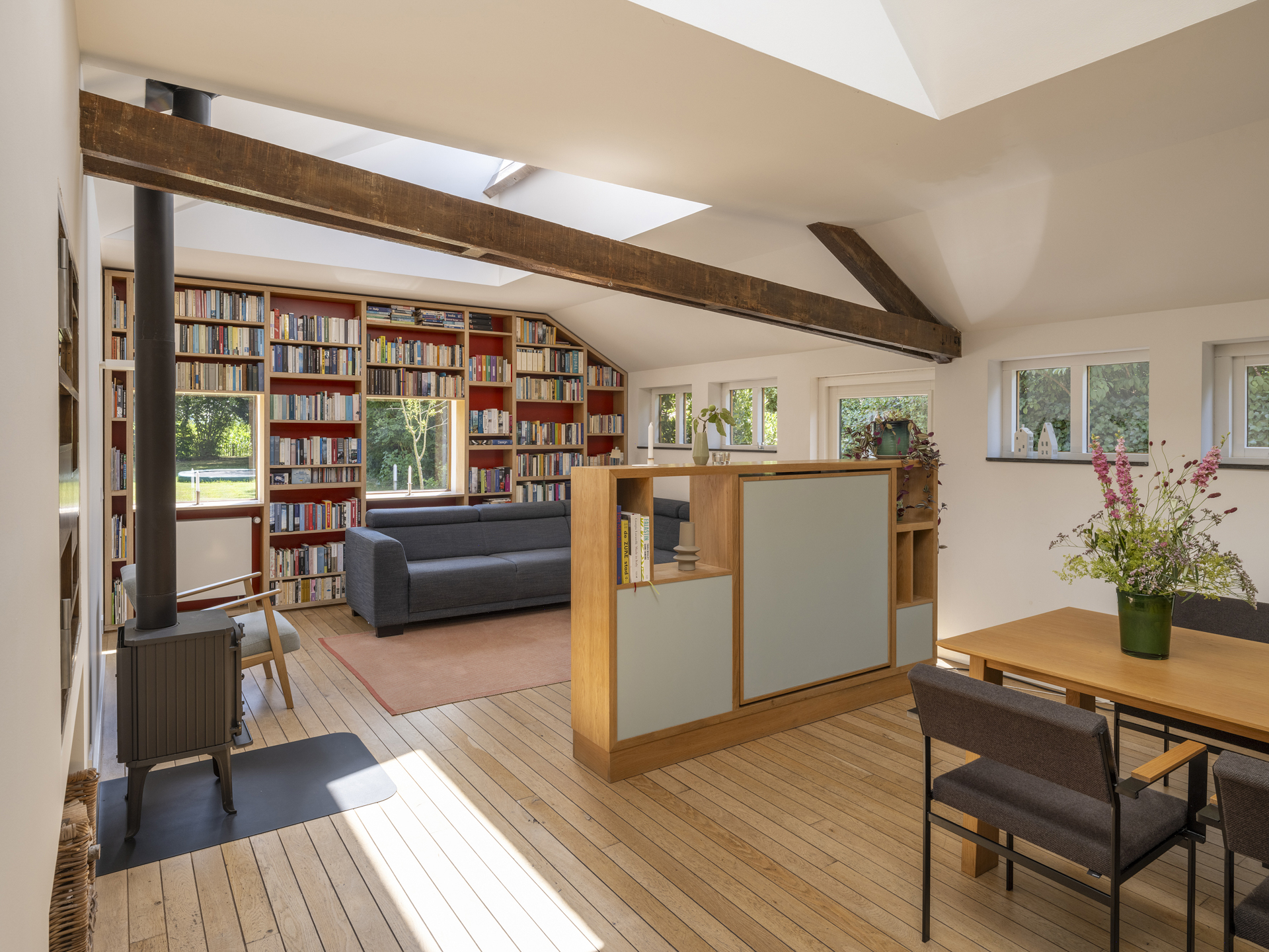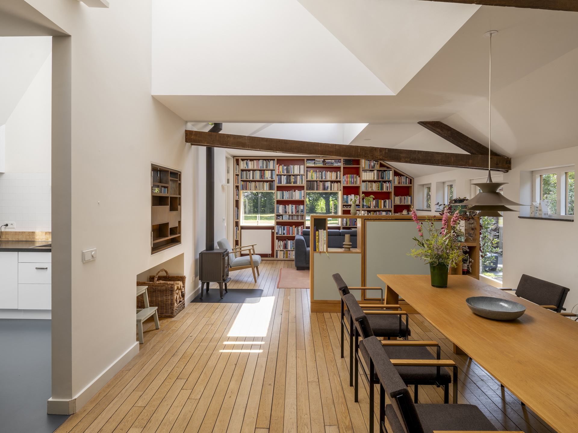 ), the conversion into a modern residence has been executed with exceptional attention to detail and natural light. The original character of the barn has been preserved, while it has simultaneously been transformed into a comfortable, contemporary home. Tapered light shafts connect the ground floor spaces with the roof, positioned in such a way that the existing structural framework and beams remain a visible and integral part of the house.