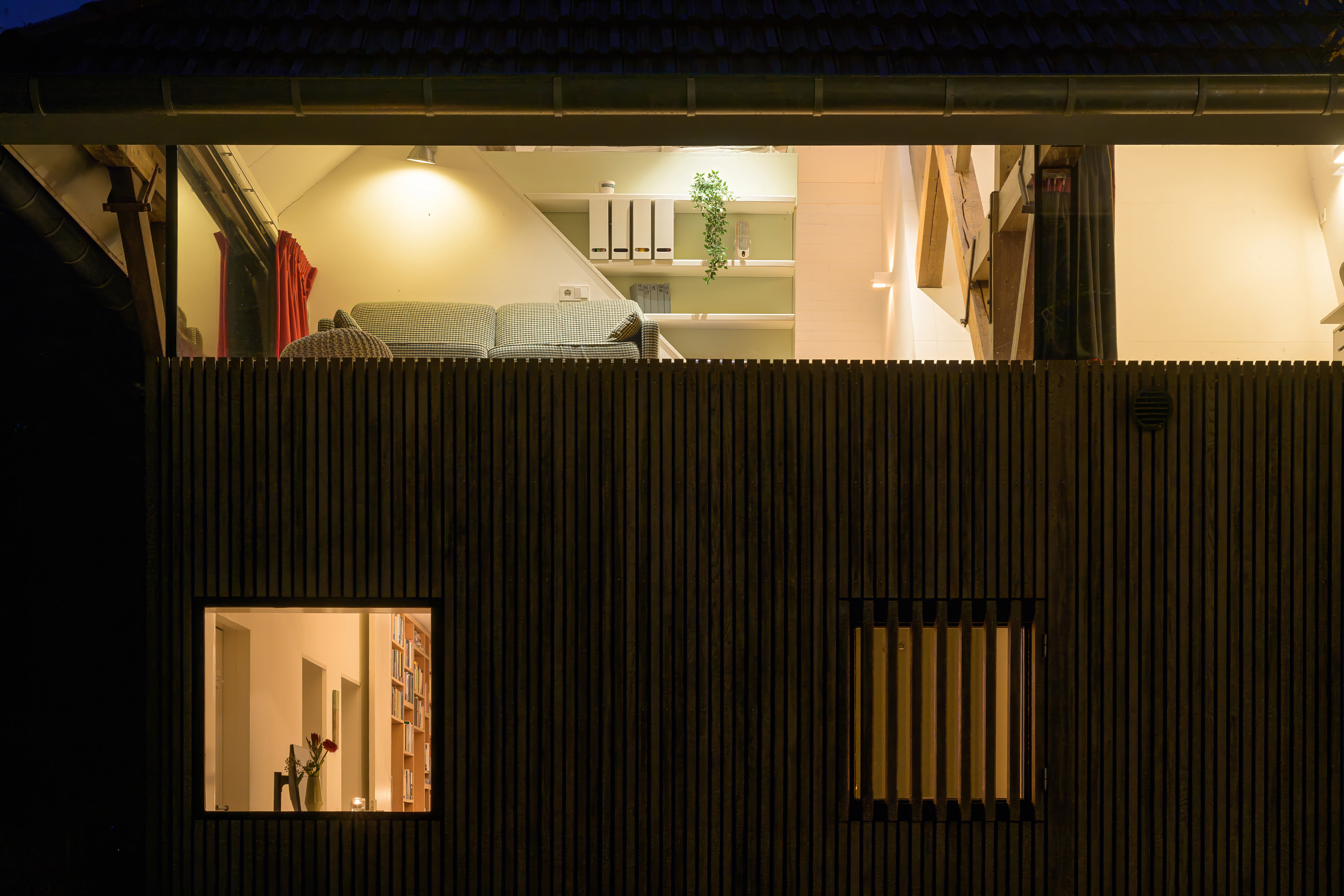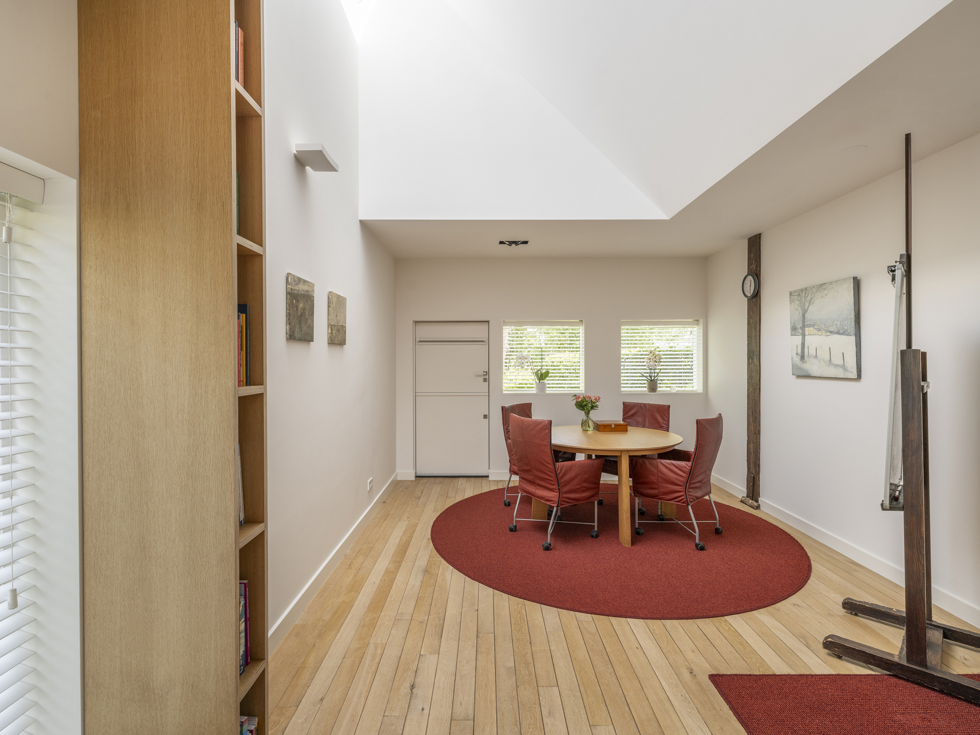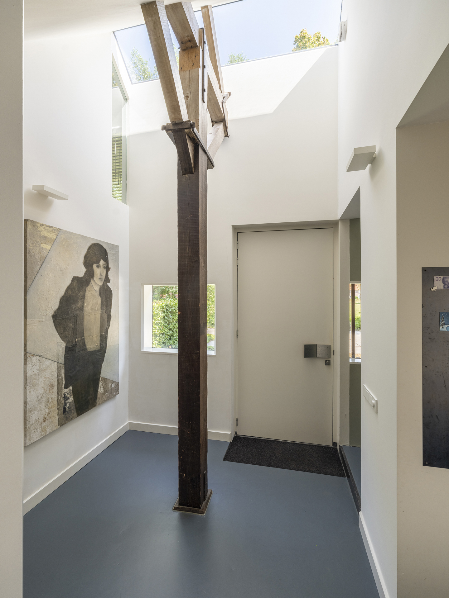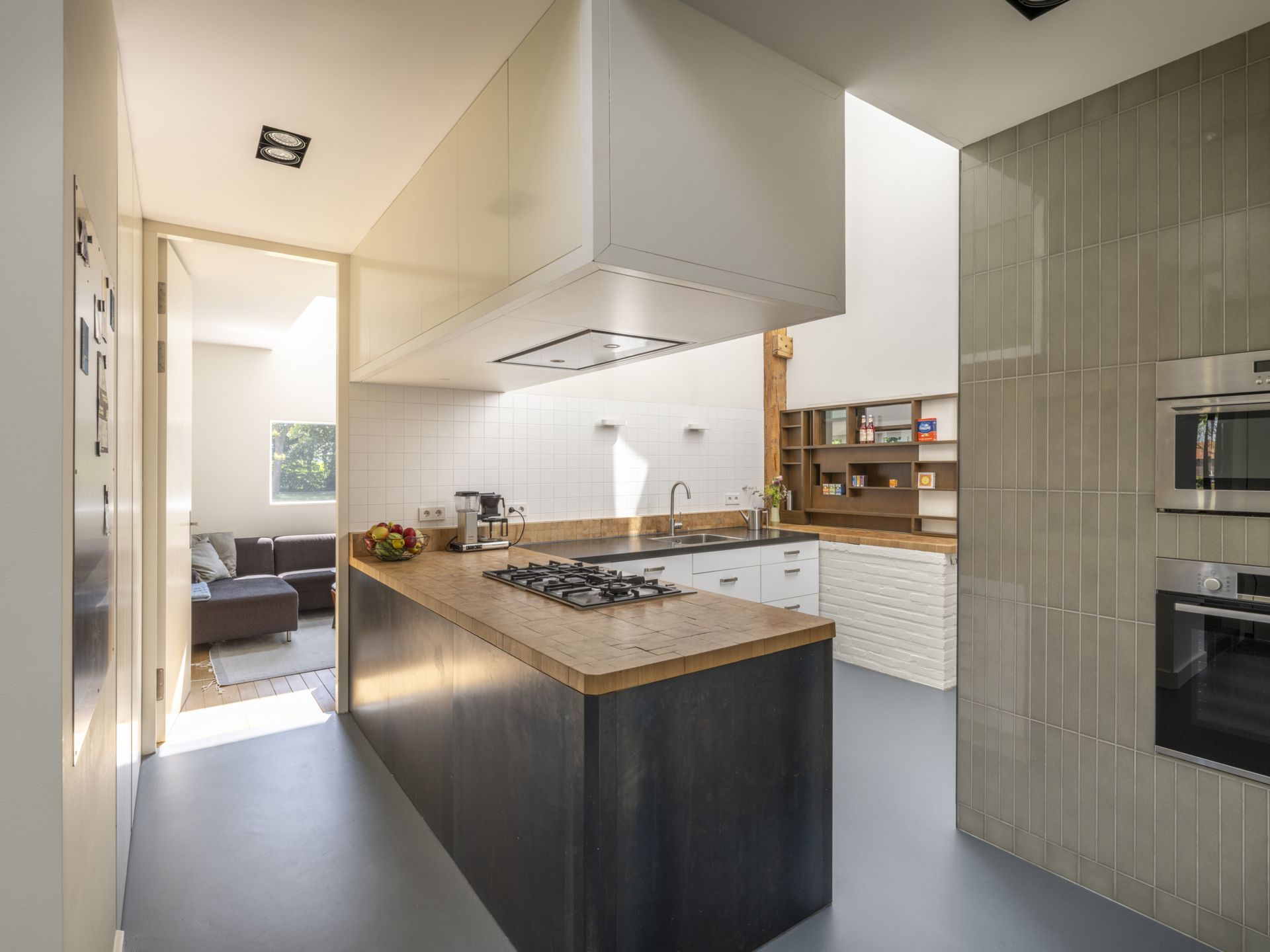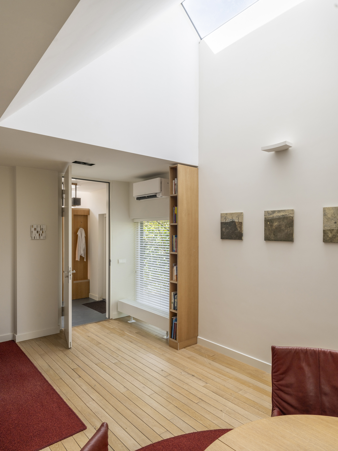), the conversion into a modern residence has been executed with exceptional attention to detail and natural light. The original character of the barn has been preserved, while it has simultaneously been transformed into a comfortable, contemporary home. Tapered light shafts connect the ground floor spaces with the roof, positioned in such a way that the existing structural framework and beams remain a visible and integral part of the house.