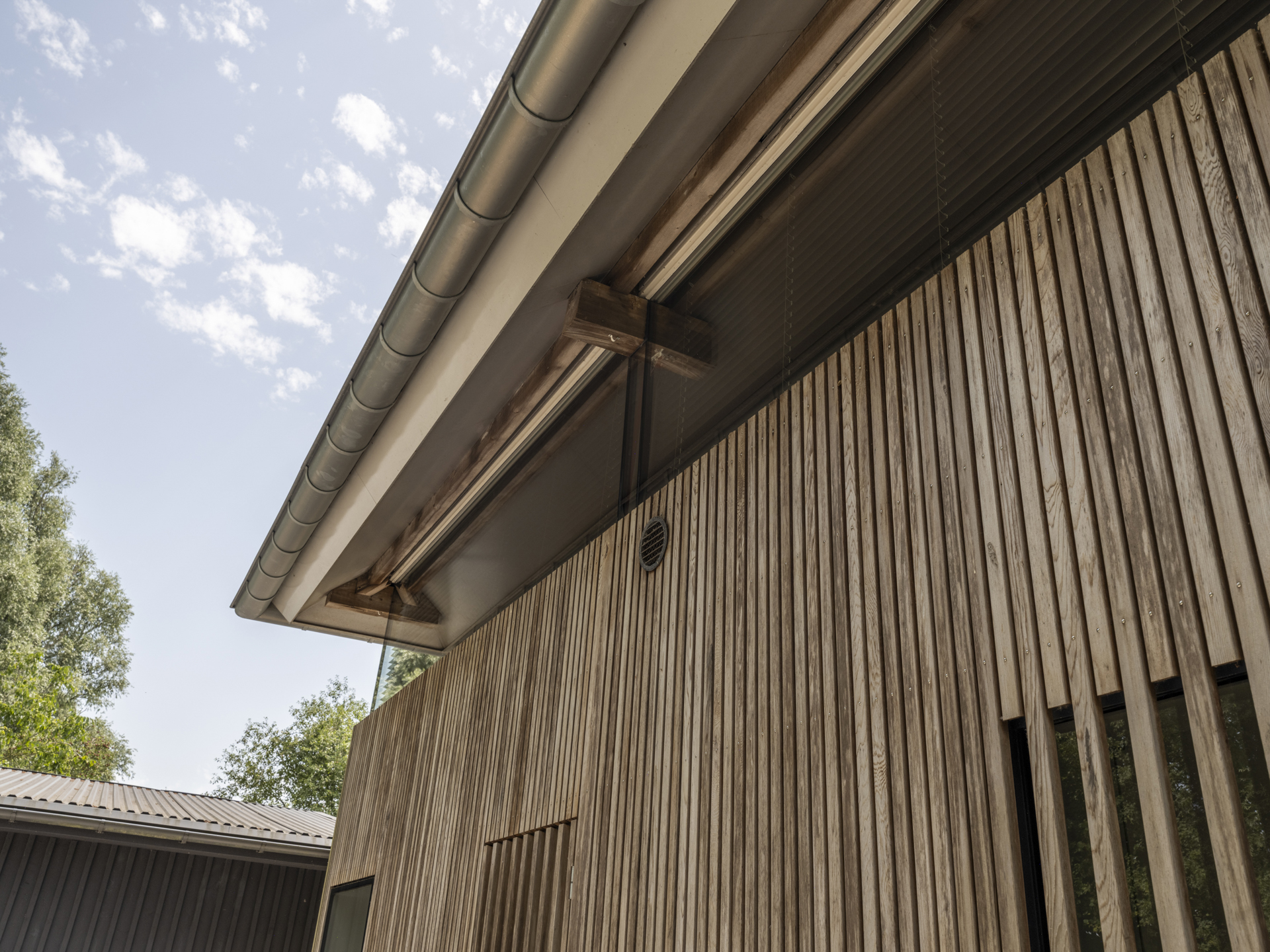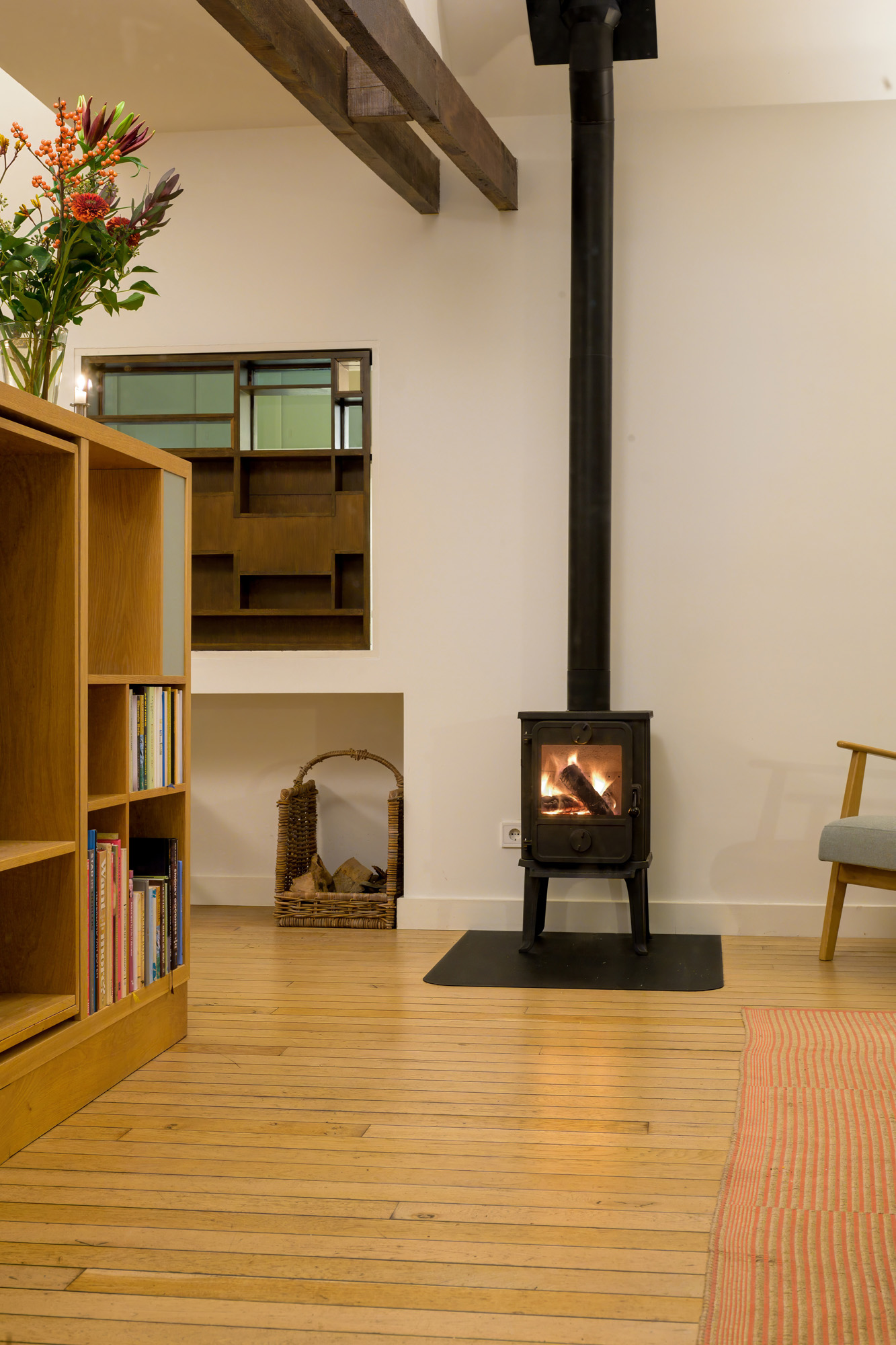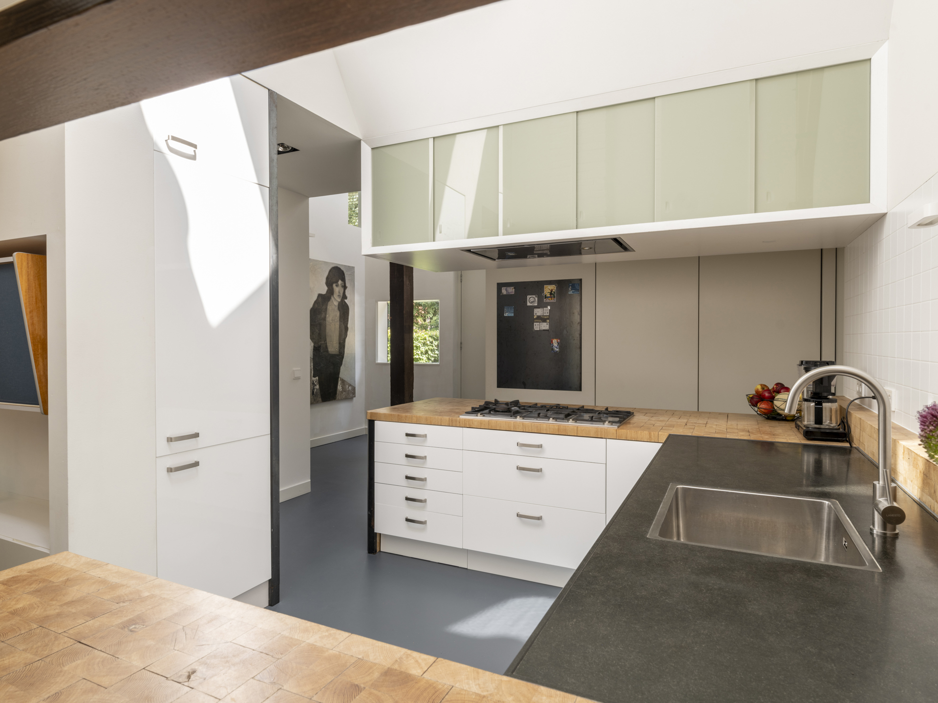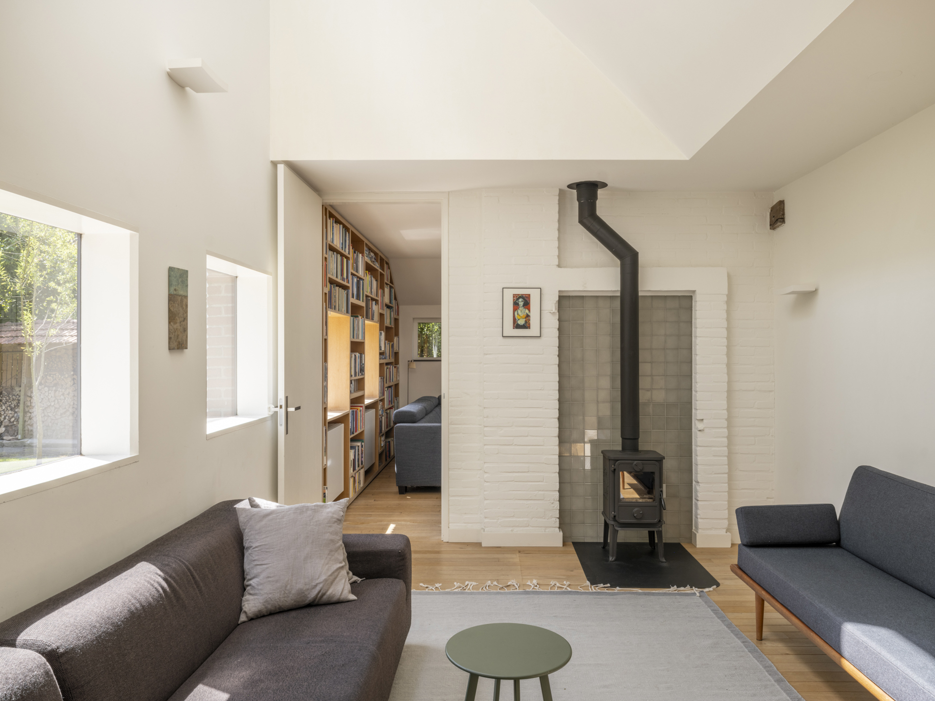 ), the conversion into a modern residence has been executed with exceptional attention to detail and natural light. The original character of the barn has been preserved, while it has simultaneously been transformed into a comfortable, contemporary home. Tapered light shafts connect the ground floor spaces with the roof, positioned in such a way that the existing structural framework and beams remain a visible and integral part of the house.
