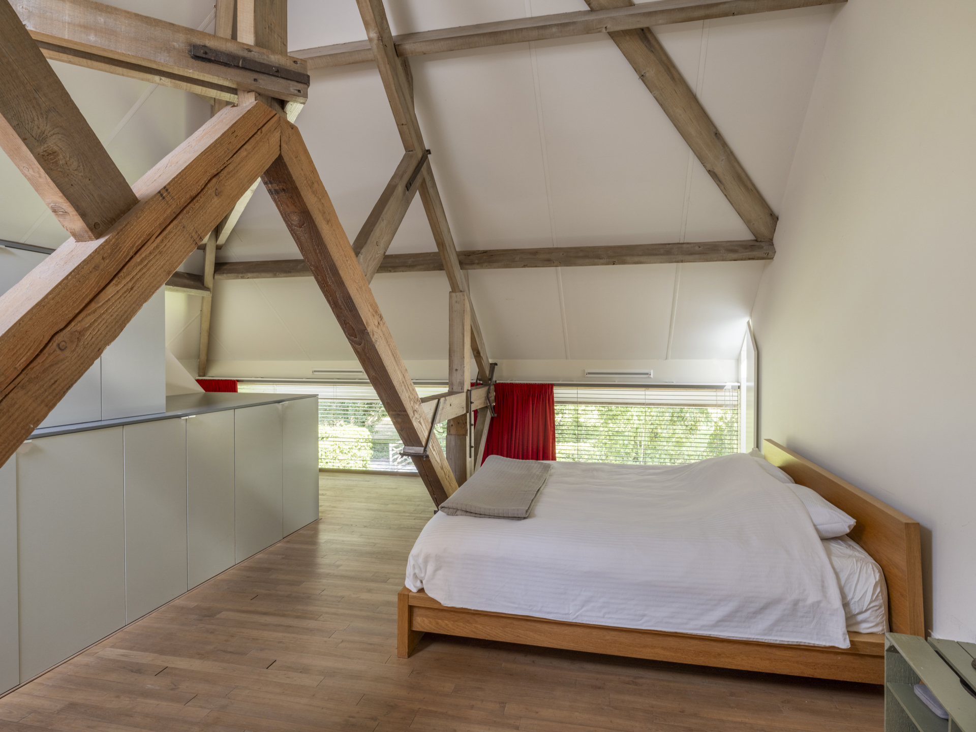 Currently in use as the master bedroom. Here, you sleep under the original roof beams. The room features custom-built wardrobes and air conditioning.