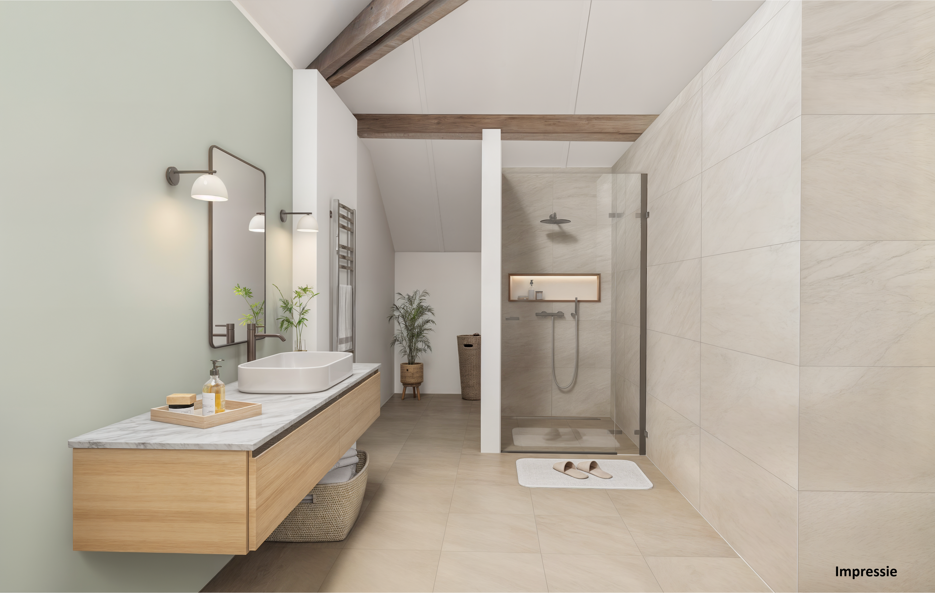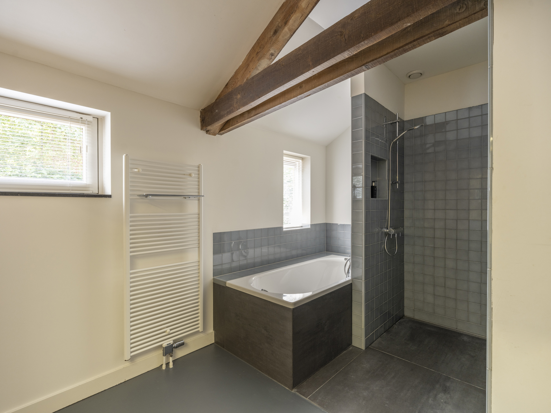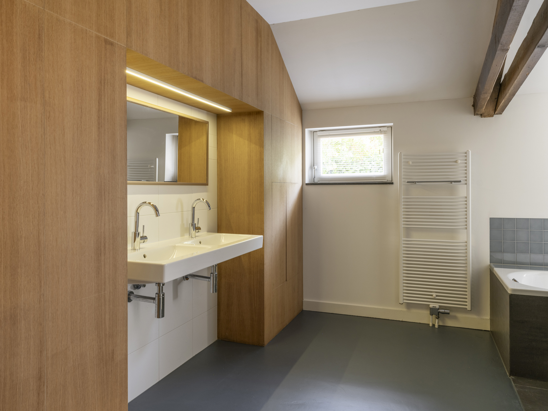 Spacious bathroom with bathtub, walk-in shower, thermostatic tap, custom-built wall cabinet, and double washbasin. Dimmed spotlights integrated into the old beams add extra atmosphere.