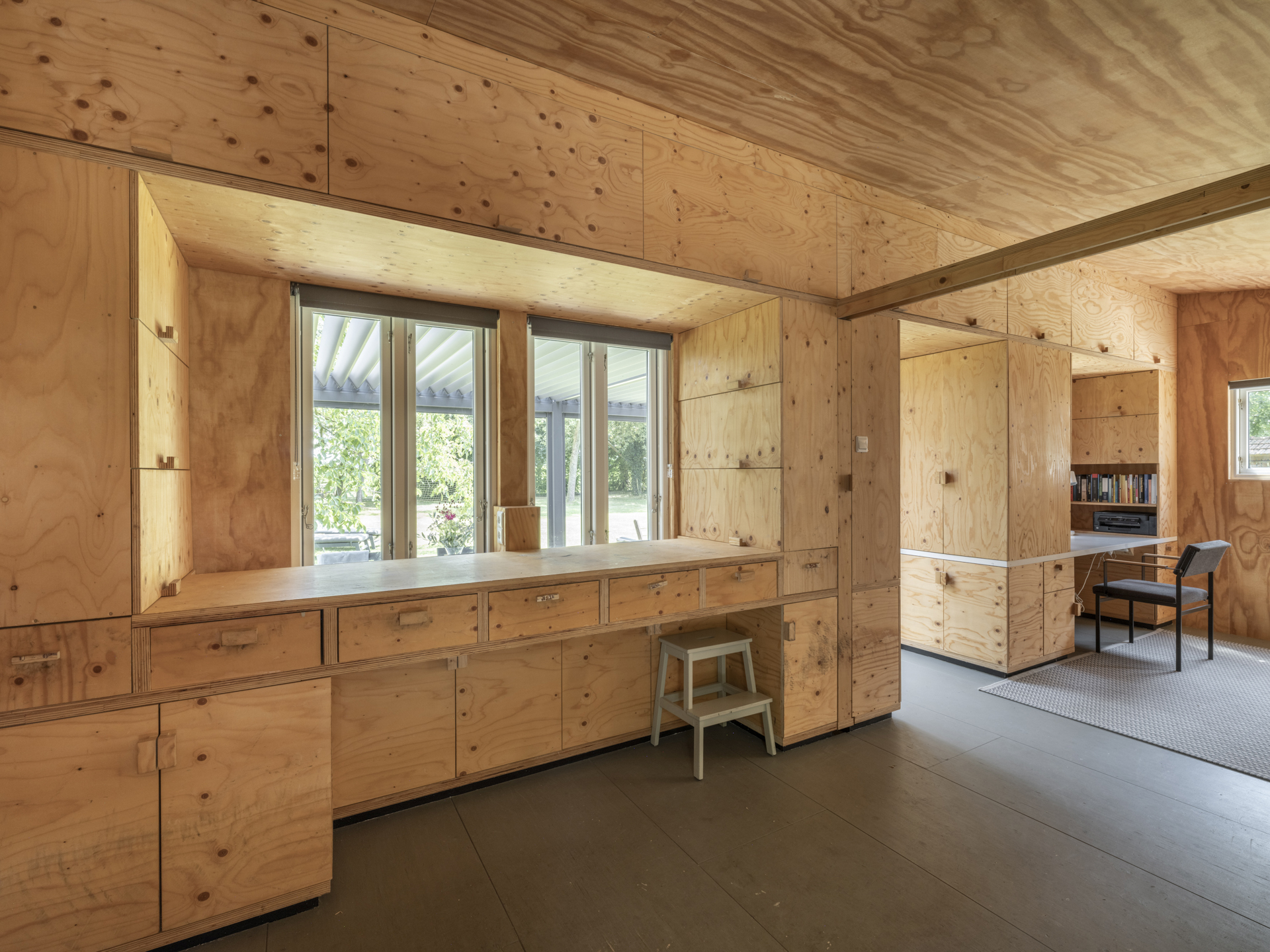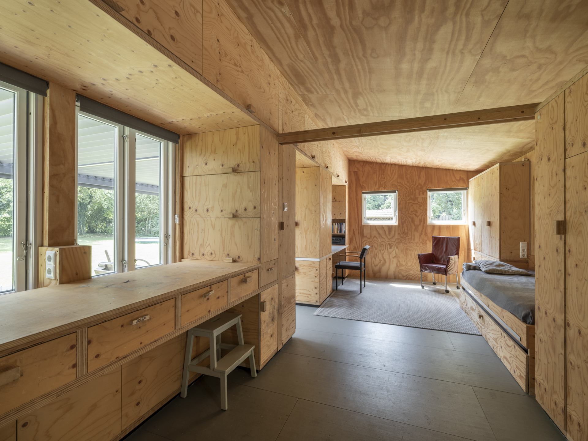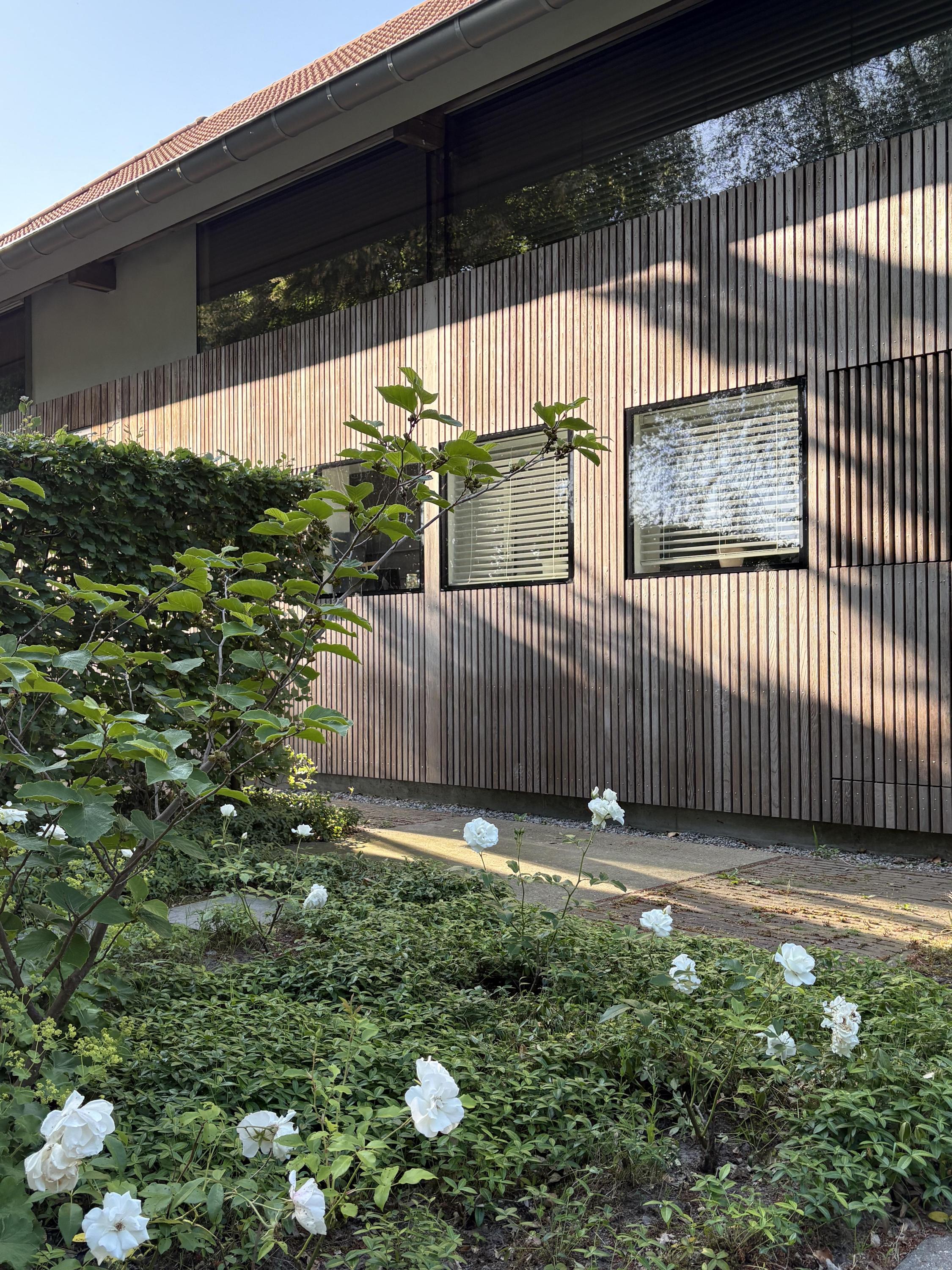 The multifunctional wooden outbuilding, built in Scandinavian style and well insulated (including triple glazing), currently serves as a workshop, hobby space, and guest accommodation, but can easily be converted into a care residence (e.g. for elderly parents).