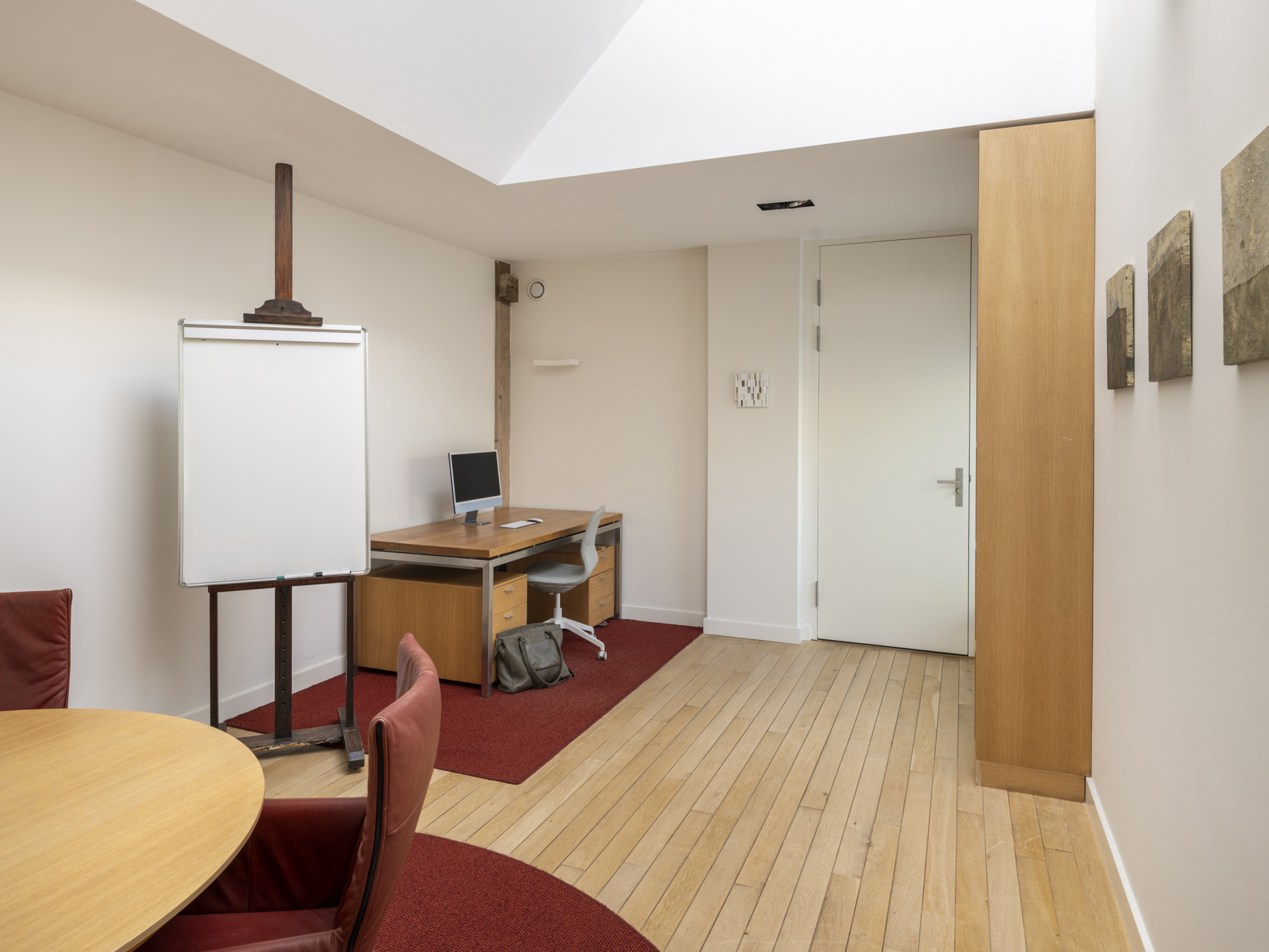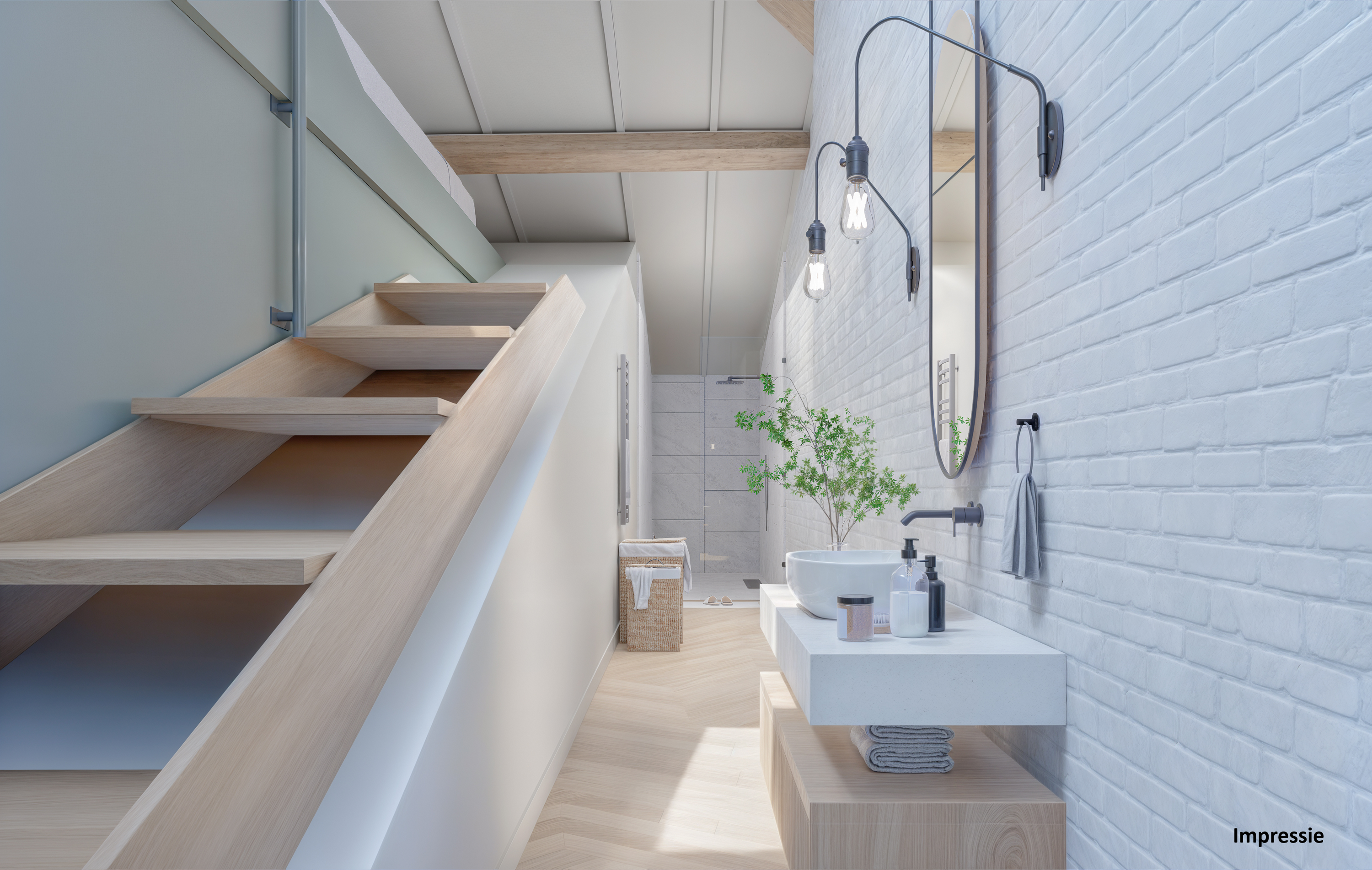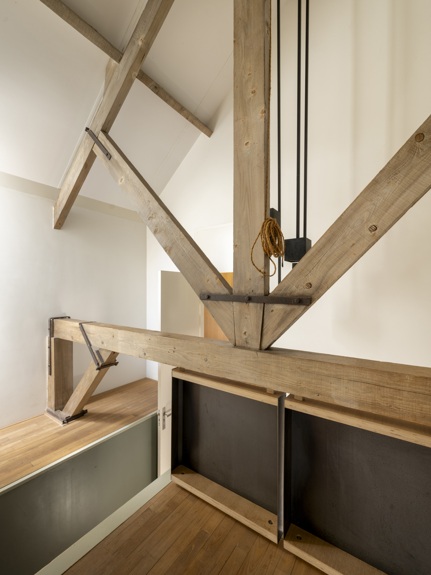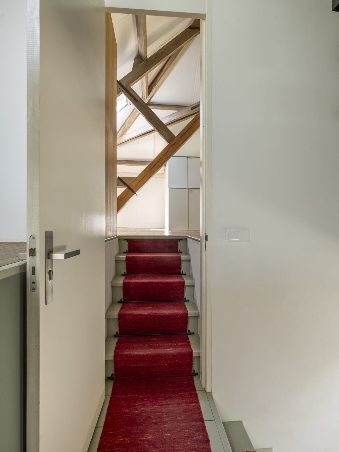 Modern staircase situated beneath the original roof structure of the house. Leads to: