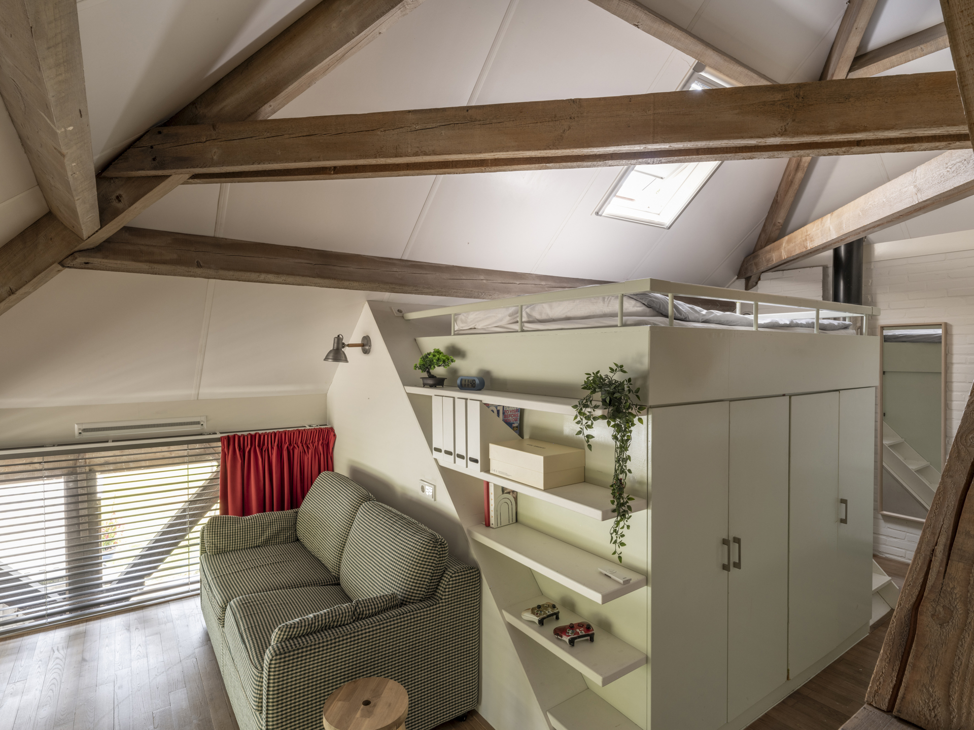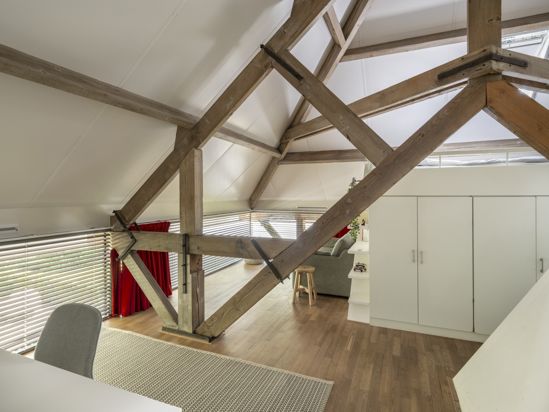 Bedroom with a loft bed built into the peak of the roof structure, with storage space underneath. Both upstairs bedrooms offer the potential for an additional (second or third) bathroom.