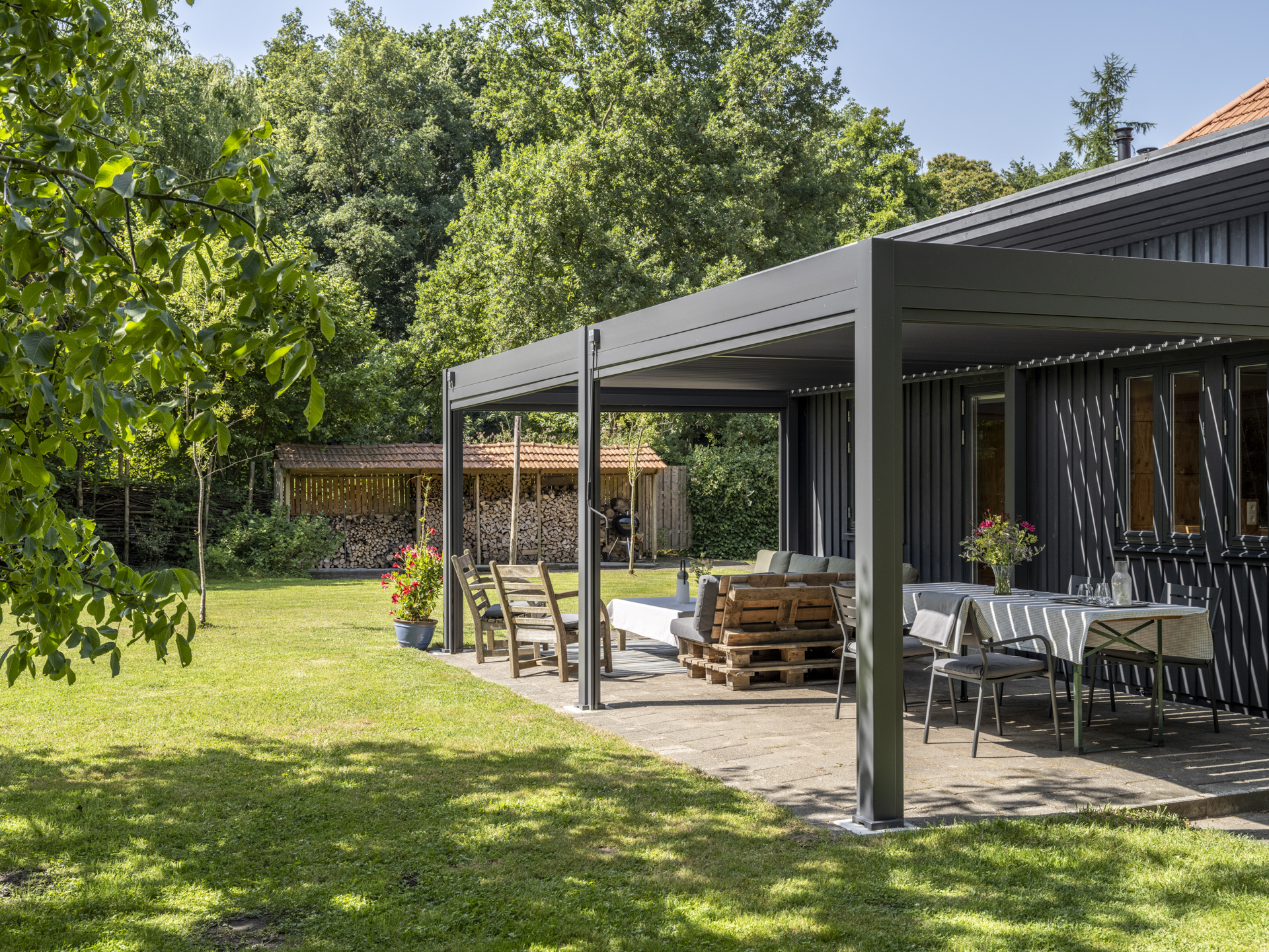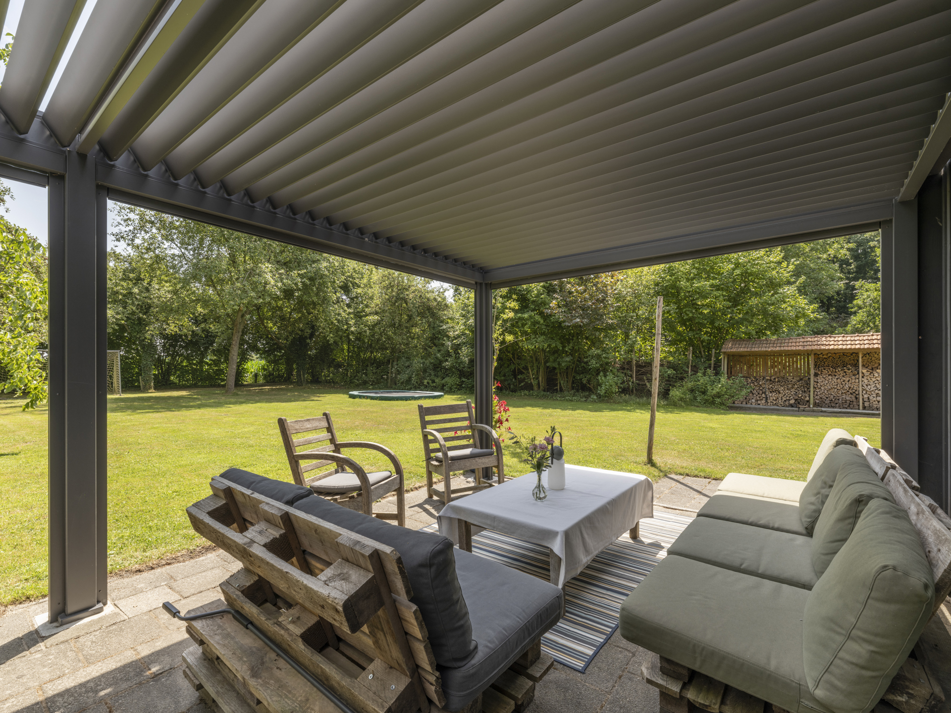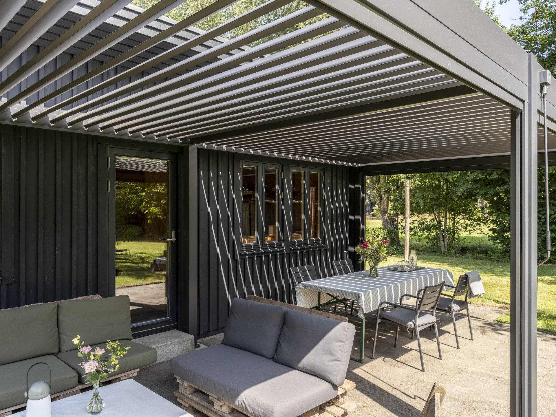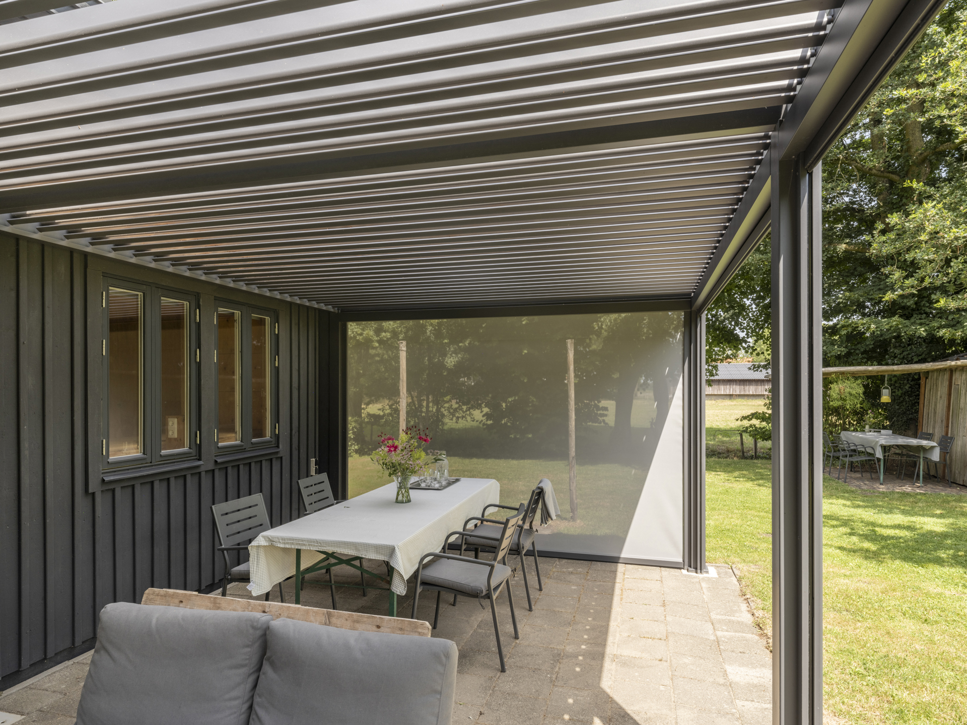 In 2025, a high-quality covered terrace was added to this outbuilding — a wonderful extension of the garden living space. The roof has an adjustable louver system that can be opened and closed for both sunlight and rain protection. It also includes retractable wind screens.