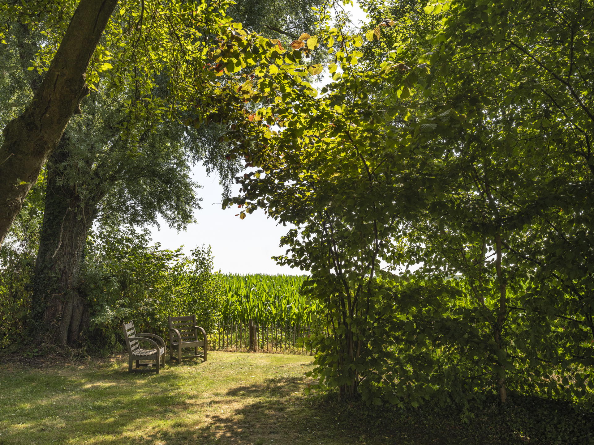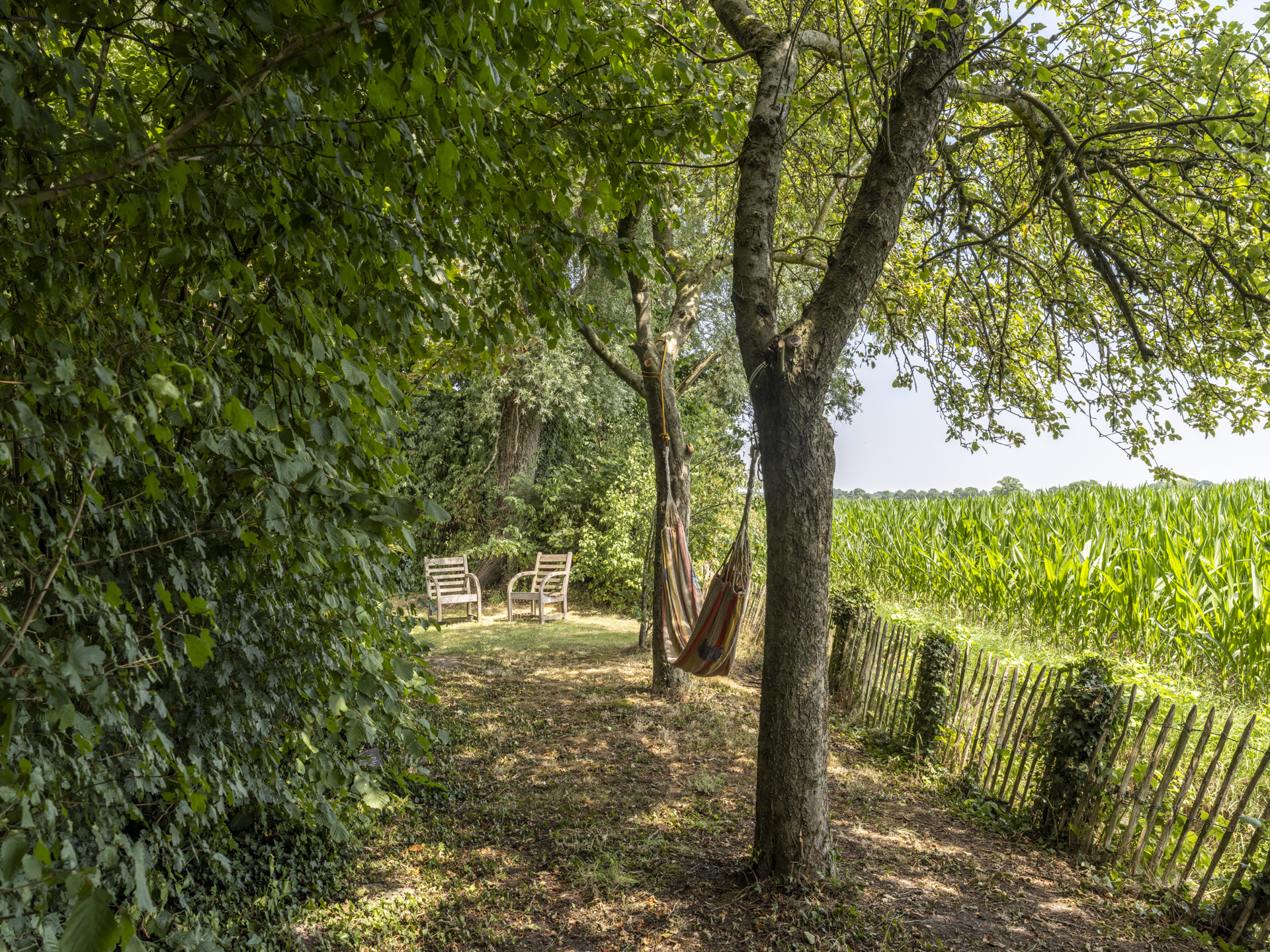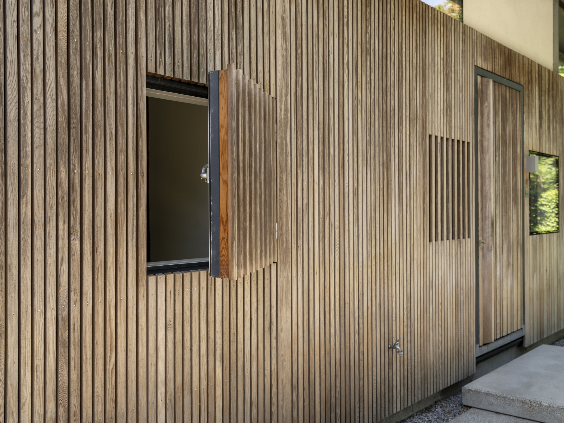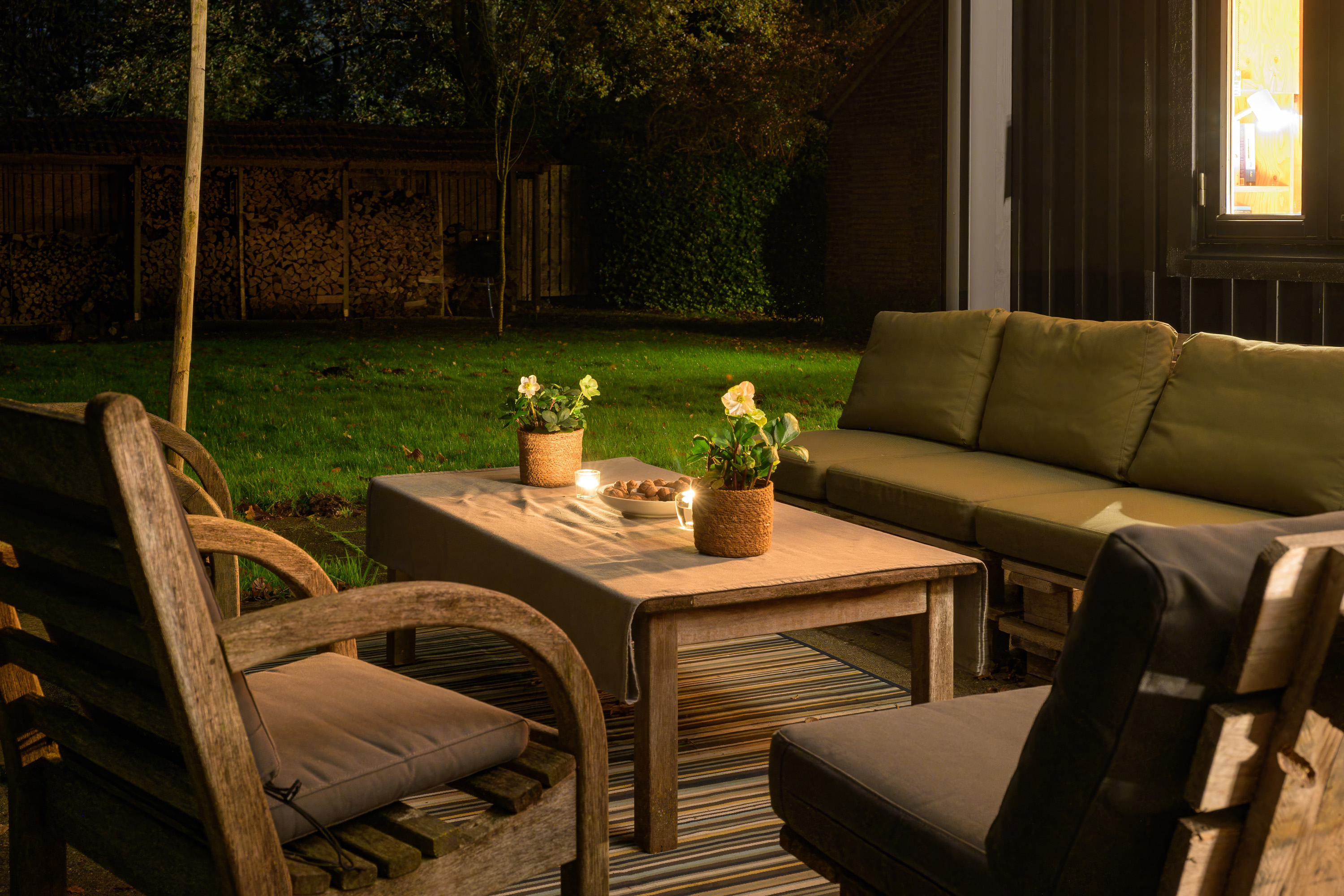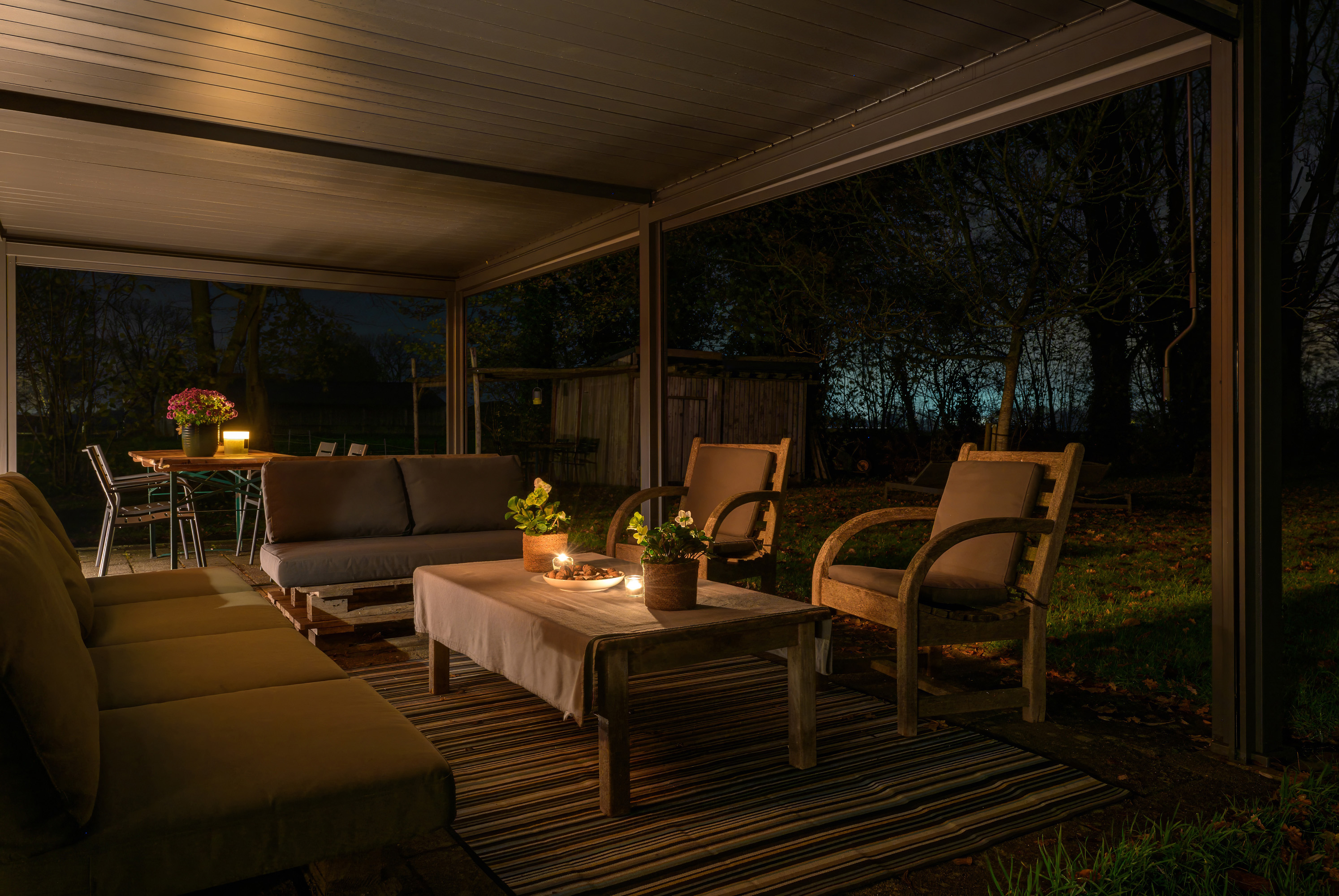 In 2025, a high-quality covered terrace was added to this outbuilding — a wonderful extension of the garden living space. The roof has an adjustable louver system that can be opened and closed for both sunlight and rain protection. It also includes retractable wind screens.