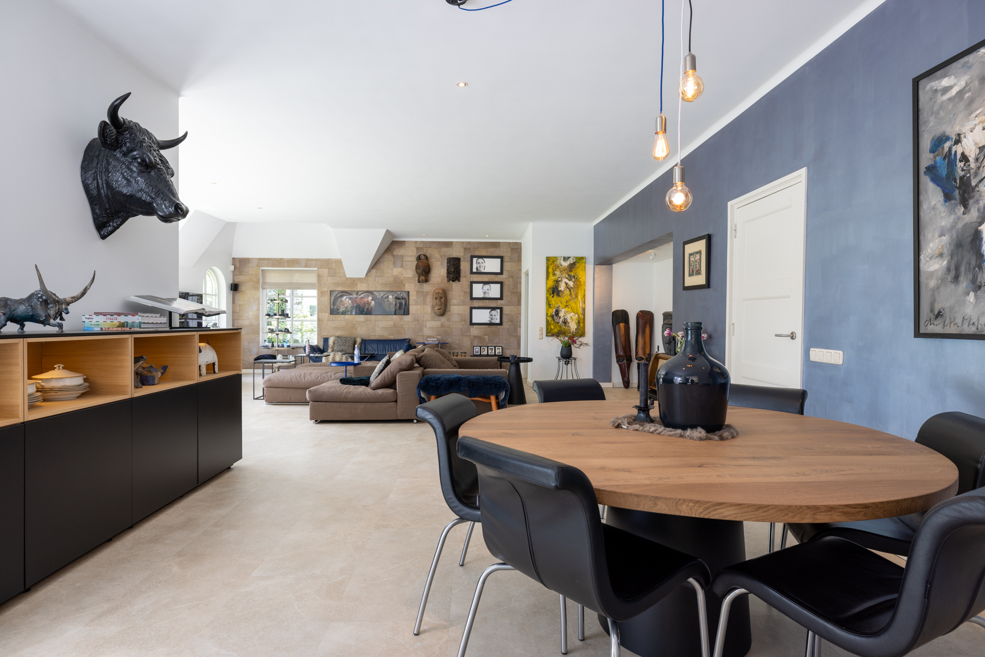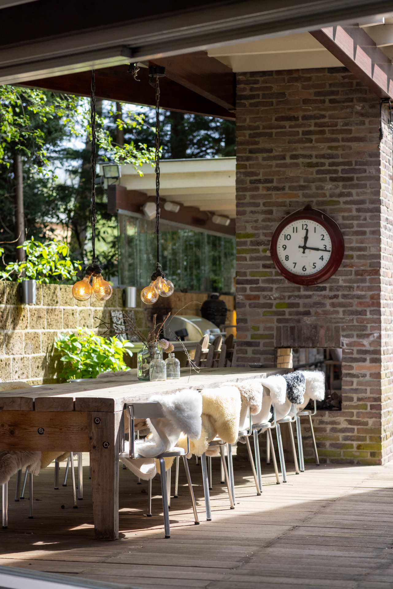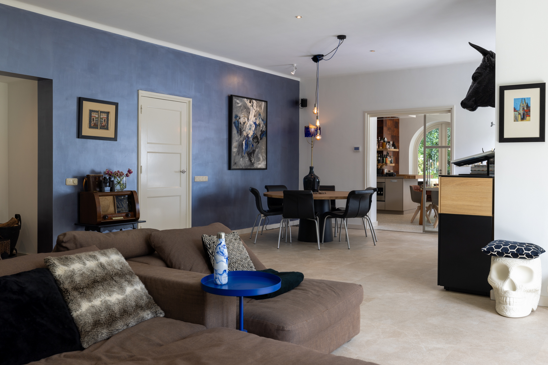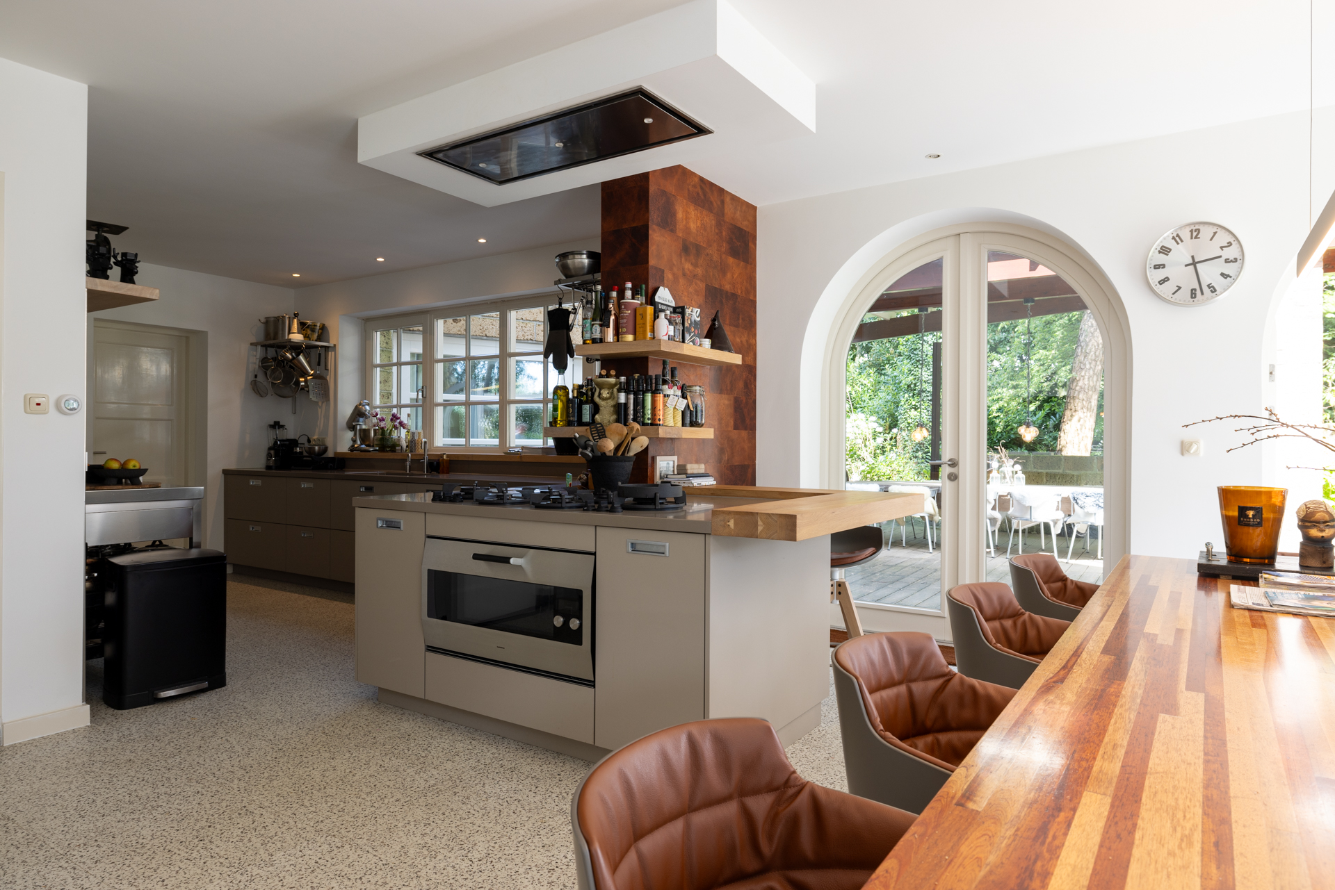 The kitchen has a gas fireplace, spacious dining area and double doors to the garden. This gives a nice connection with the garden and the outdoor kitchen. Here you bring the outside in.