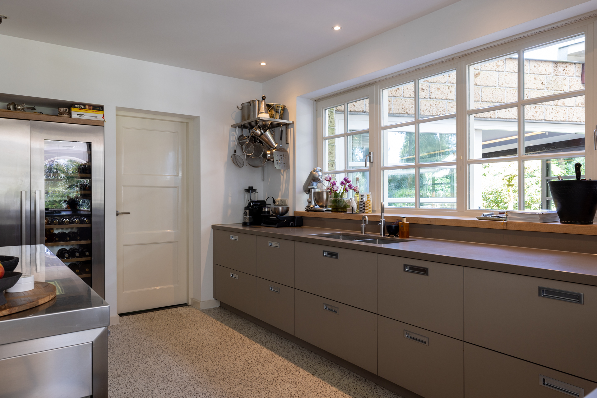 Great spacious kitchen (approx. 9.15 x 5.30 m, 2021), custom made by Antonissen interior construction and equipped with all desirable appliances such as a built-in coffee machine, combi oven, convection oven, 6-burner gas appliance (Pitt Cooking), composite counter top and a beautiful steel worktop with sturdy rear wall, extractor hood, double sink, integrated waste bin, Quooker and a large stainless steel refrigerator with separate Liebherr wine climate cabinet. Most built-in appliances are of high quality from the exclusive Gaggenau brand.