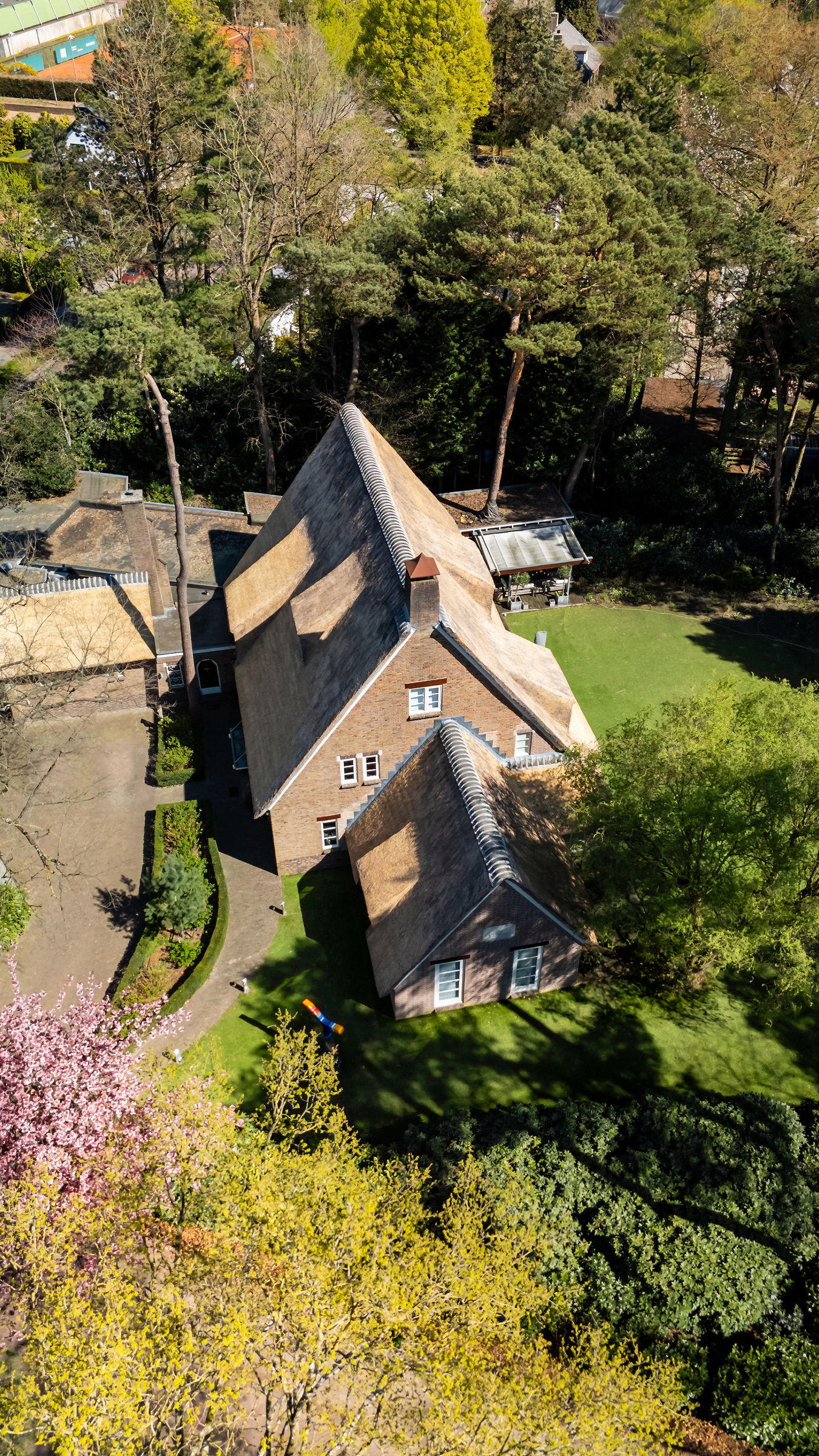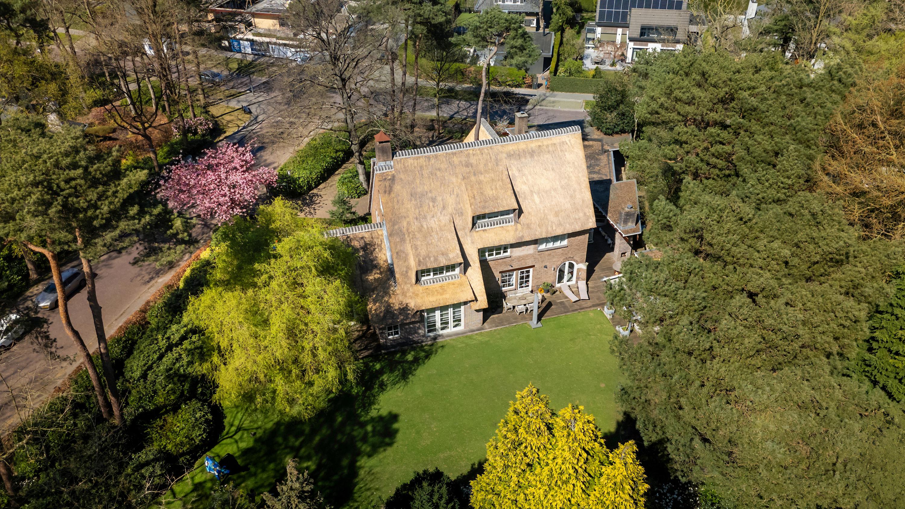 Very unique, perfectly maintained, thatched country house with, among other things, a luxurious wellness area with indoor swimming pool and fantastic outdoor space, situated at a prominent point in the middle of the popular and stately residential area "Ruitersbos" with its beautiful trees and within walking distance of the Mastbos.