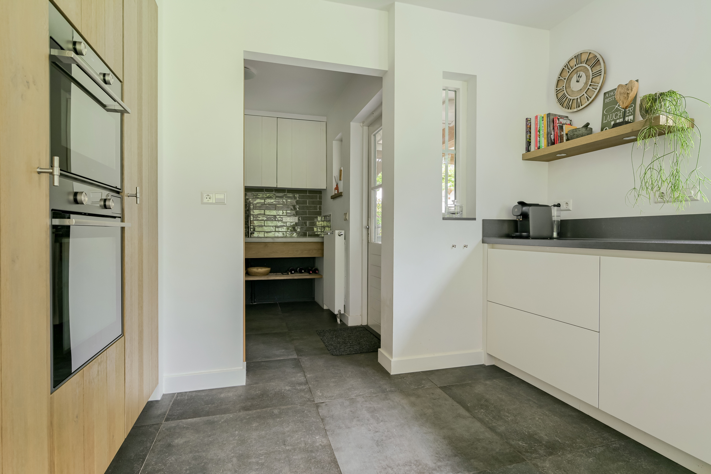 The hallway, front room, kitchen, and utility room are finished with large anthracite-colored tiled floors.
