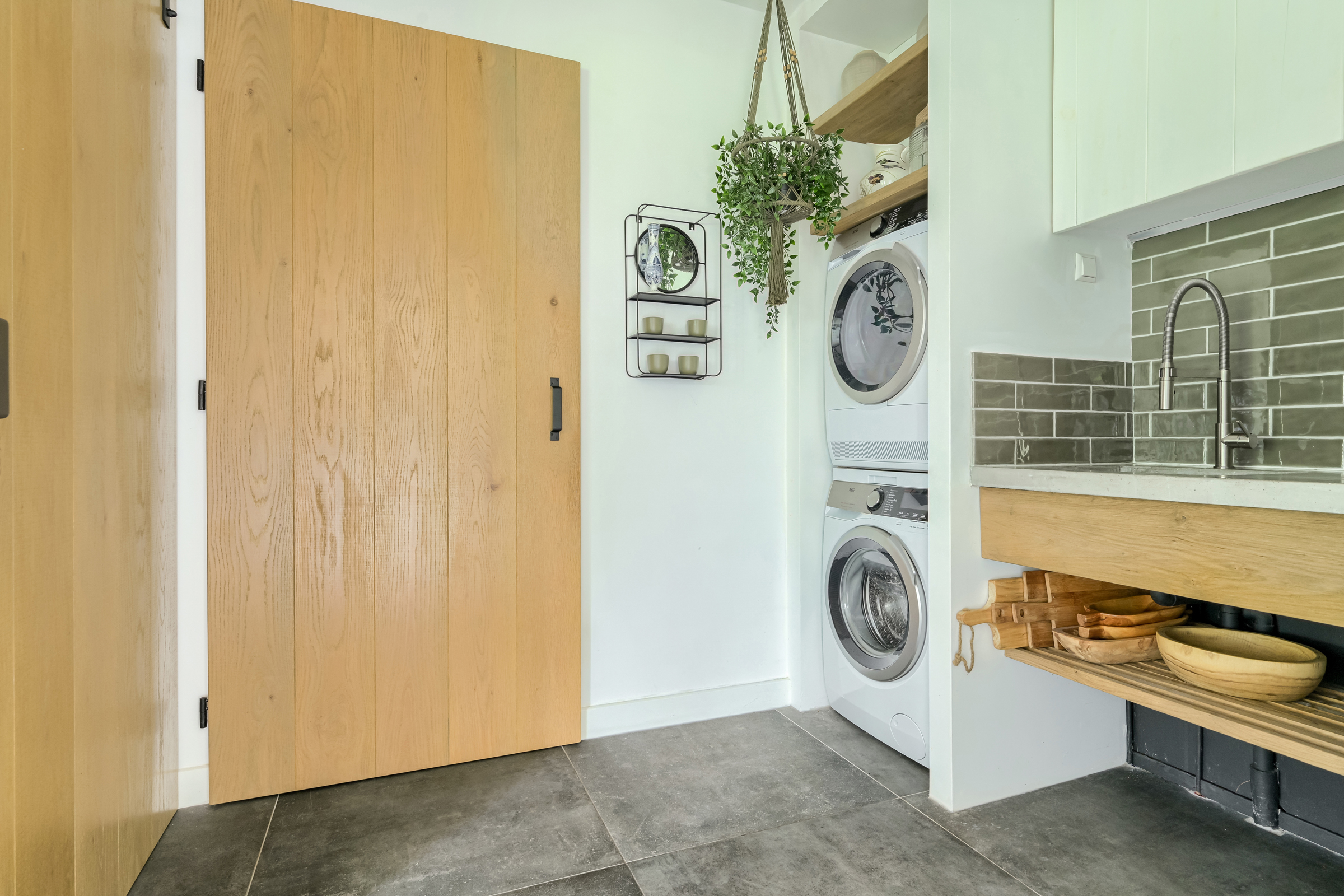 Utility room with a modern kitchenette including a sink. This room also contains the connections for laundry appliances, as well as a separate under-stairs storage area.