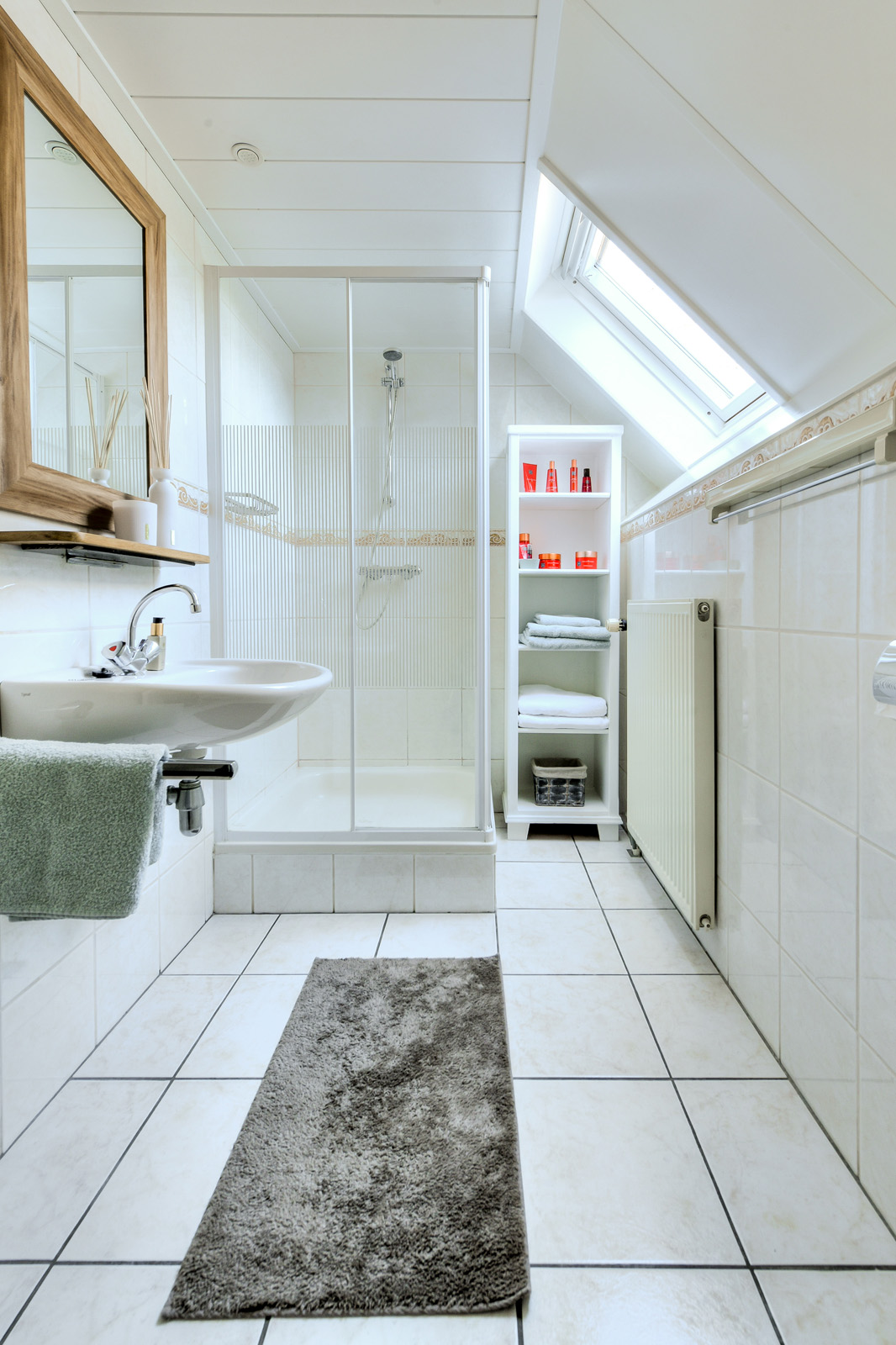 Bathroom equipped with a shower cabin with thermostatic faucet, a washbasin, and a wall-hung toilet with a built-in cistern. Daylight enters through a Velux roof window.
