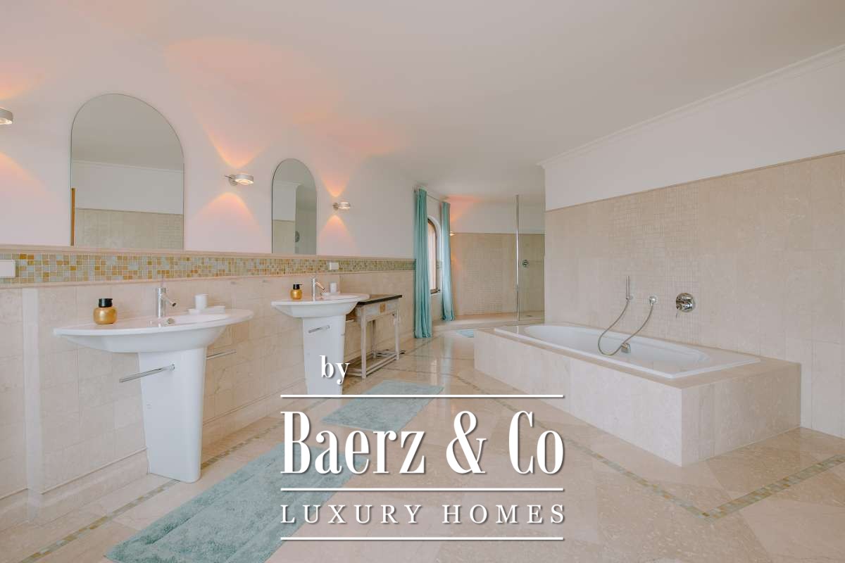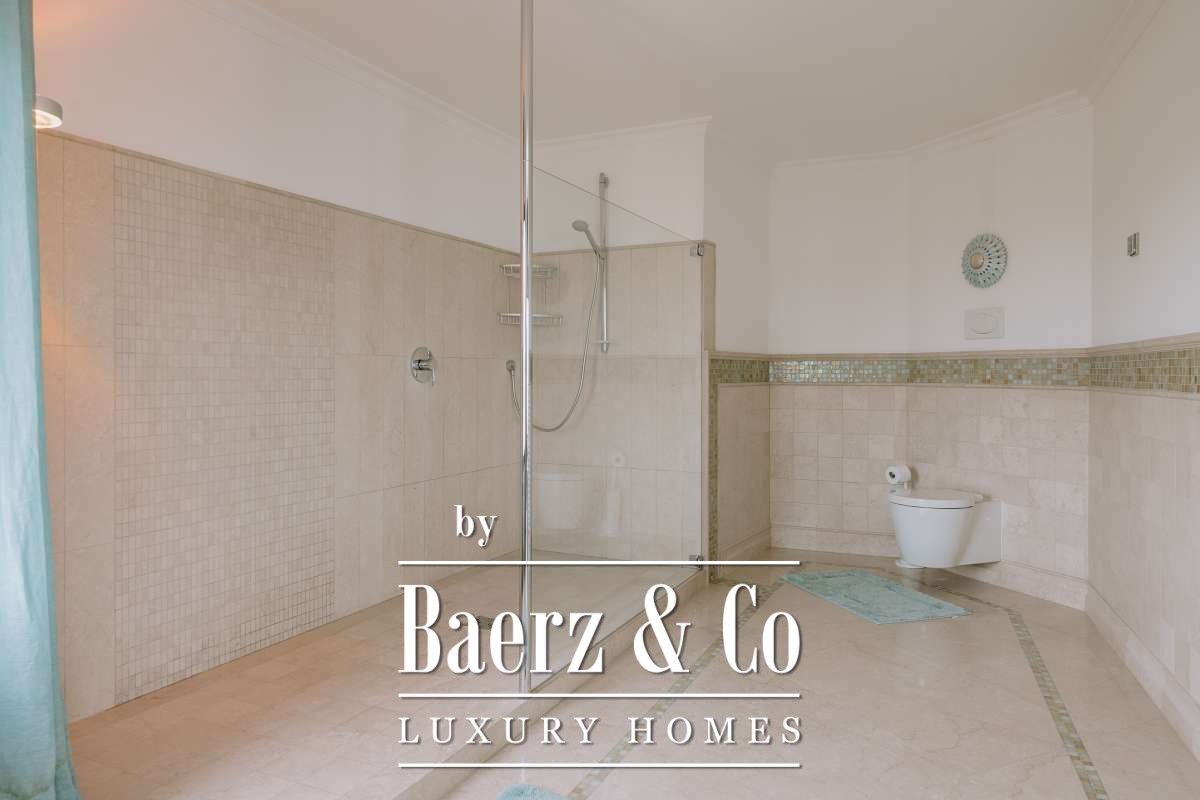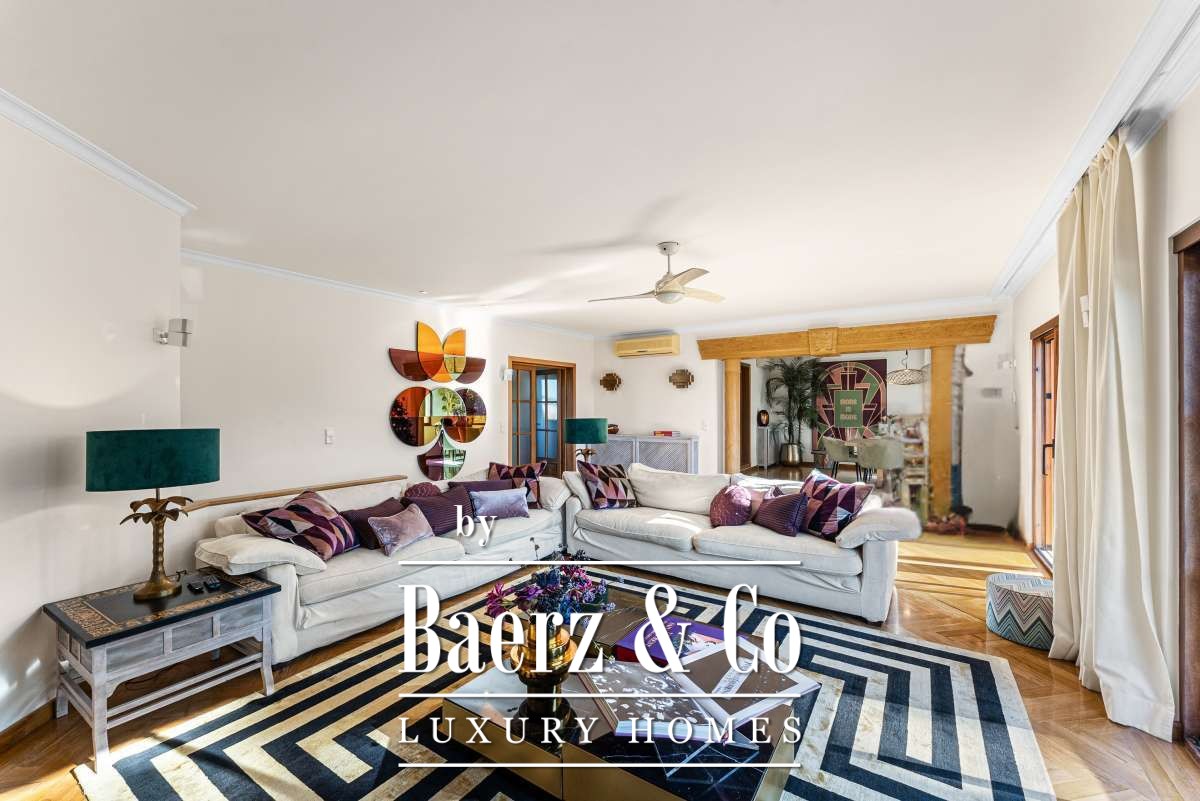 Interiors revolve around generosity of scale and light, with voluminous ceilings, expansive windows and thoughtfully arranged open-plan living spaces. The fitted kitchen provides a social hub for dinners with a view, while the master suite has its own terrace, spacious walk-in closet and a bathroom featuring a walk-in shower and freestanding bath. Additional amenities include a dedicated gym, playroom and separate laundry space.