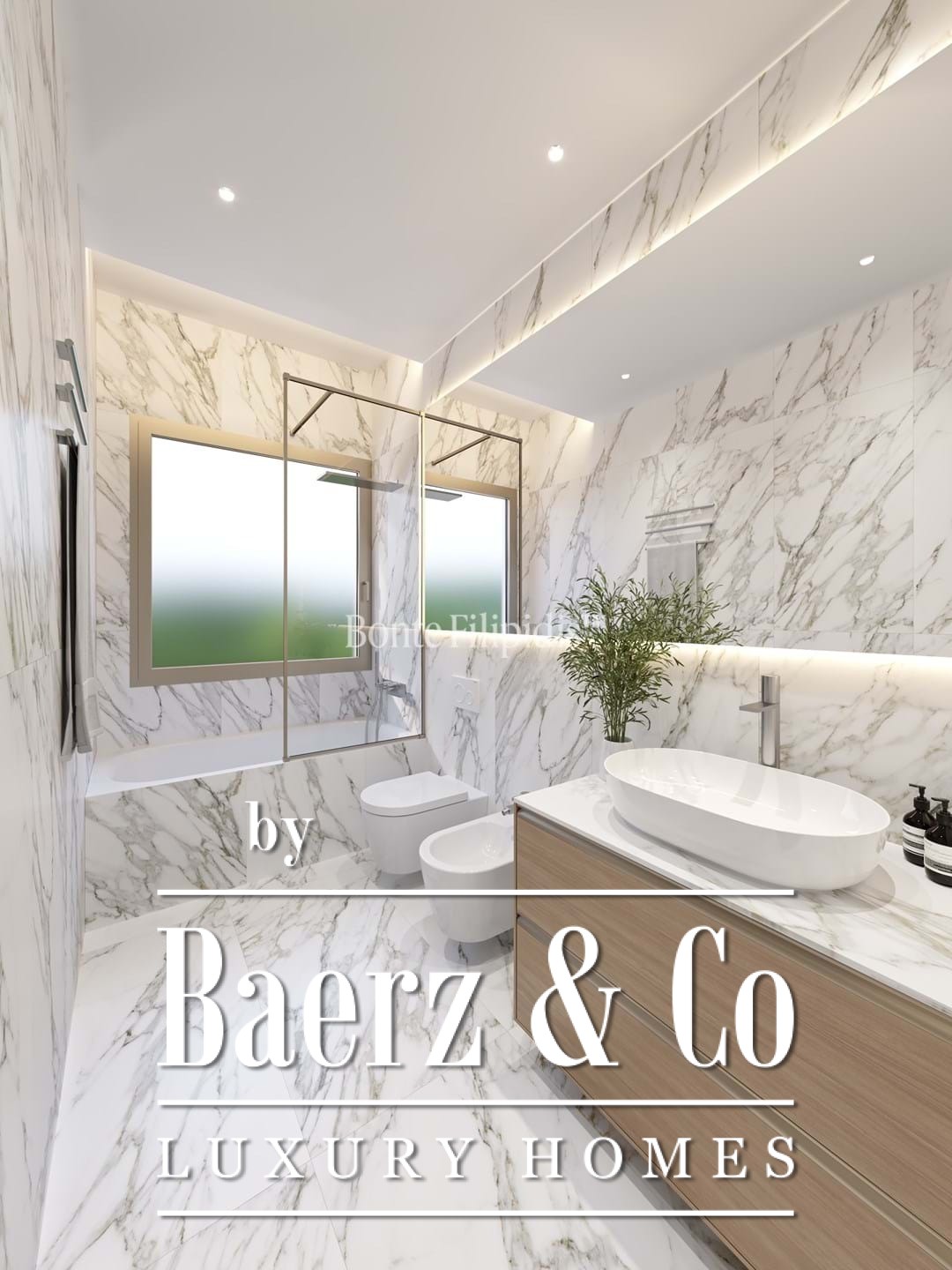 Natural materials define the interiors: herringbone wood flooring throughout the living spaces and bedrooms, custom carpentry, and an interplay of marble in kitchen and bathrooms. Communal areas extend this atmosphere with marble, wood and integrated lighting.