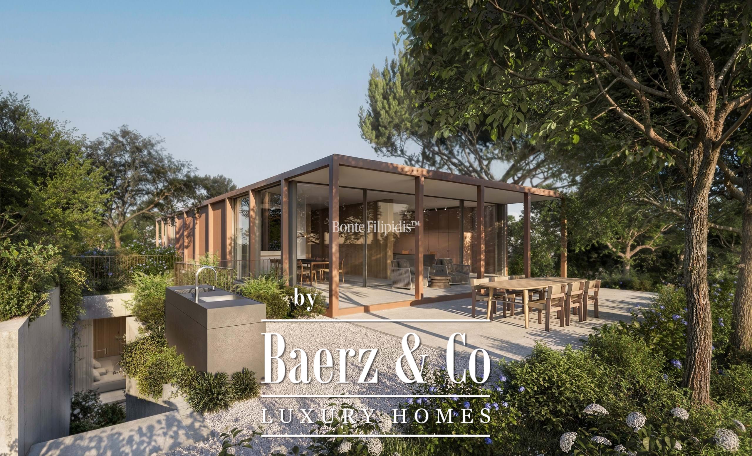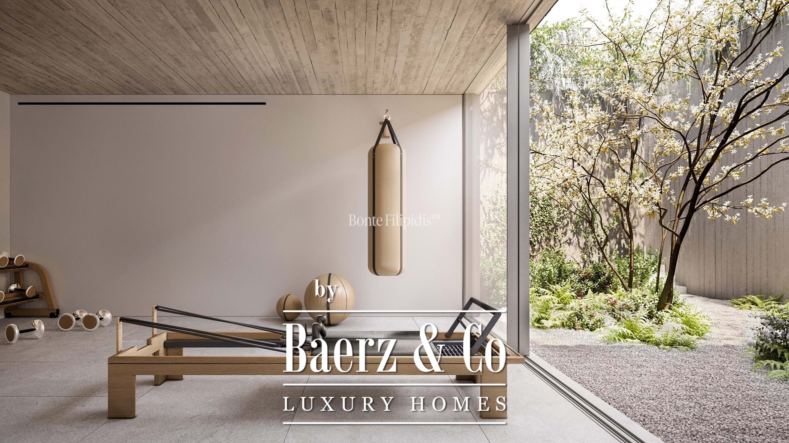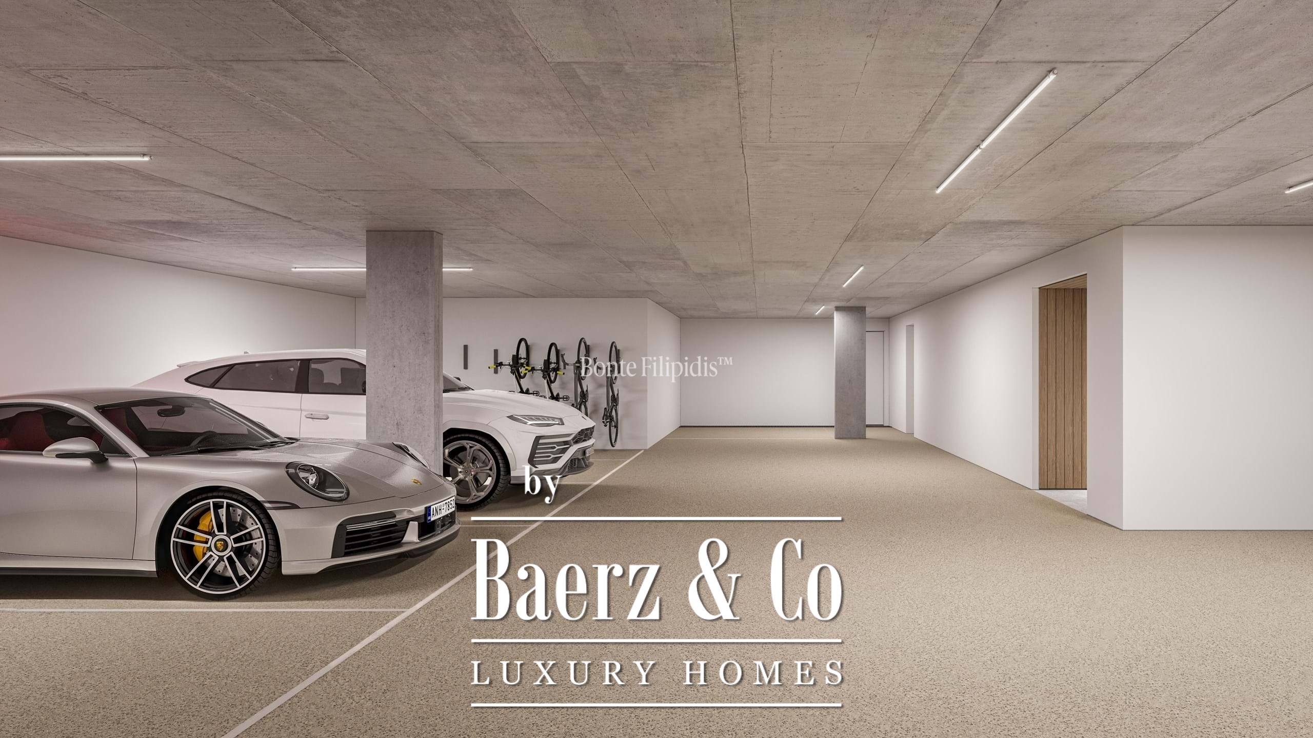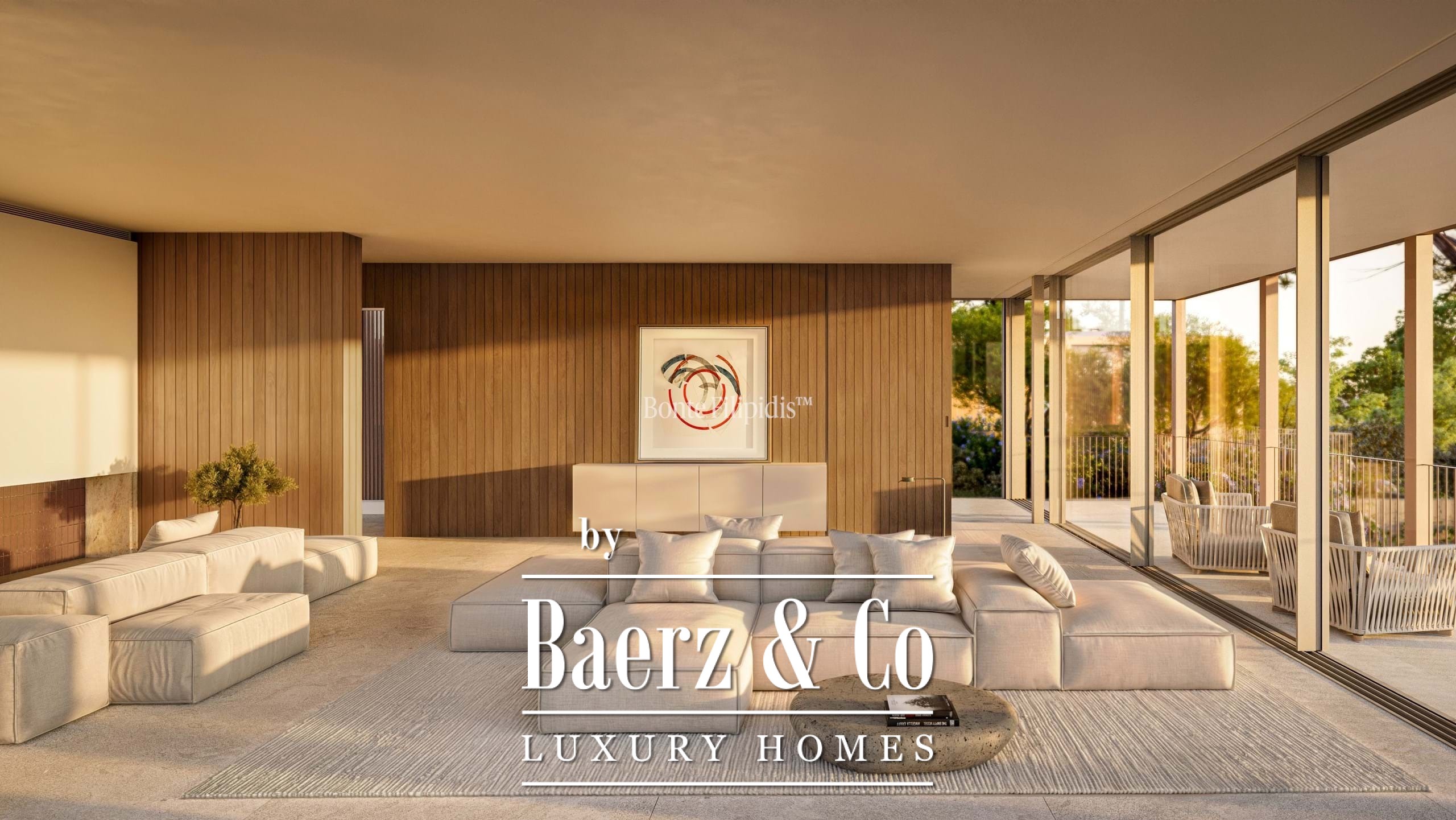Light pours into the villa’s three levels through floor-to-ceiling alu window frames, ensuring thermal and acoustic comfort alongside a calm, understated aesthetic. Four bedrooms and five bathrooms provide privacy and space, including a primary suite of 52 m² with walk-in closet and direct garden-pool access. Living and entertaining areas flow outward to 727 m² of landscaped terraces, shaded patios, and a heated 63 m² pool, creating a fluid dialogue between indoors and out.