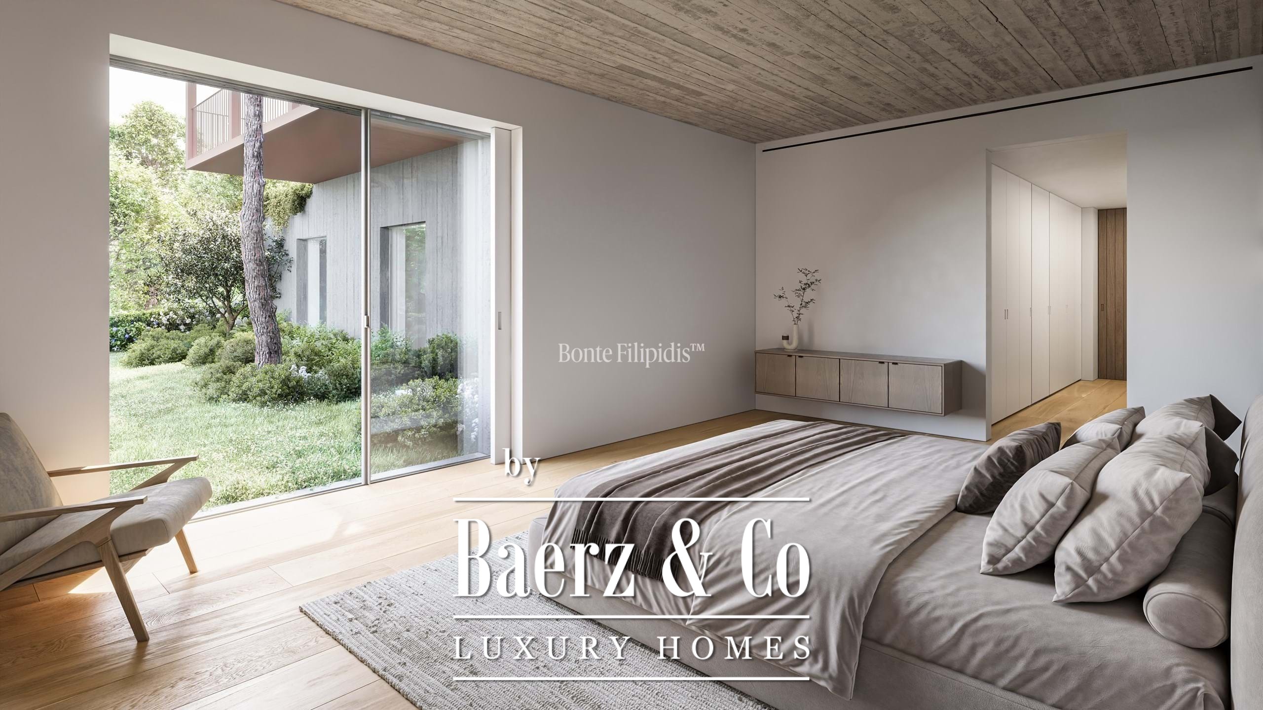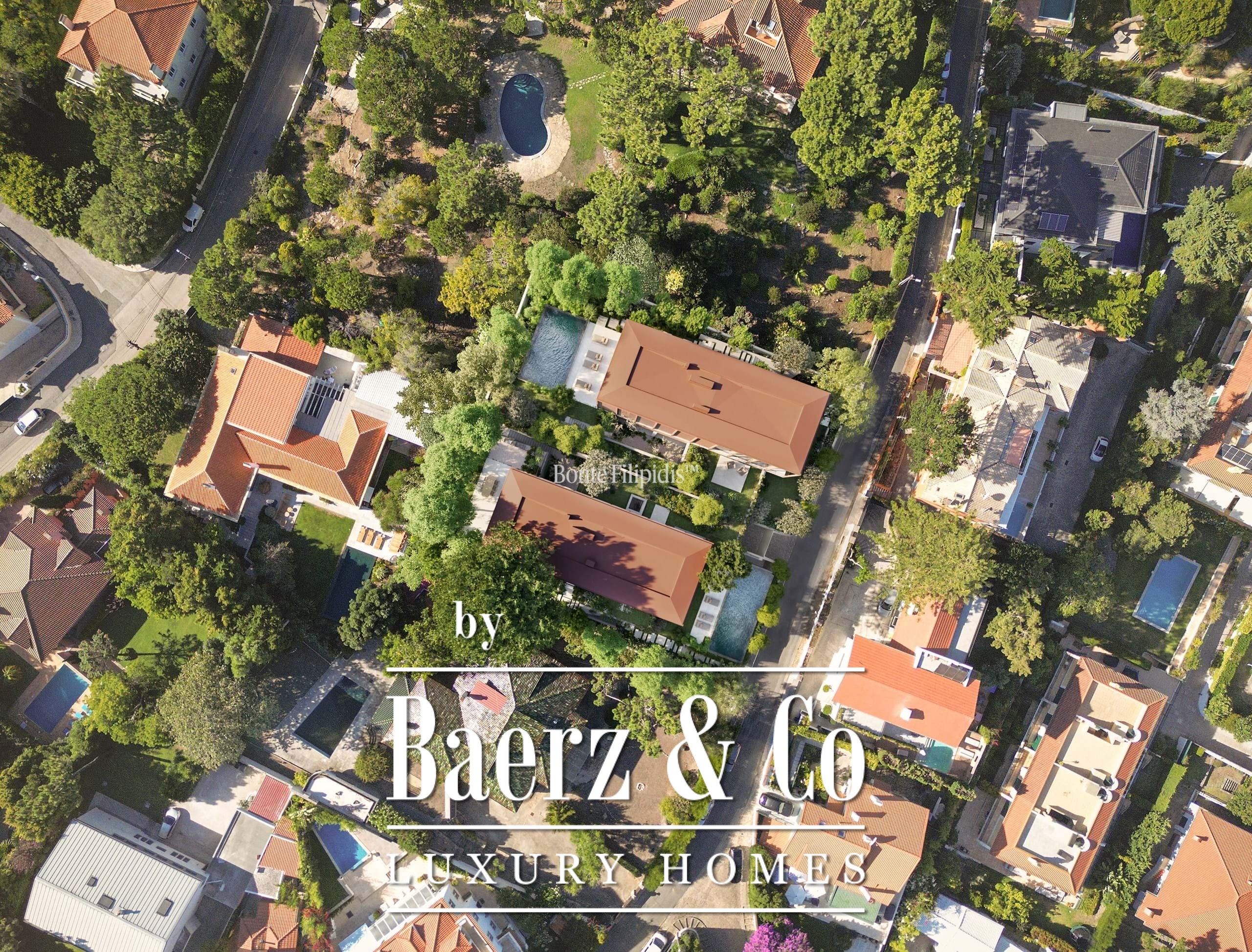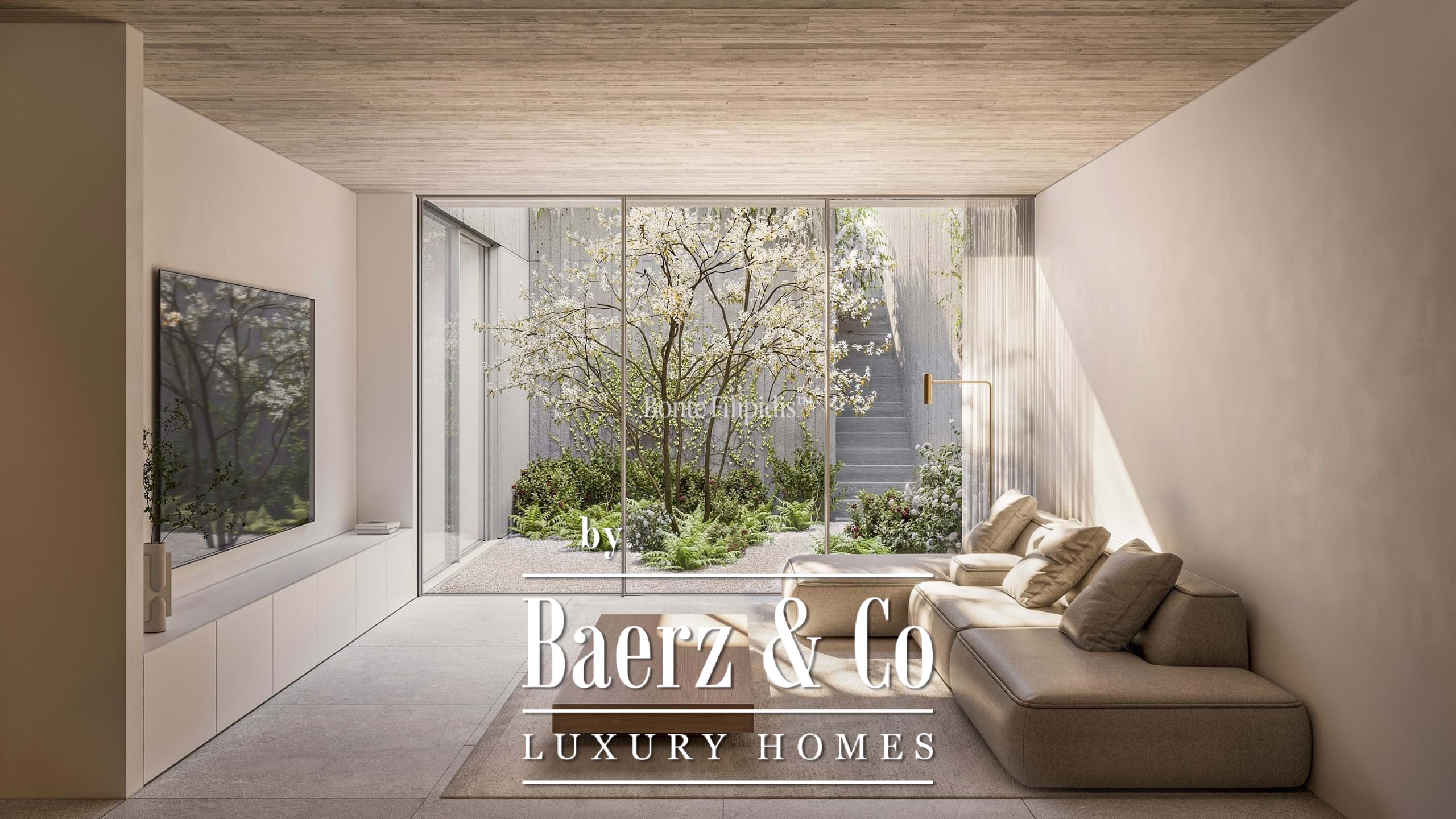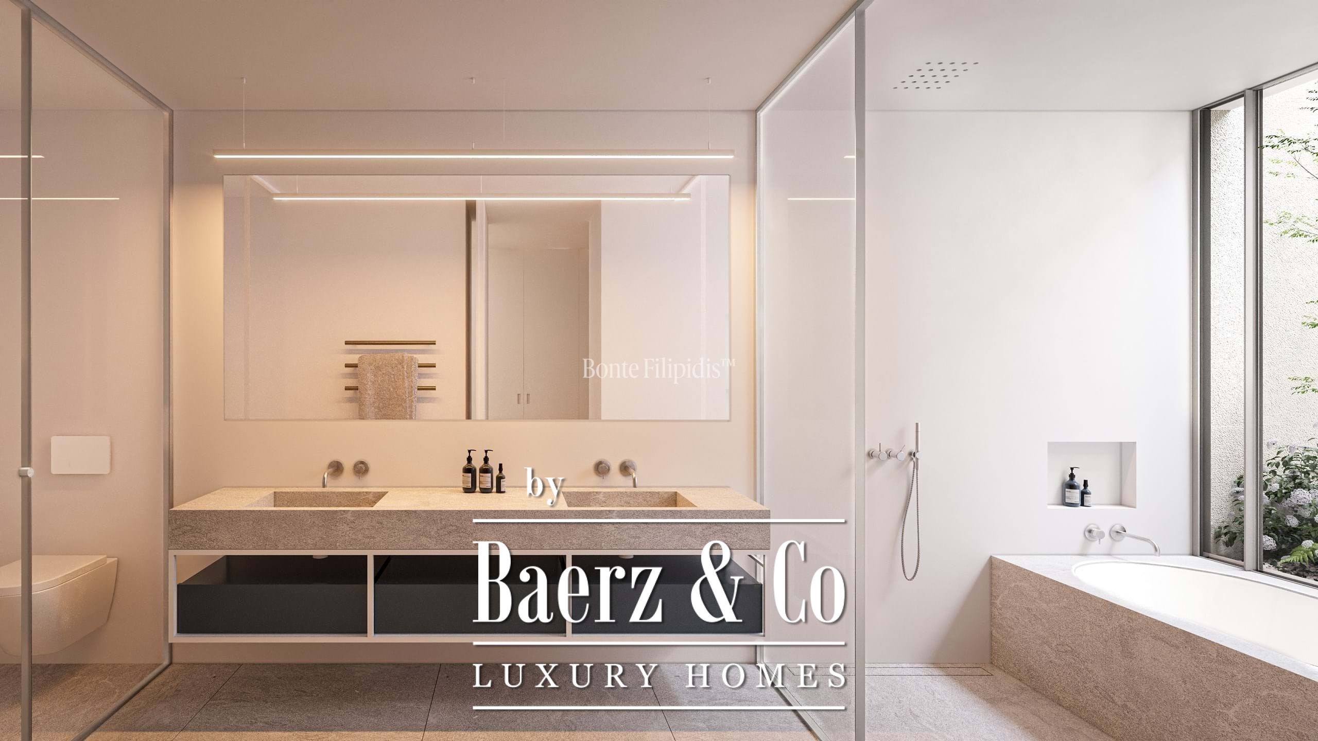 Light pours into the villa’s three levels through floor-to-ceiling alu window frames, ensuring thermal and acoustic comfort alongside a calm, understated aesthetic. Four bedrooms and five bathrooms provide privacy and space, including a primary suite of 52 m² with walk-in closet and direct garden-pool access. Living and entertaining areas flow outward to 727 m² of landscaped terraces, shaded patios, and a heated 63 m² pool, creating a fluid dialogue between indoors and out.