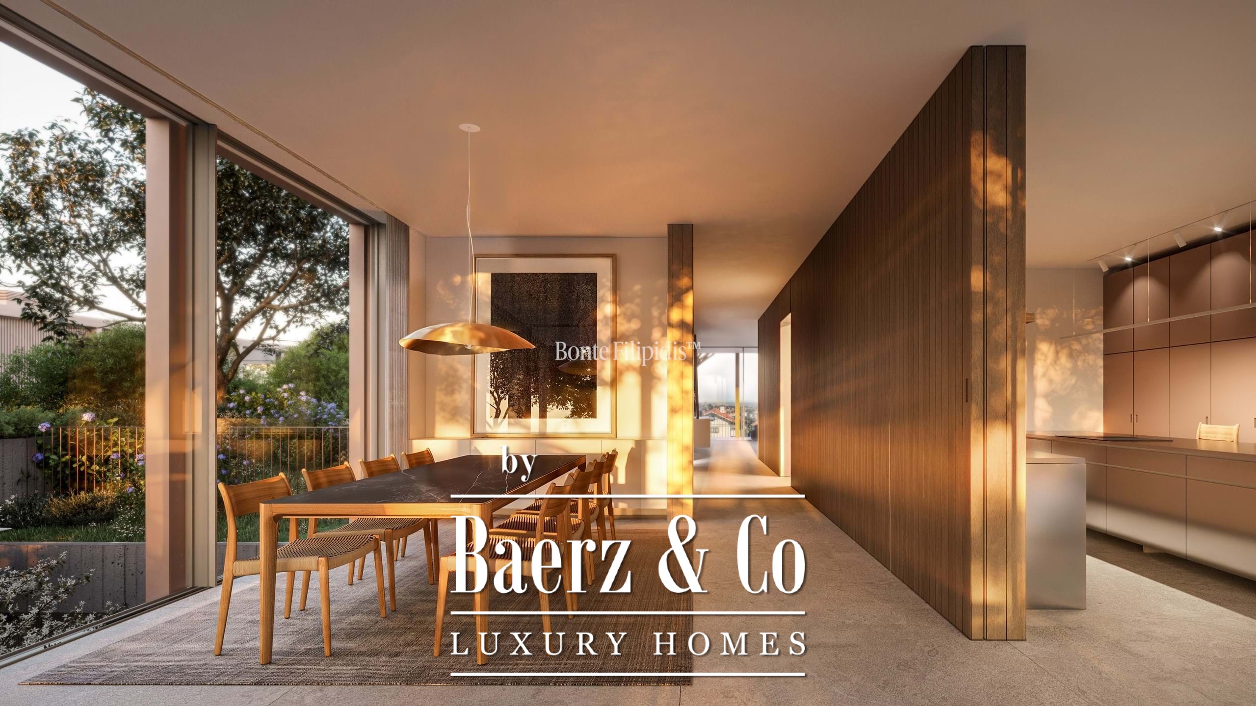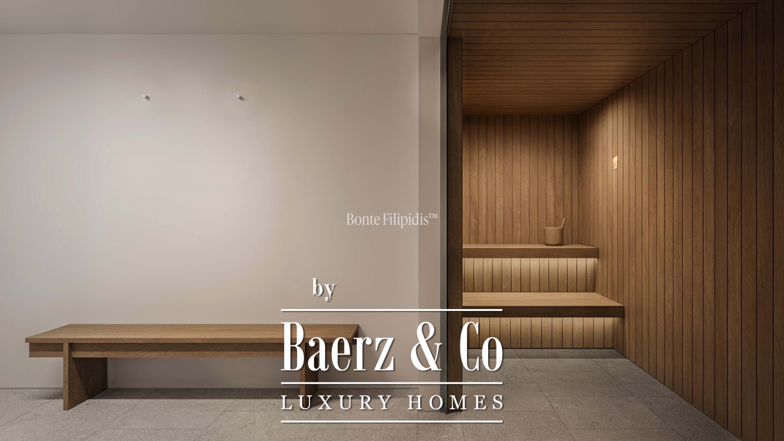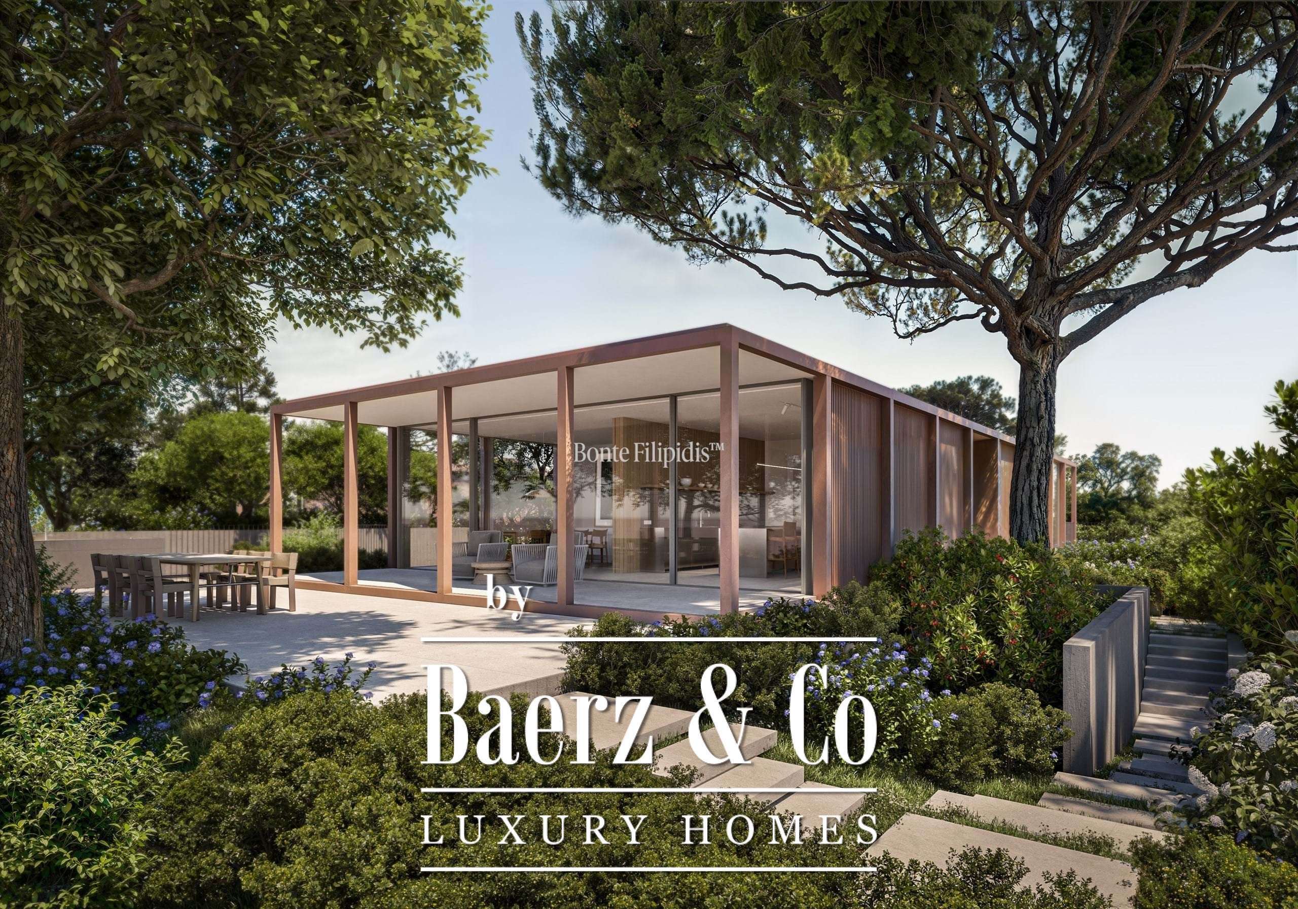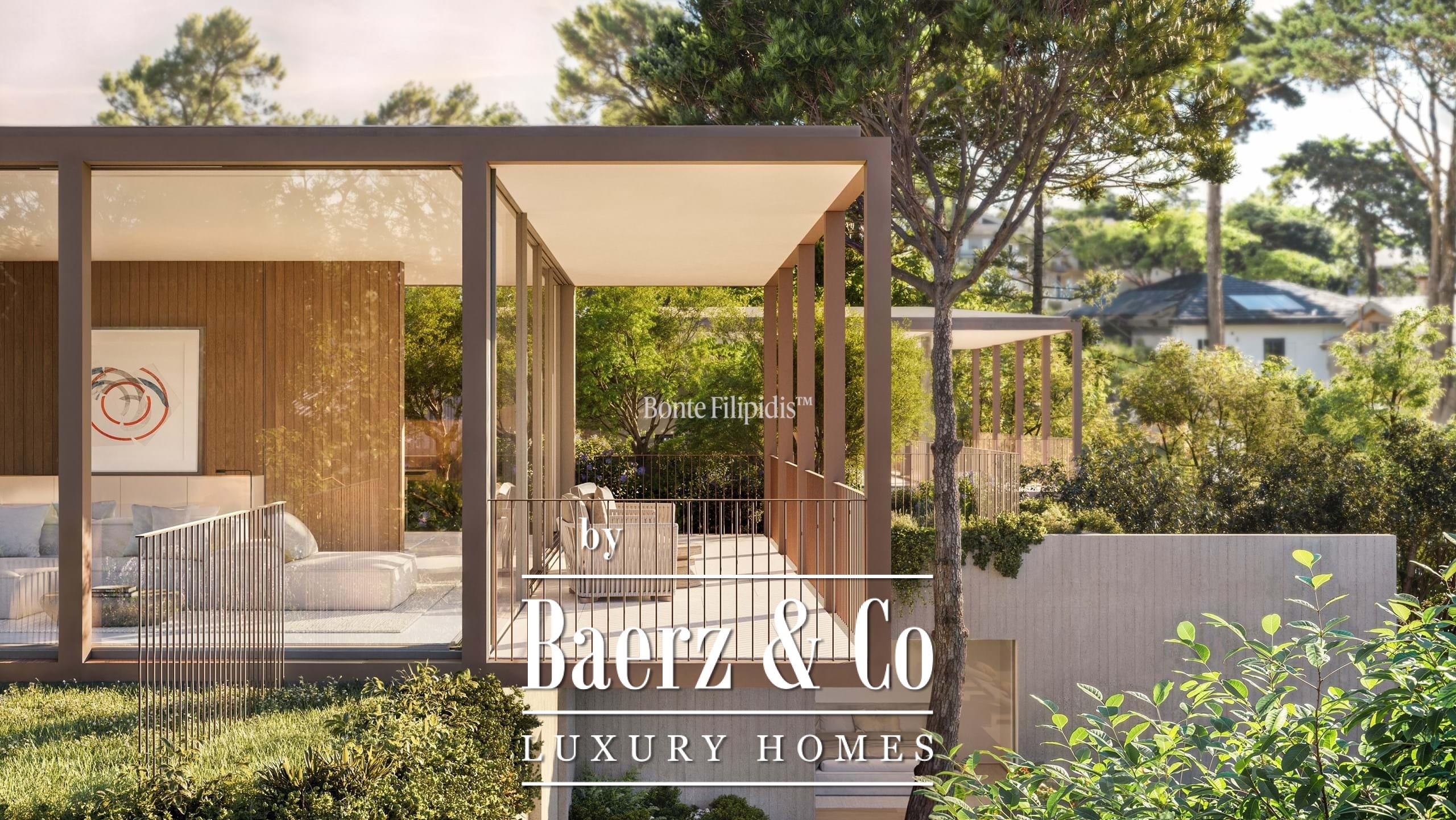 Light pours into the villa’s three levels through floor-to-ceiling alu window frames, ensuring thermal and acoustic comfort alongside a calm, understated aesthetic. Four bedrooms and five bathrooms provide privacy and space, including a primary suite of 52 m² with walk-in closet and direct garden-pool access. Living and entertaining areas flow outward to 727 m² of landscaped terraces, shaded patios, and a heated 63 m² pool, creating a fluid dialogue between indoors and out.