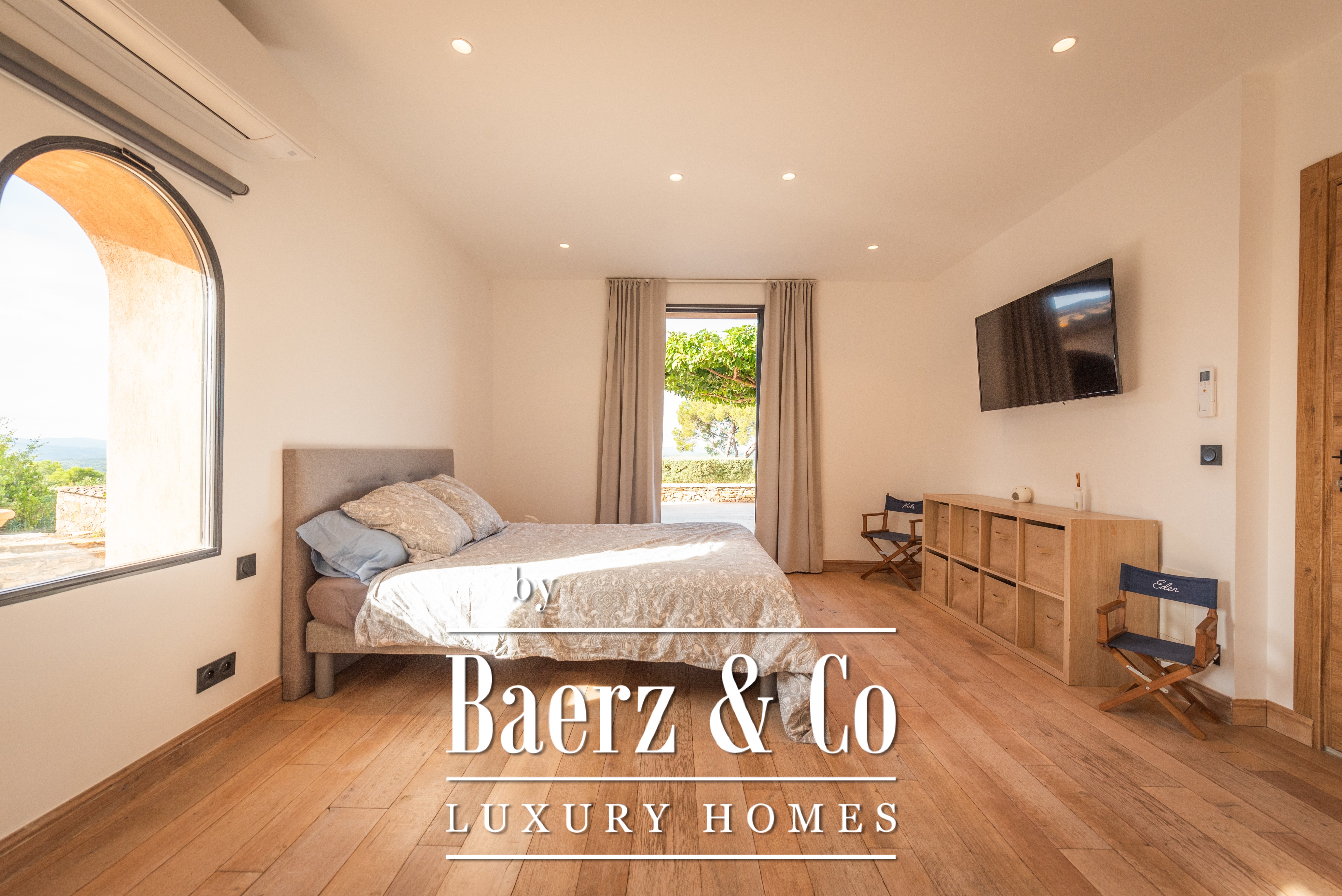 Villa Draguignan with panoramic mountain views rests above the town in a serene hillside setting, where nature and privacy define the experience. The estate unfolds across nearly 12,000 m² of quiet land, with sweeping 180° vistas framing the horizon. The villa’s architecture is measured and generous, offering a 222 m² main residence infused with natural light, and an independent 41 m² guesthouse situated below with its own private access.