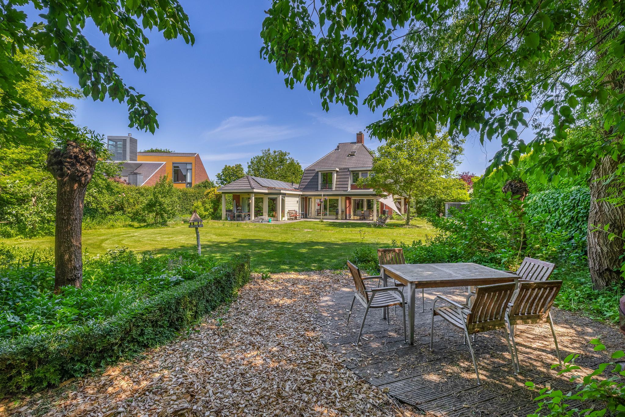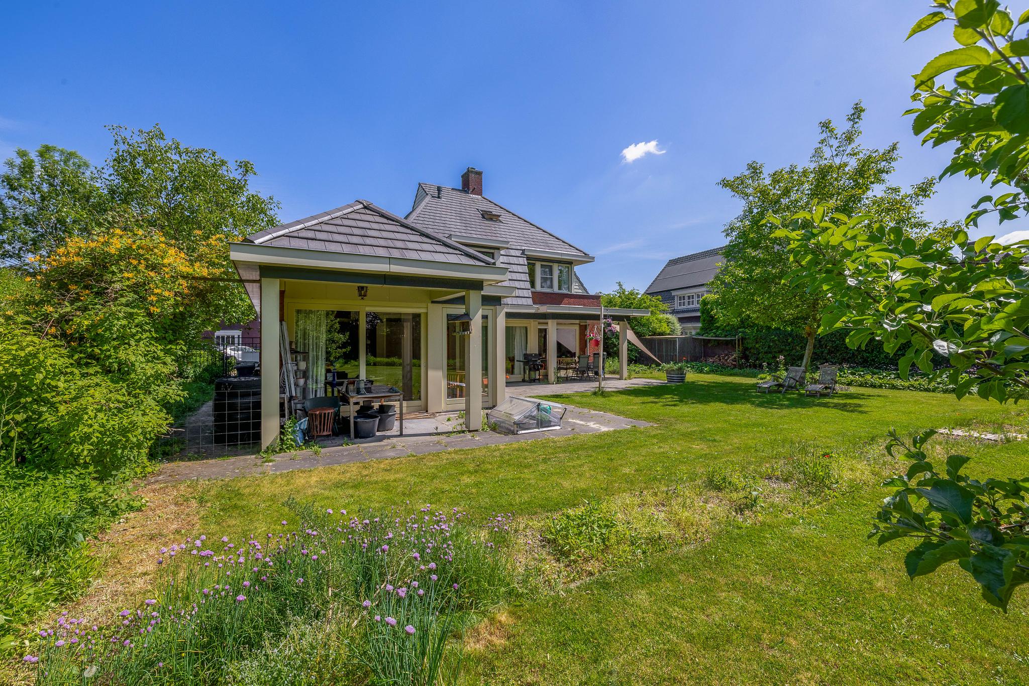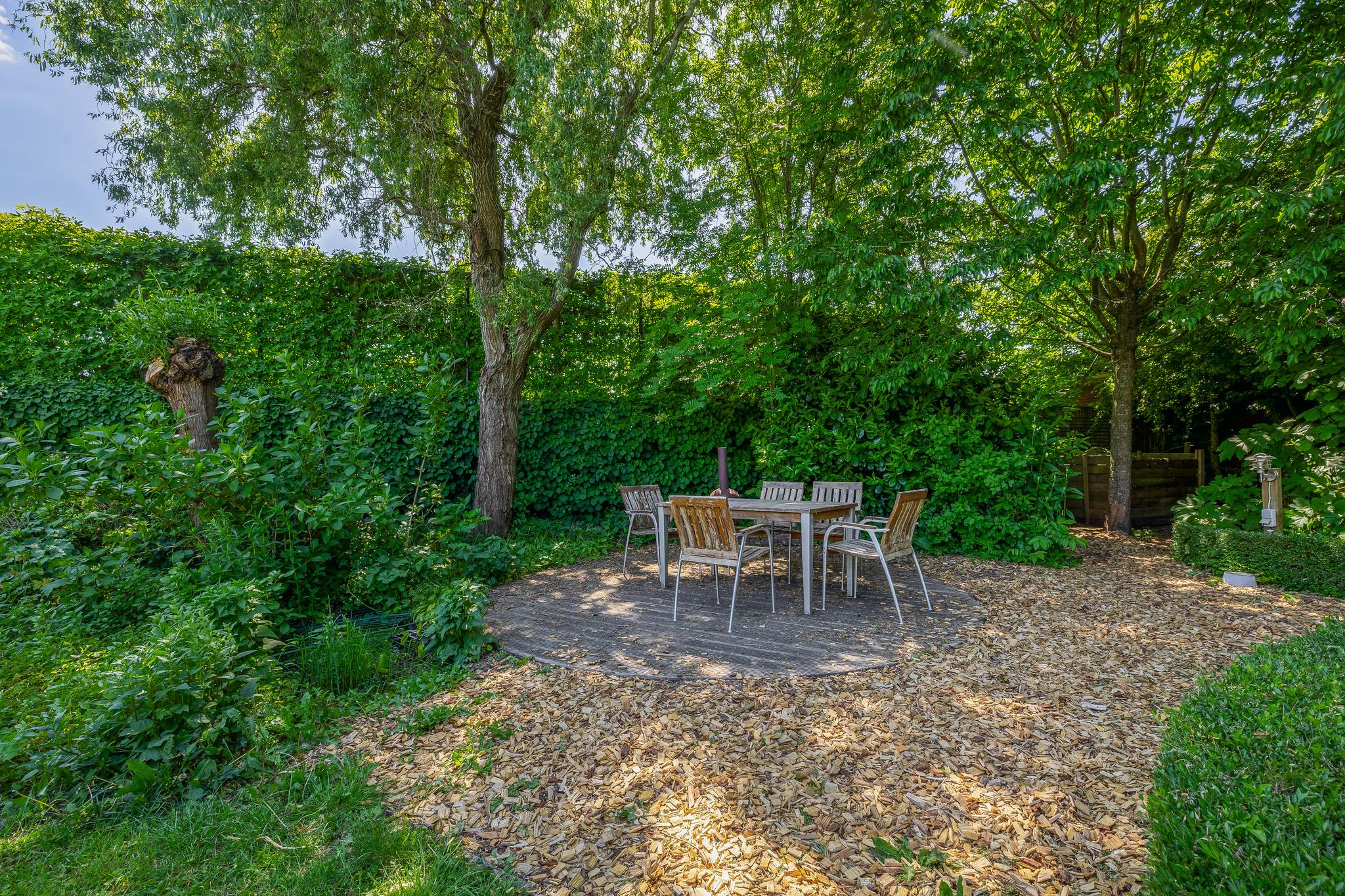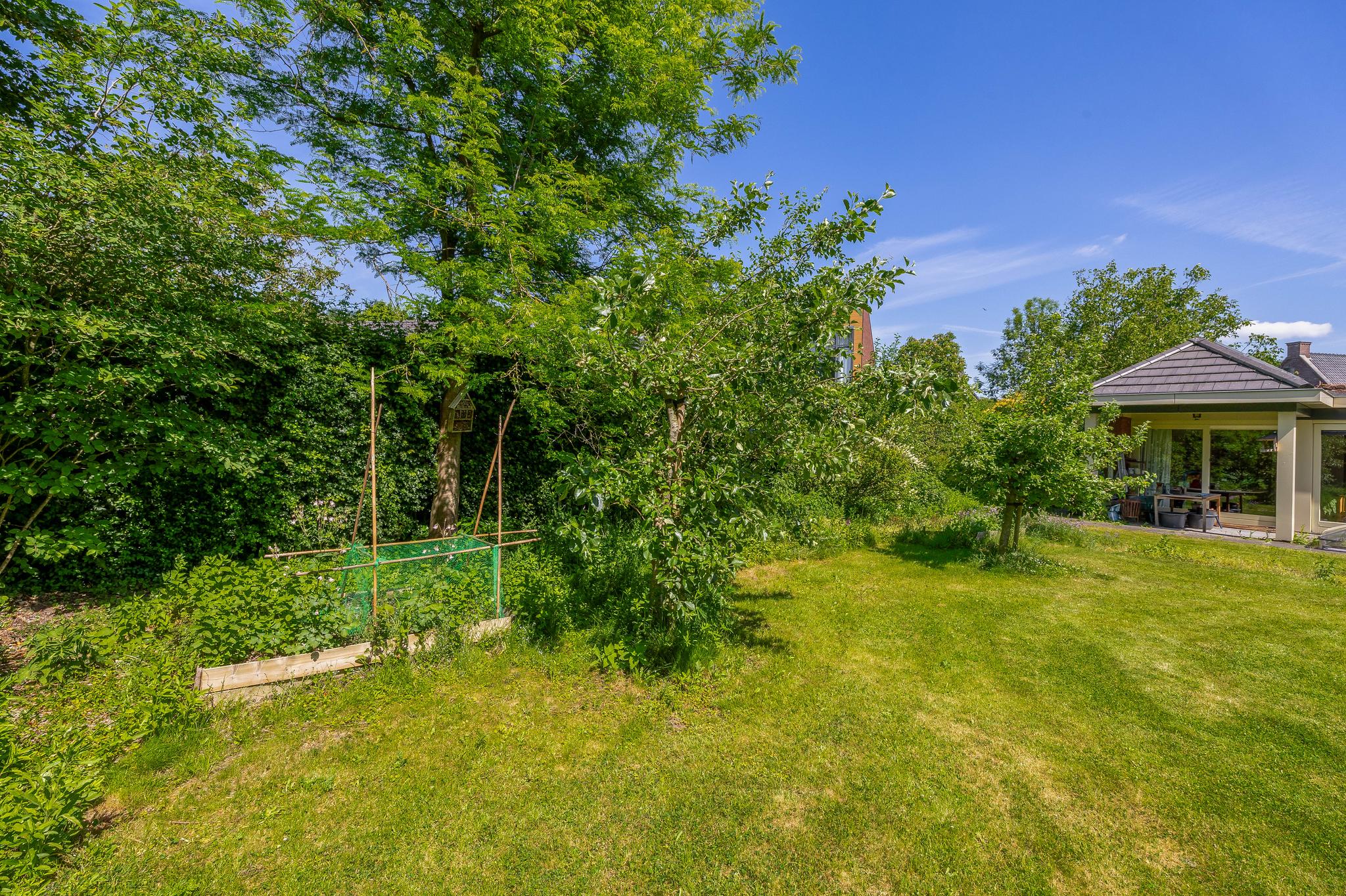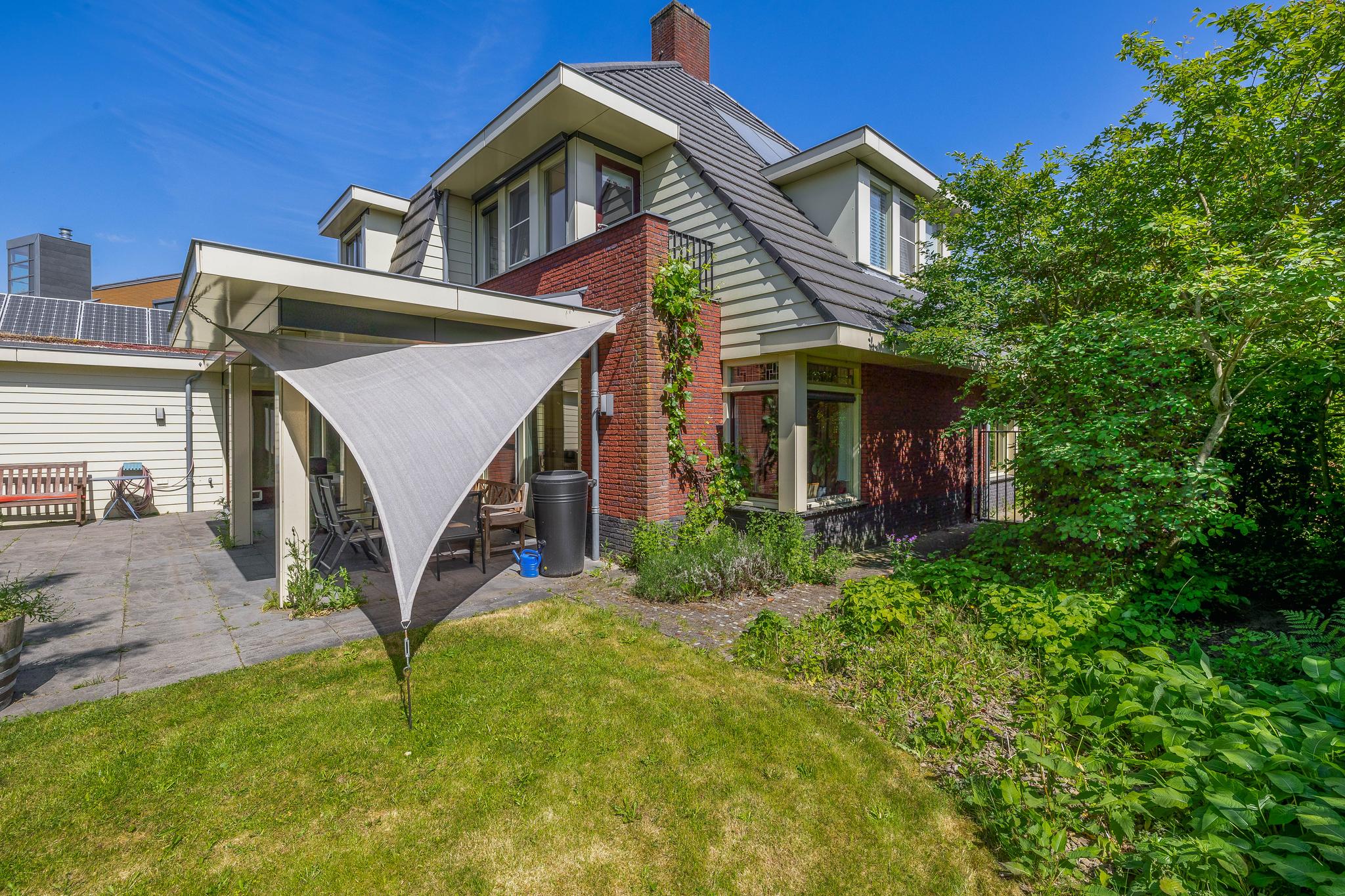 The backyard, designed by architect Martin Buijtels, offers plenty of privacy. The garden is beautifully landscaped with various tiled terraces, including two patio covers, one of which has a skylight and built-in lighting. There is also a lawn, various borders, a wooden deck, a vegetable garden, several fruit trees, including apple and plum trees, and a walnut tree. For convenience, there is a wall tap, a scrub pit, garden lighting, and electricity. The garden is fenced in on all sides, partly with a brick fence and partly with a gate, and is accessible via a back entrance with a lockable gate on both sides.