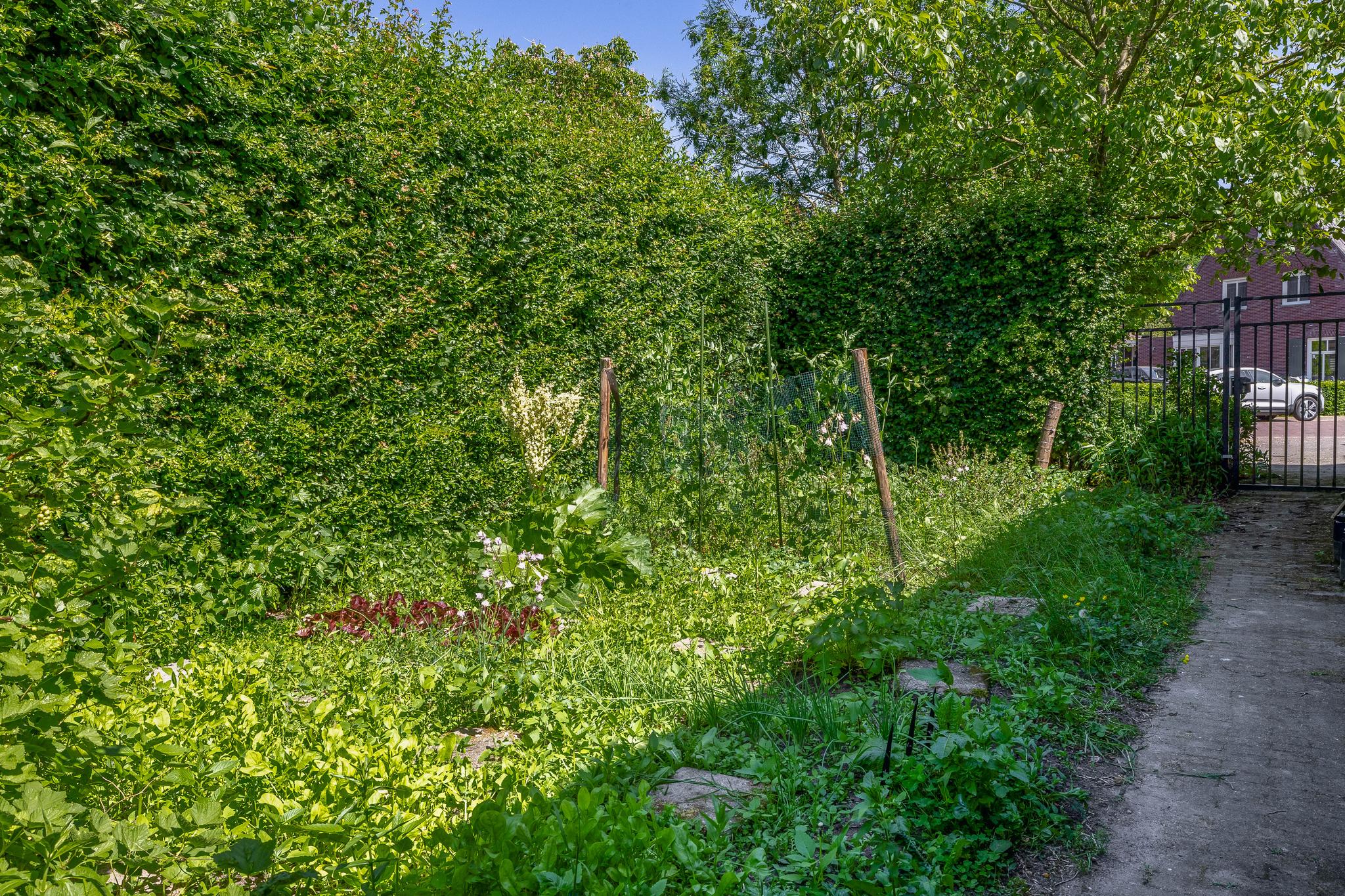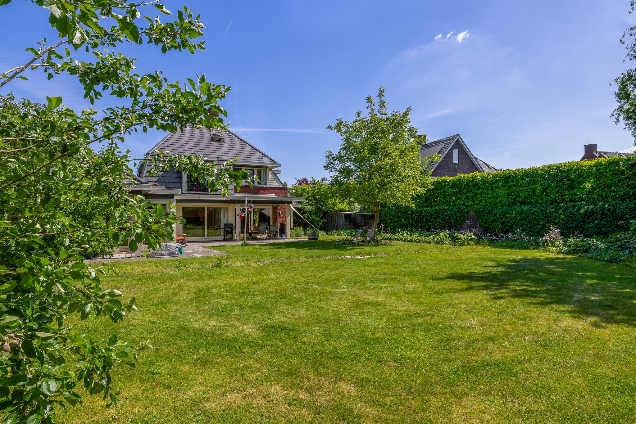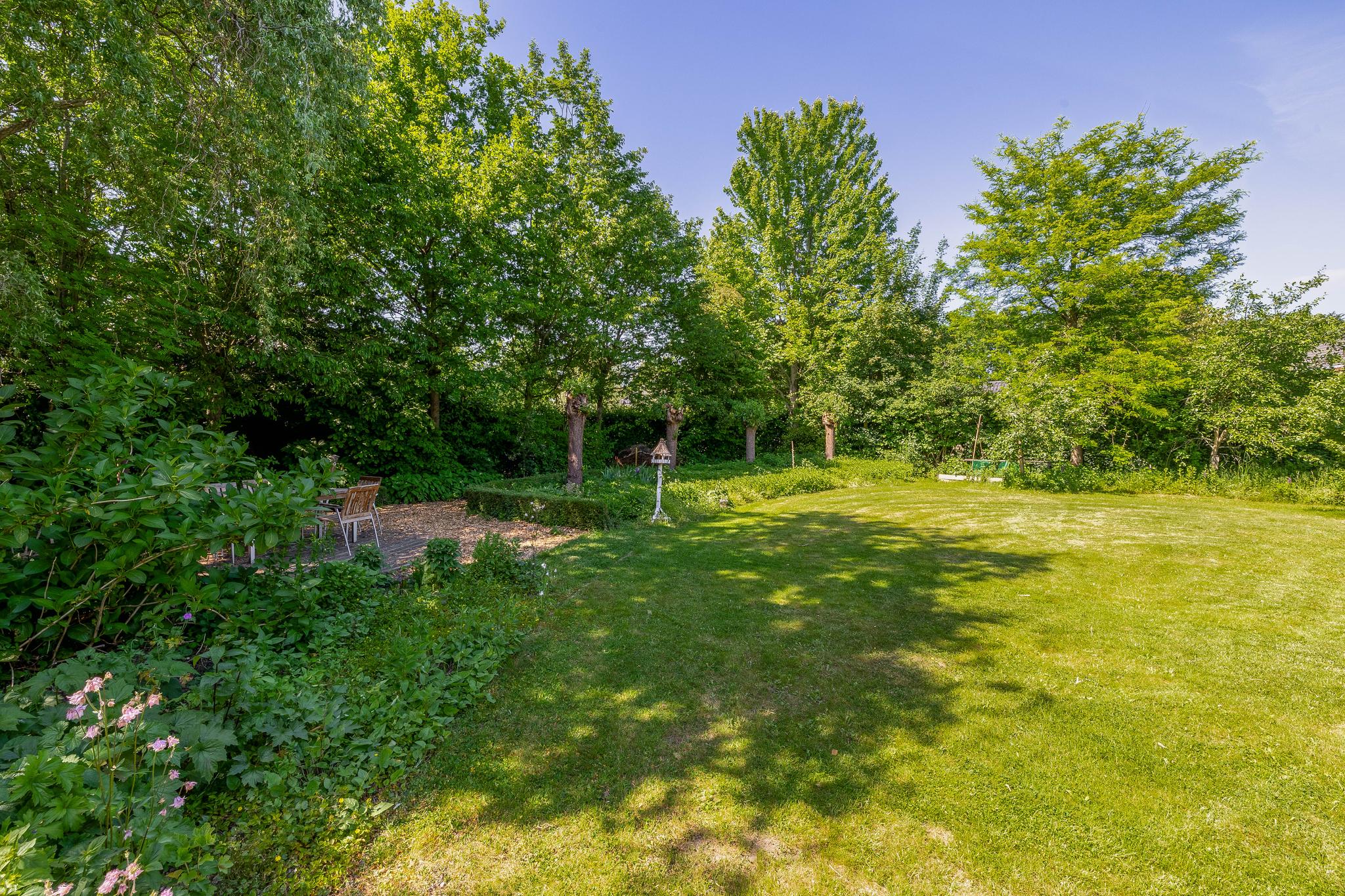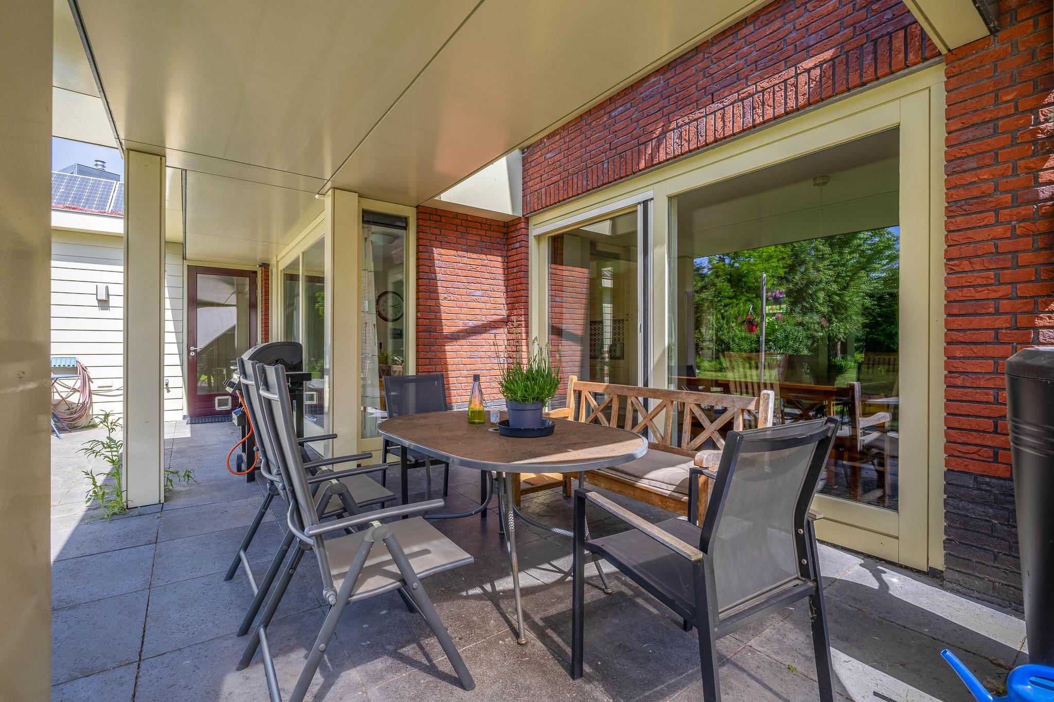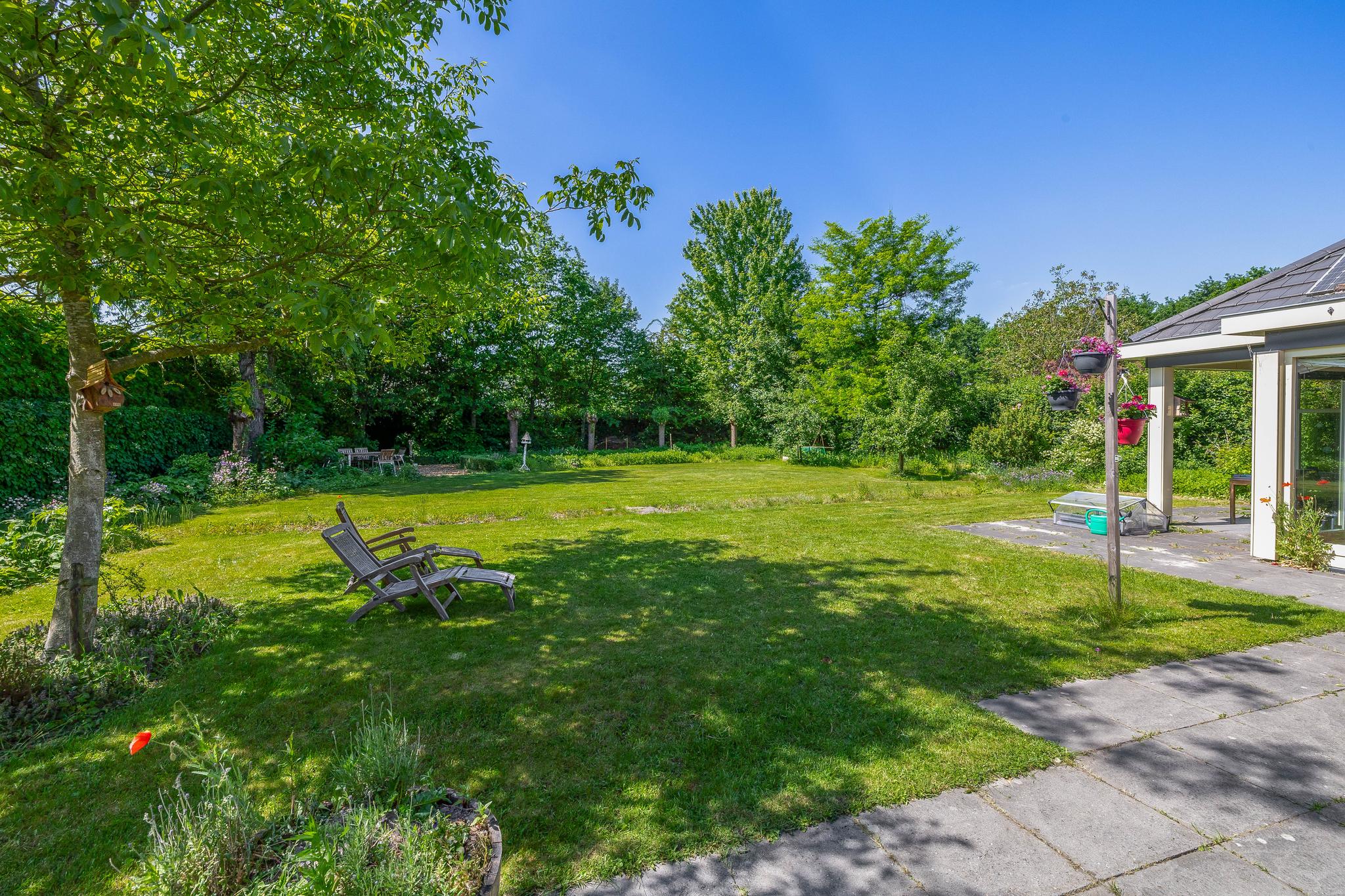 The backyard, designed by architect Martin Buijtels, offers plenty of privacy. The garden is beautifully landscaped with various tiled terraces, including two patio covers, one of which has a skylight and built-in lighting. There is also a lawn, various borders, a wooden deck, a vegetable garden, several fruit trees, including apple and plum trees, and a walnut tree. For convenience, there is a wall tap, a scrub pit, garden lighting, and electricity. The garden is fenced in on all sides, partly with a brick fence and partly with a gate, and is accessible via a back entrance with a lockable gate on both sides.