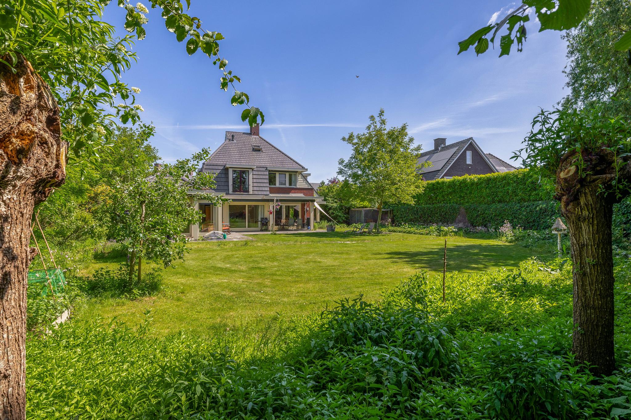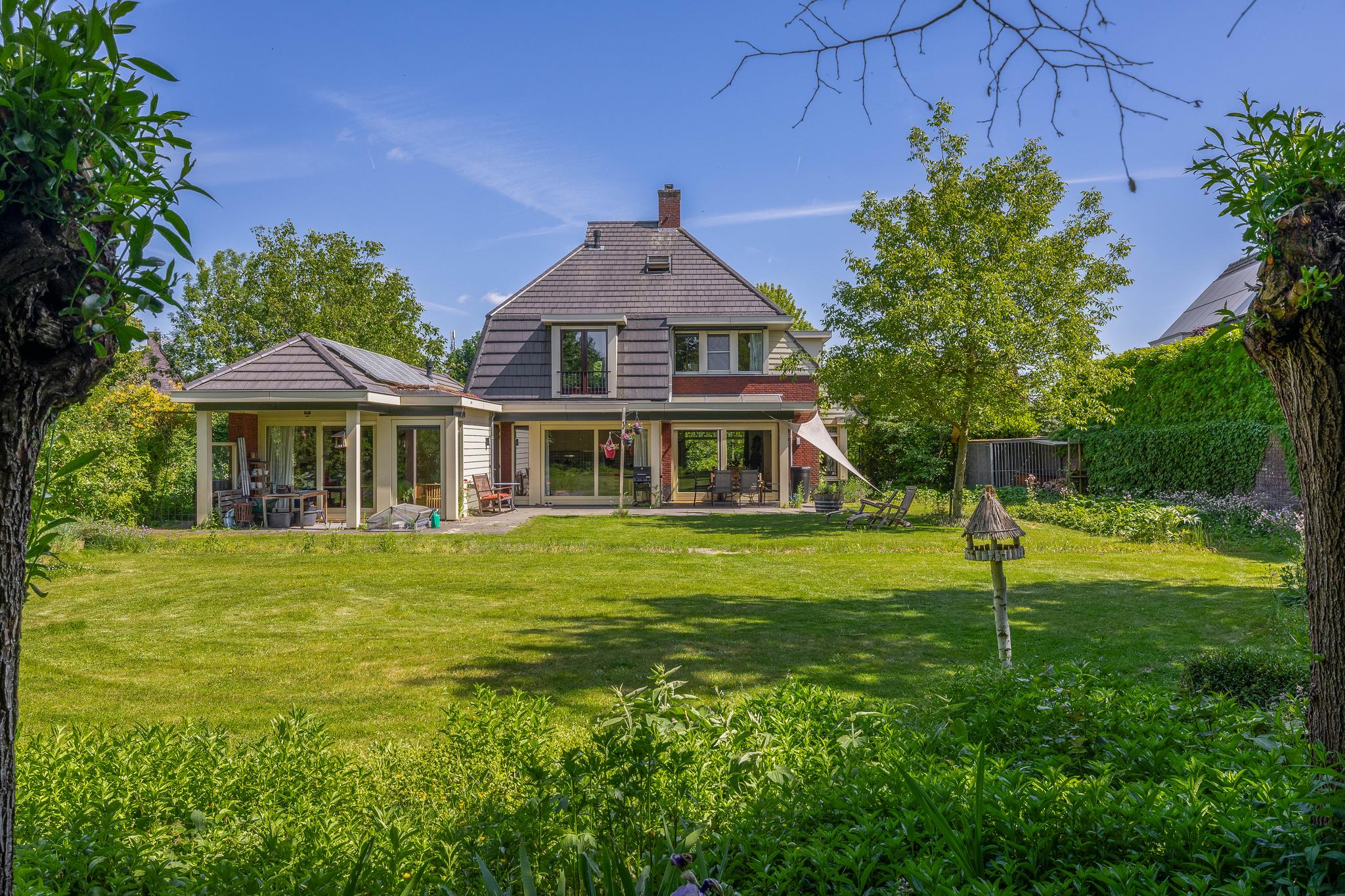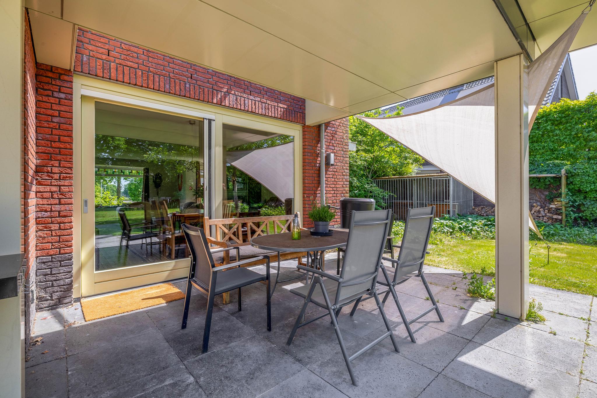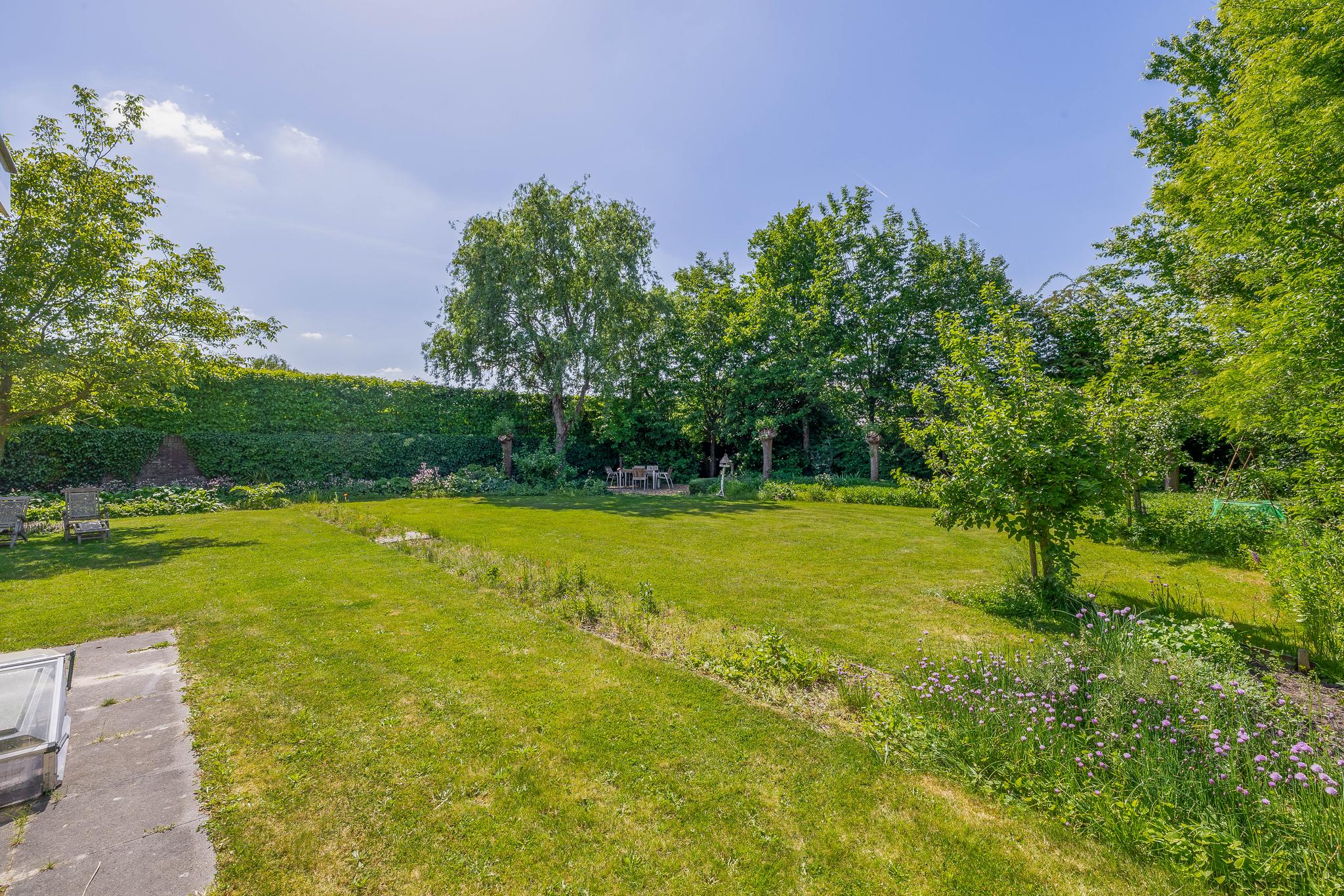 The backyard, designed by architect Martin Buijtels, offers plenty of privacy. The garden is beautifully landscaped with various tiled terraces, including two patio covers, one of which has a skylight and built-in lighting. There is also a lawn, various borders, a wooden deck, a vegetable garden, several fruit trees, including apple and plum trees, and a walnut tree. For convenience, there is a wall tap, a scrub pit, garden lighting, and electricity. The garden is fenced in on all sides, partly with a brick fence and partly with a gate, and is accessible via a back entrance with a lockable gate on both sides.