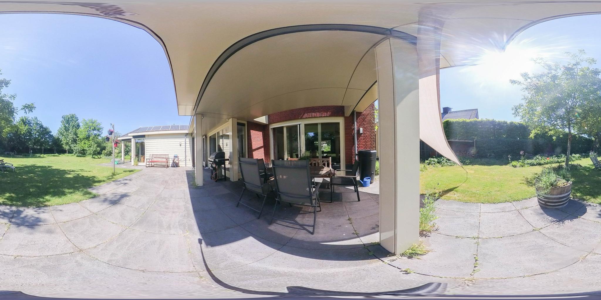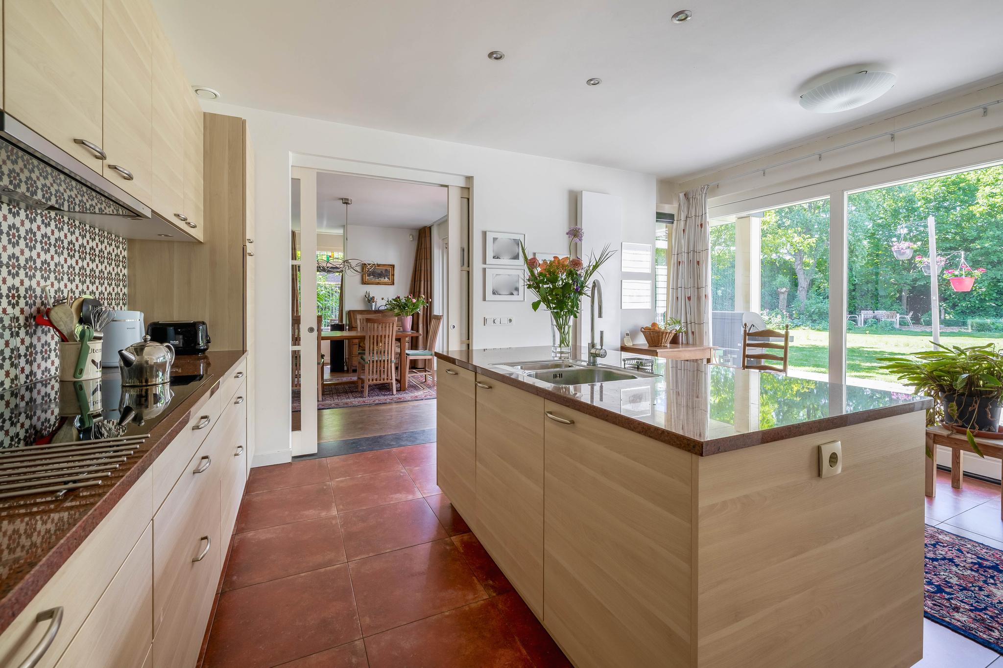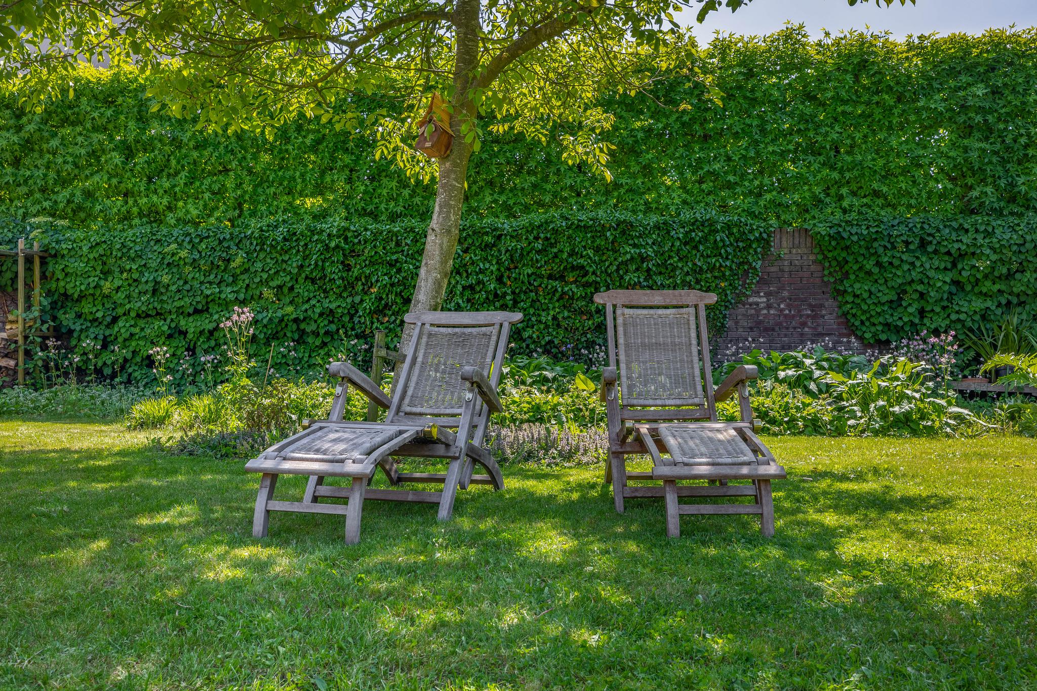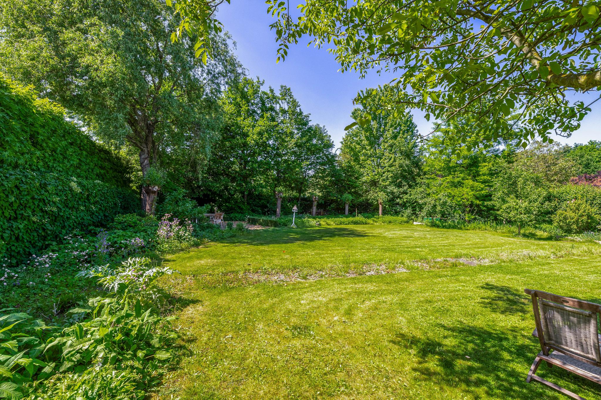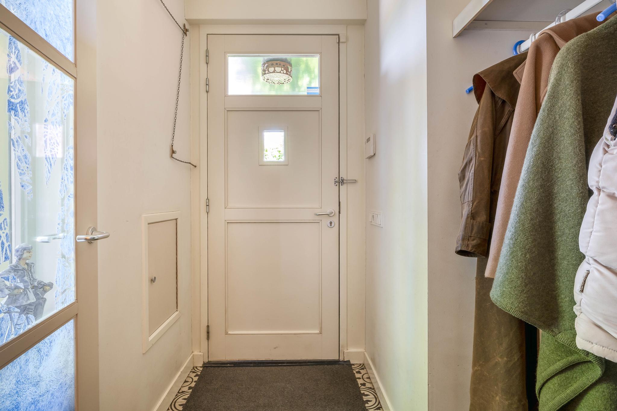 The backyard, designed by architect Martin Buijtels, offers plenty of privacy. The garden is beautifully landscaped with various tiled terraces, including two patio covers, one of which has a skylight and built-in lighting. There is also a lawn, various borders, a wooden deck, a vegetable garden, several fruit trees, including apple and plum trees, and a walnut tree. For convenience, there is a wall tap, a scrub pit, garden lighting, and electricity. The garden is fenced in on all sides, partly with a brick fence and partly with a gate, and is accessible via a back entrance with a lockable gate on both sides.