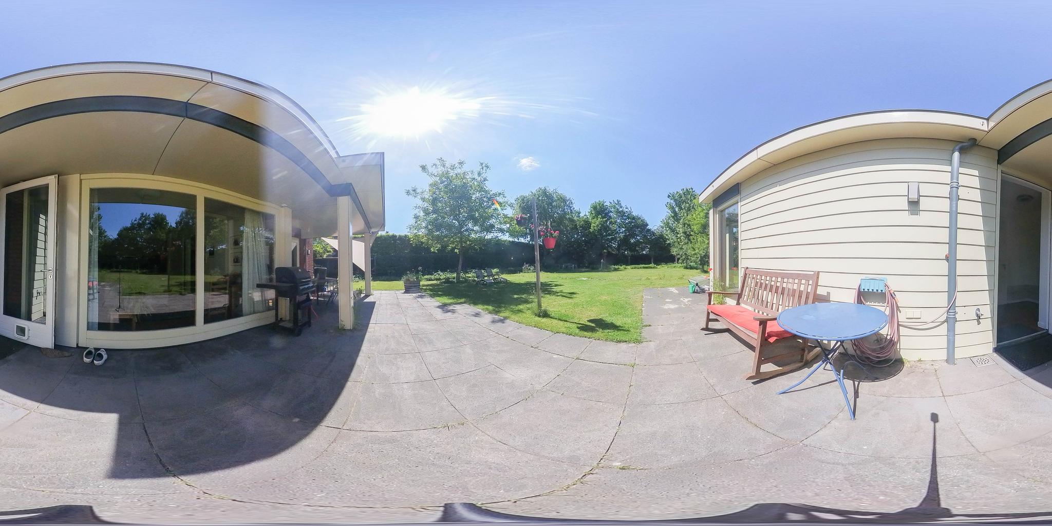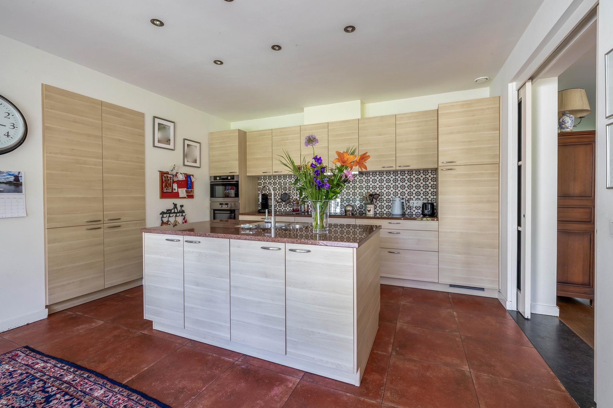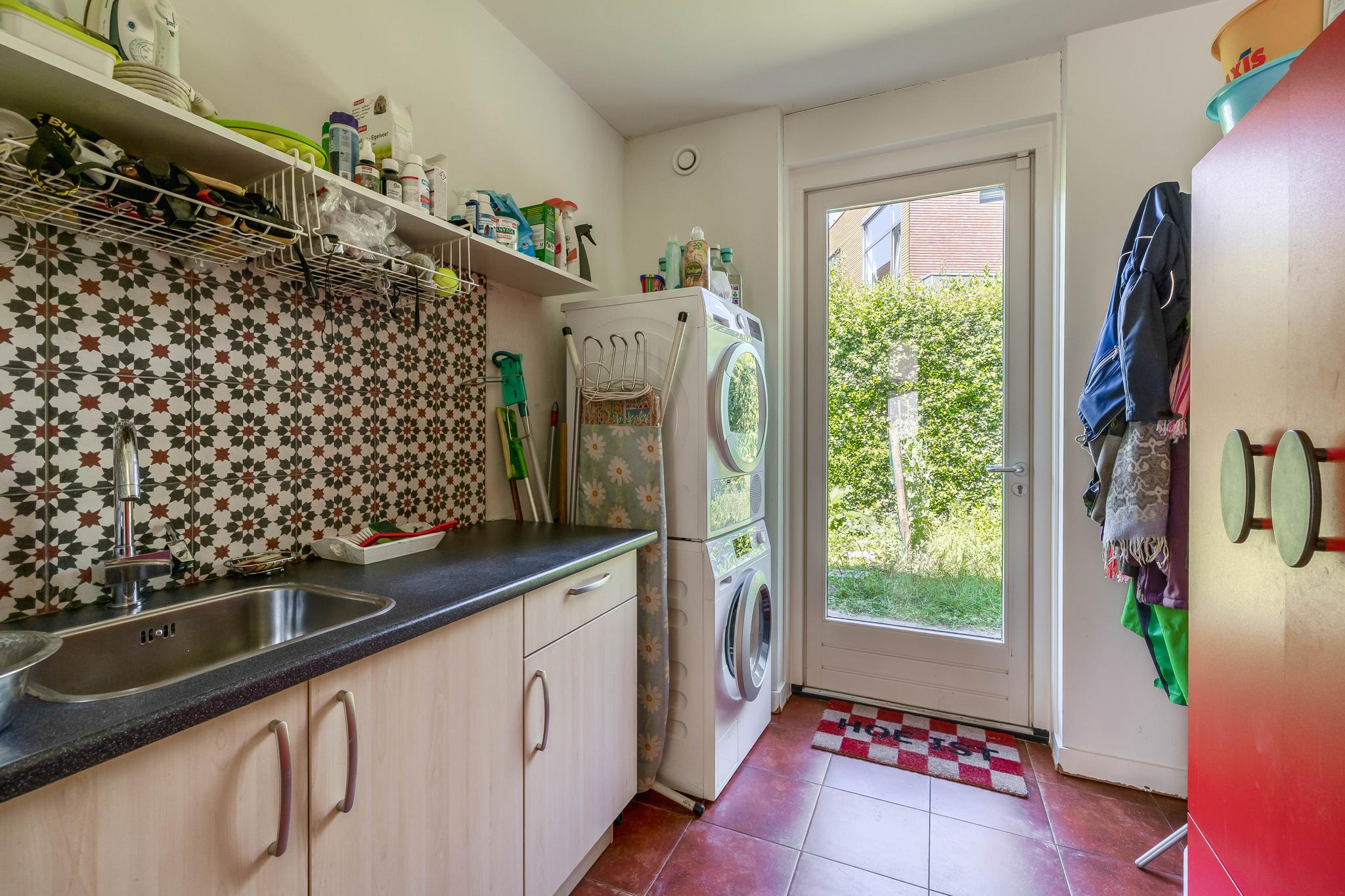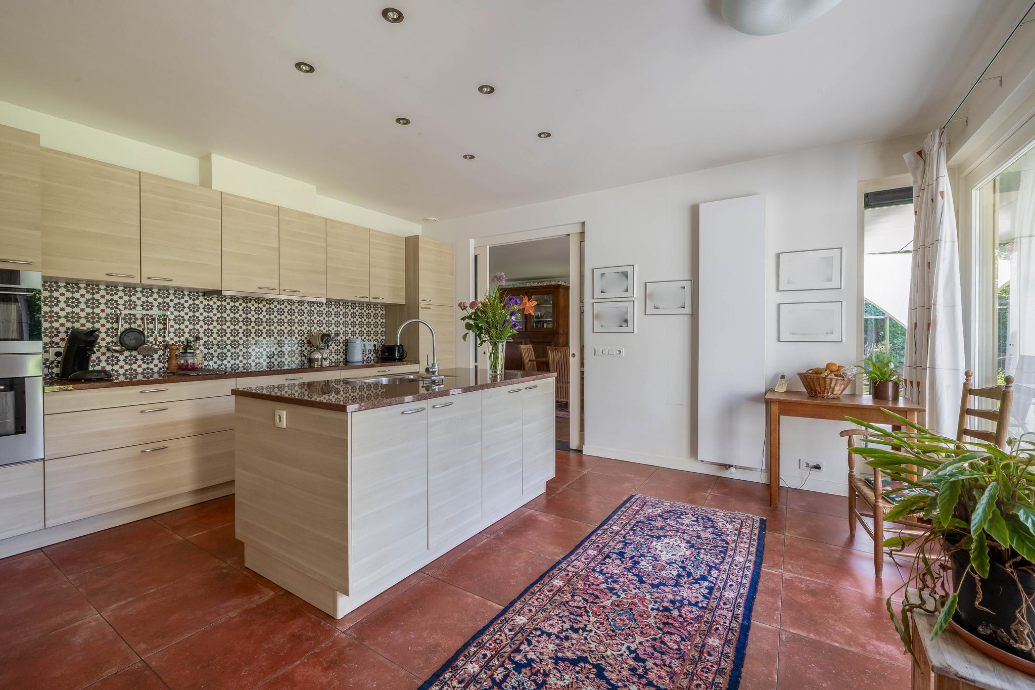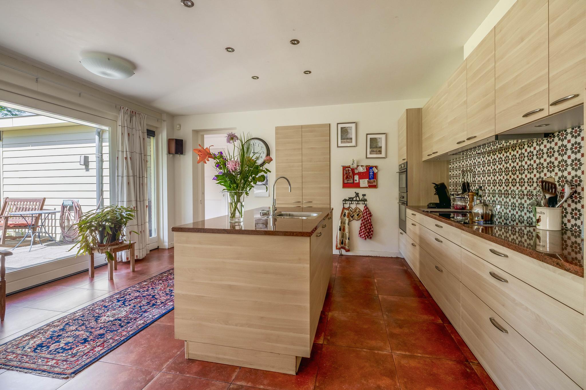 The backyard, designed by architect Martin Buijtels, offers plenty of privacy. The garden is beautifully landscaped with various tiled terraces, including two patio covers, one of which has a skylight and built-in lighting. There is also a lawn, various borders, a wooden deck, a vegetable garden, several fruit trees, including apple and plum trees, and a walnut tree. For convenience, there is a wall tap, a scrub pit, garden lighting, and electricity. The garden is fenced in on all sides, partly with a brick fence and partly with a gate, and is accessible via a back entrance with a lockable gate on both sides.