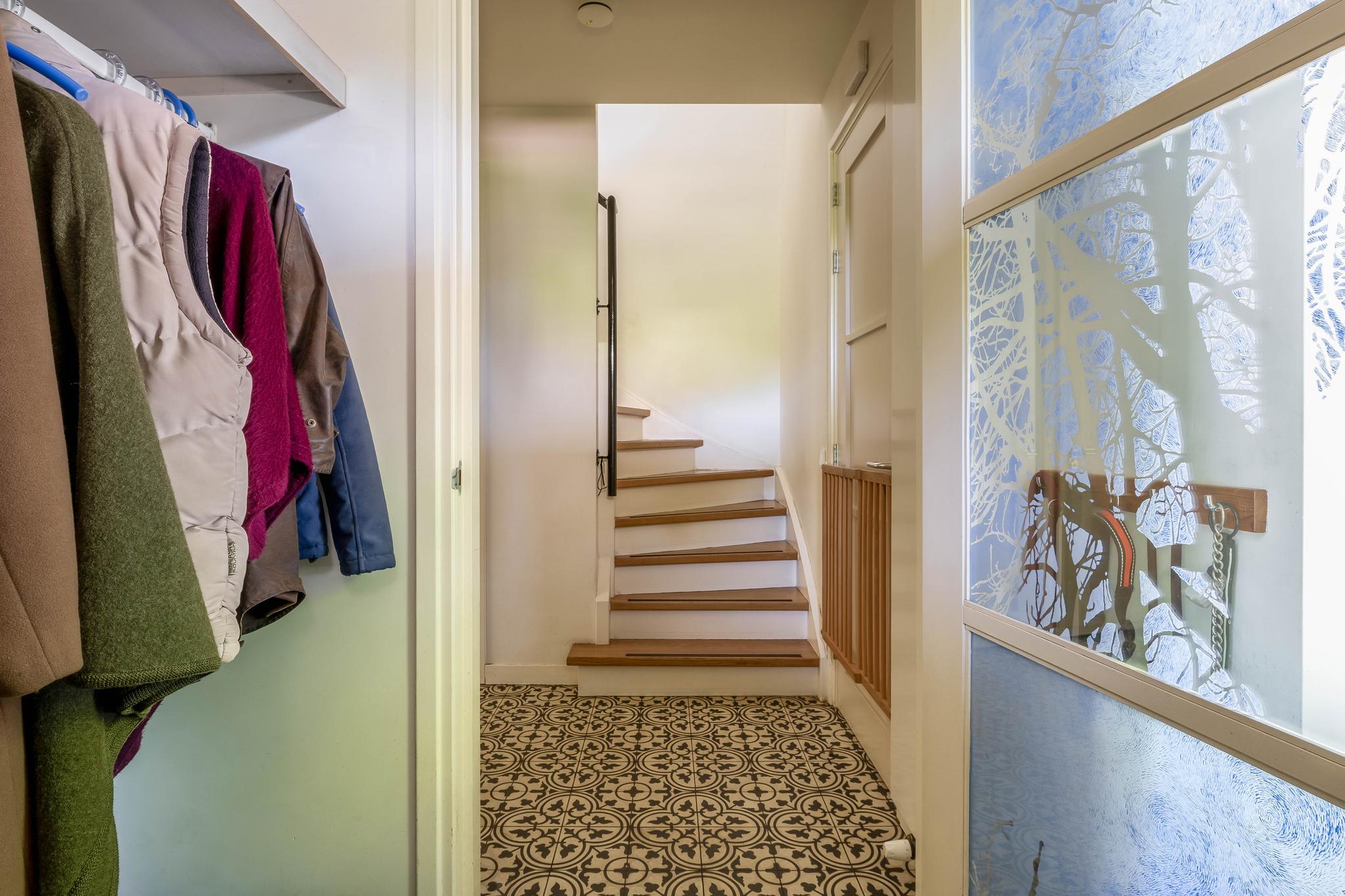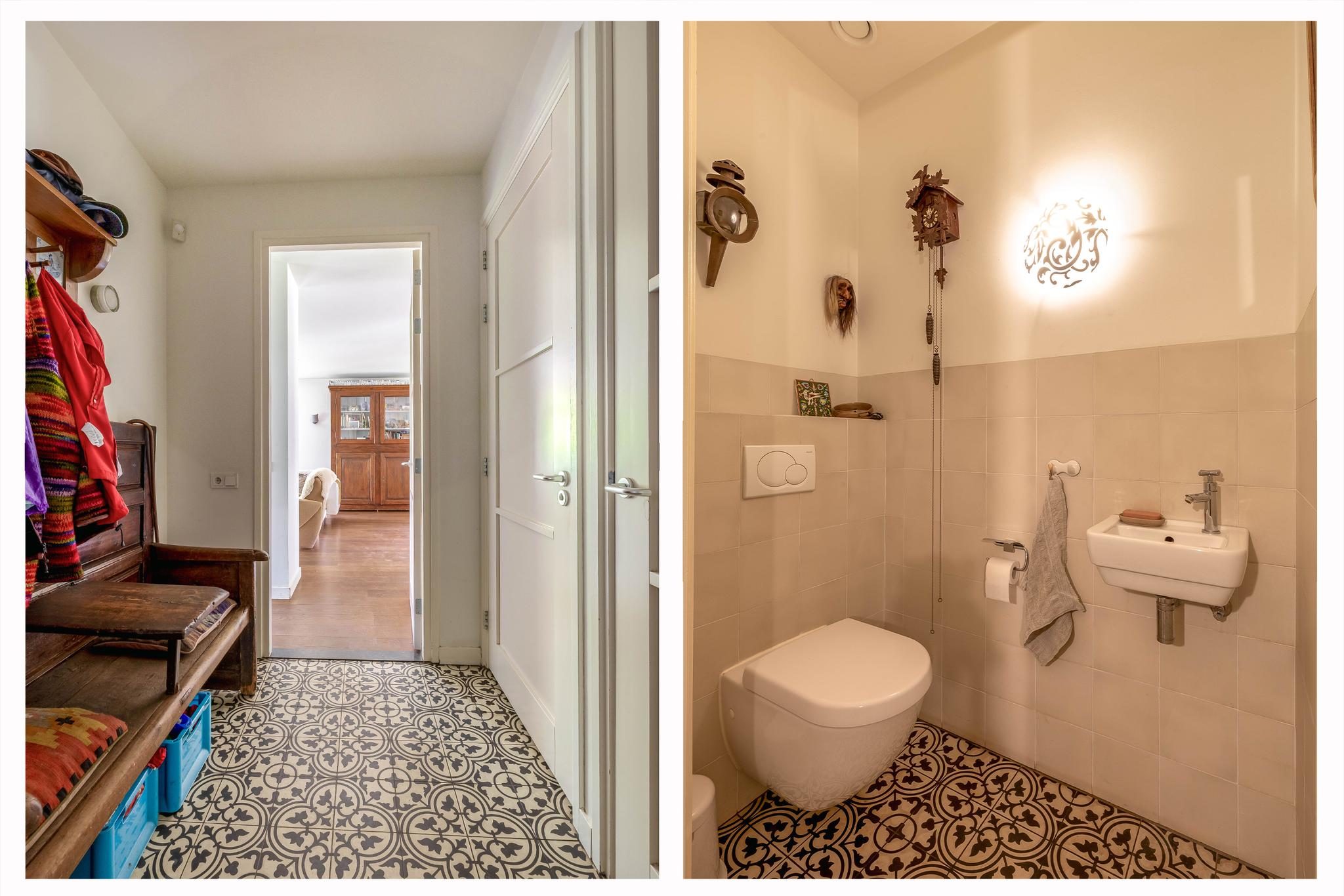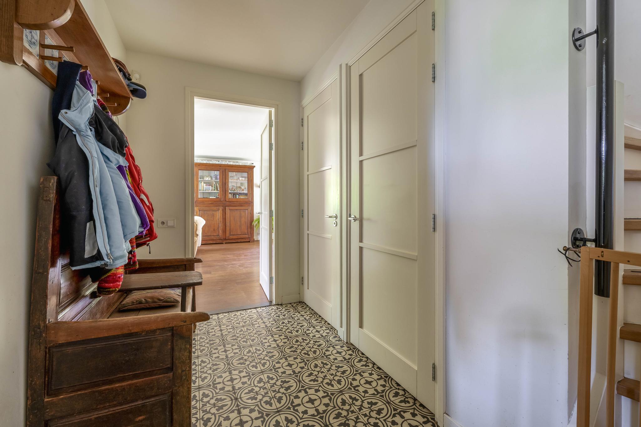 Upon entering, you step through a vestibule with a coat rack into a spacious entrance hall. The floor is tiled with Portuguese design tiles. From the hall, you have access to the partially tiled toilet with a free-hanging toilet and washbasin, the staircase to the first floor, and a spacious basement with tiled floor. Here you will also find the central meter cupboard with plenty of groups.