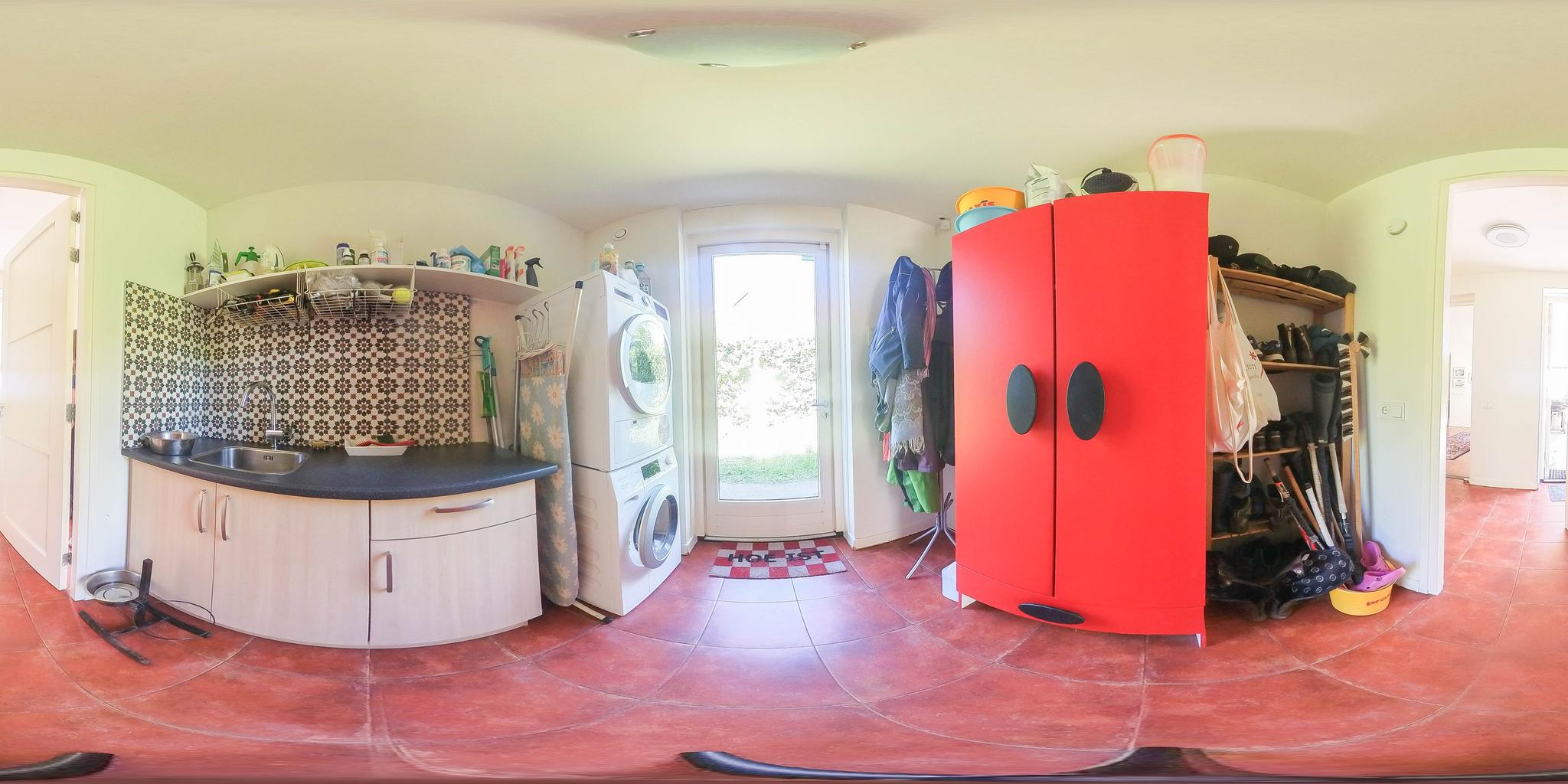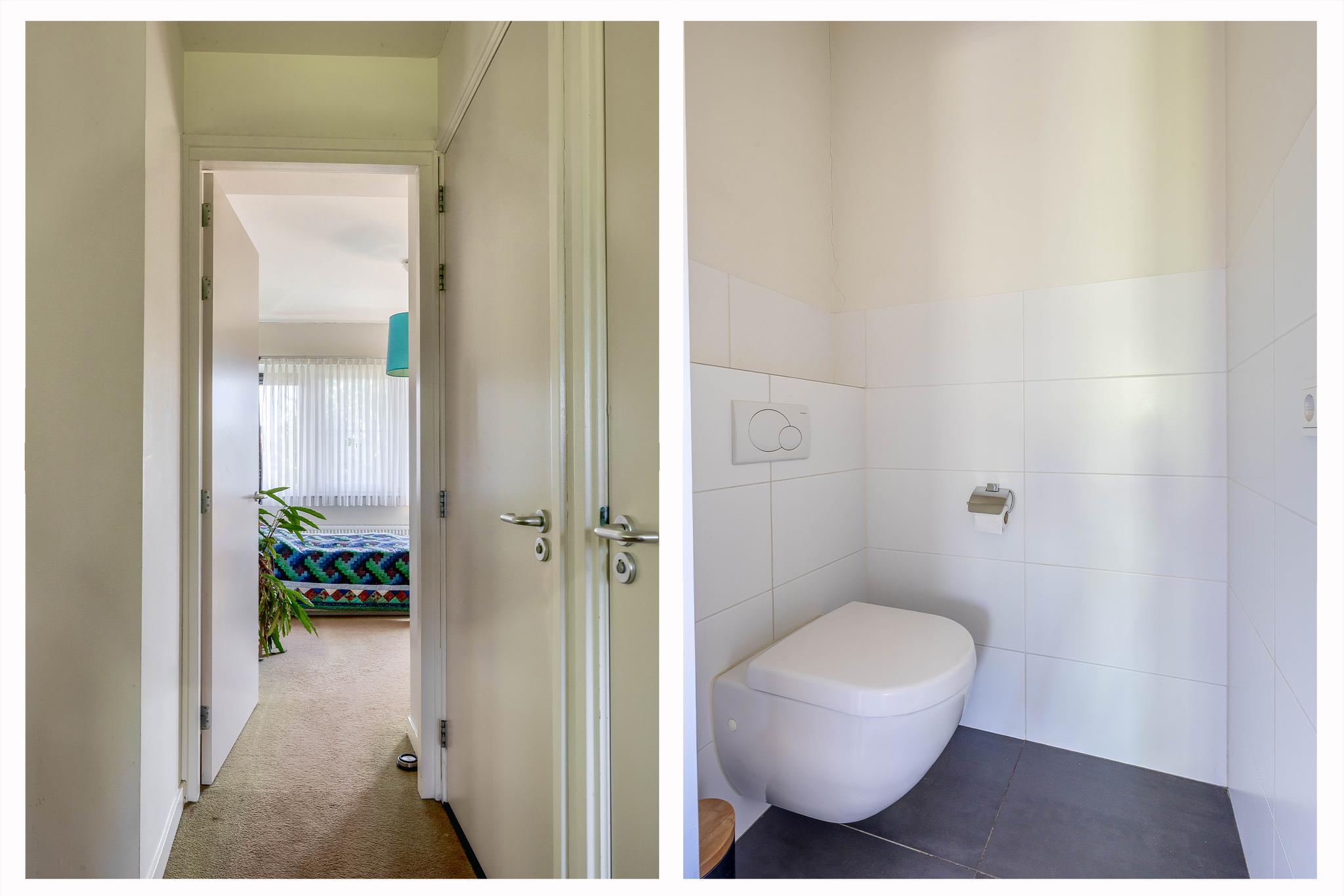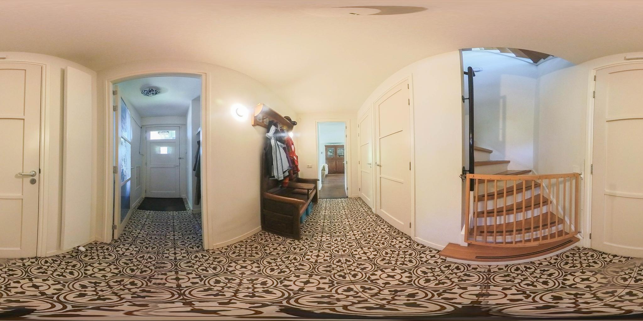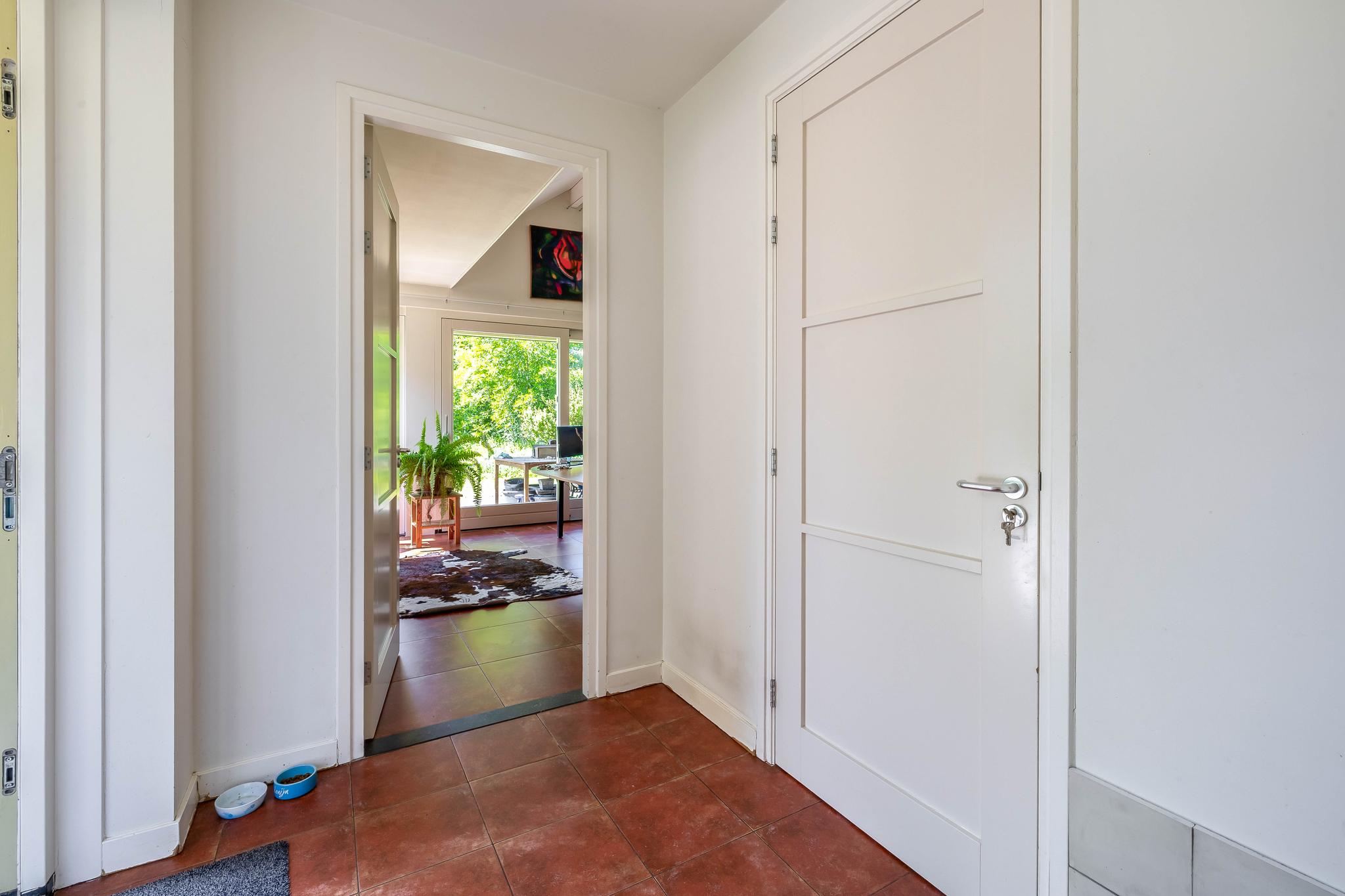 Upon entering, you step through a vestibule with a coat rack into a spacious entrance hall. The floor is tiled with Portuguese design tiles. From the hall, you have access to the partially tiled toilet with a free-hanging toilet and washbasin, the staircase to the first floor, and a spacious basement with tiled floor. Here you will also find the central meter cupboard with plenty of groups.