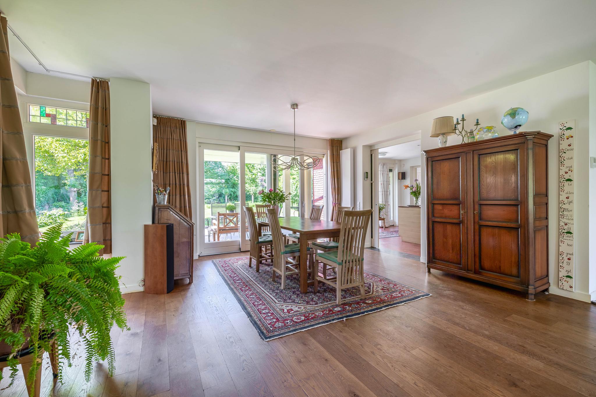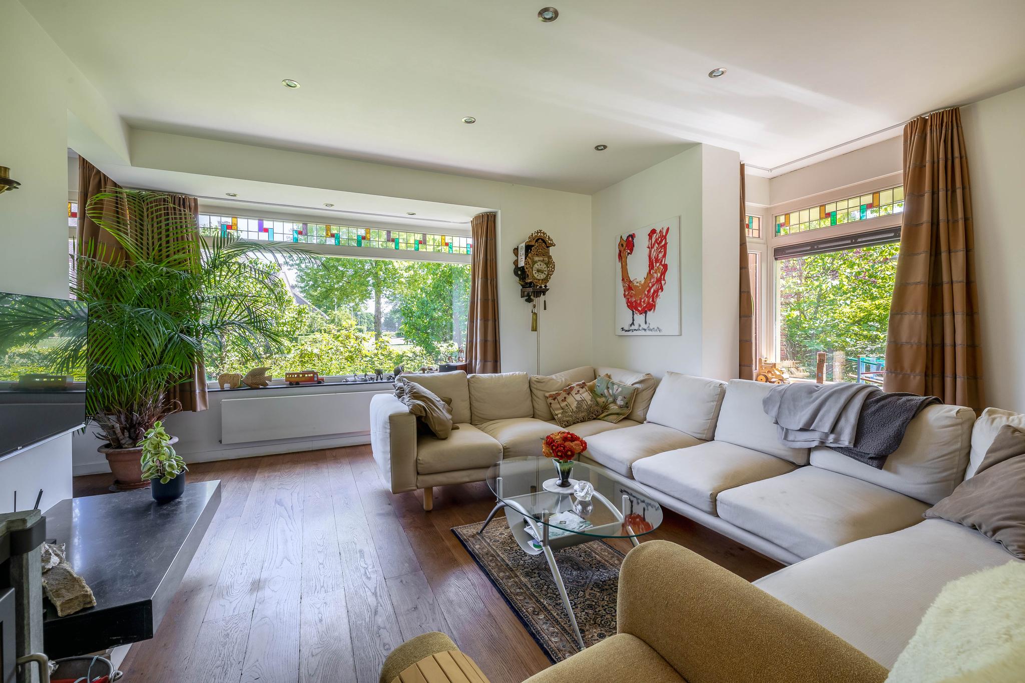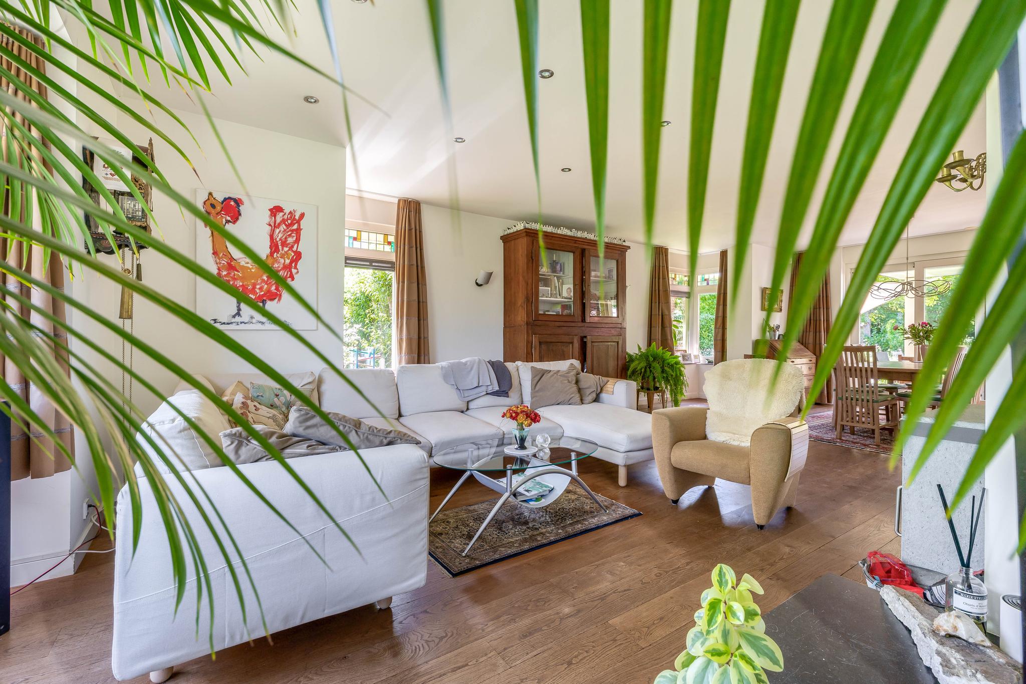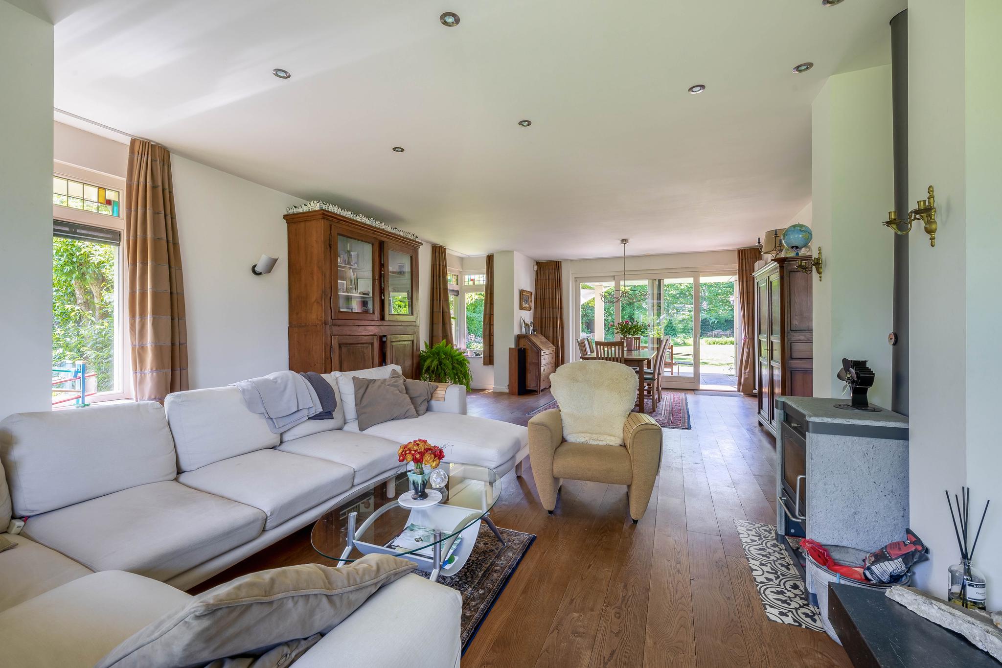From the reception hall, you enter the very spacious living room, a wonderful place to relax. It is divided into a study/TV corner and a spacious sitting area with a wood-burning stove. The large dining area is adjacent to the garden and has sliding doors to the backyard and the covered terrace. Thanks to the large windows, the bay window at the front with stained glass in the upper part of the windows in the living room, there is plenty of natural light.