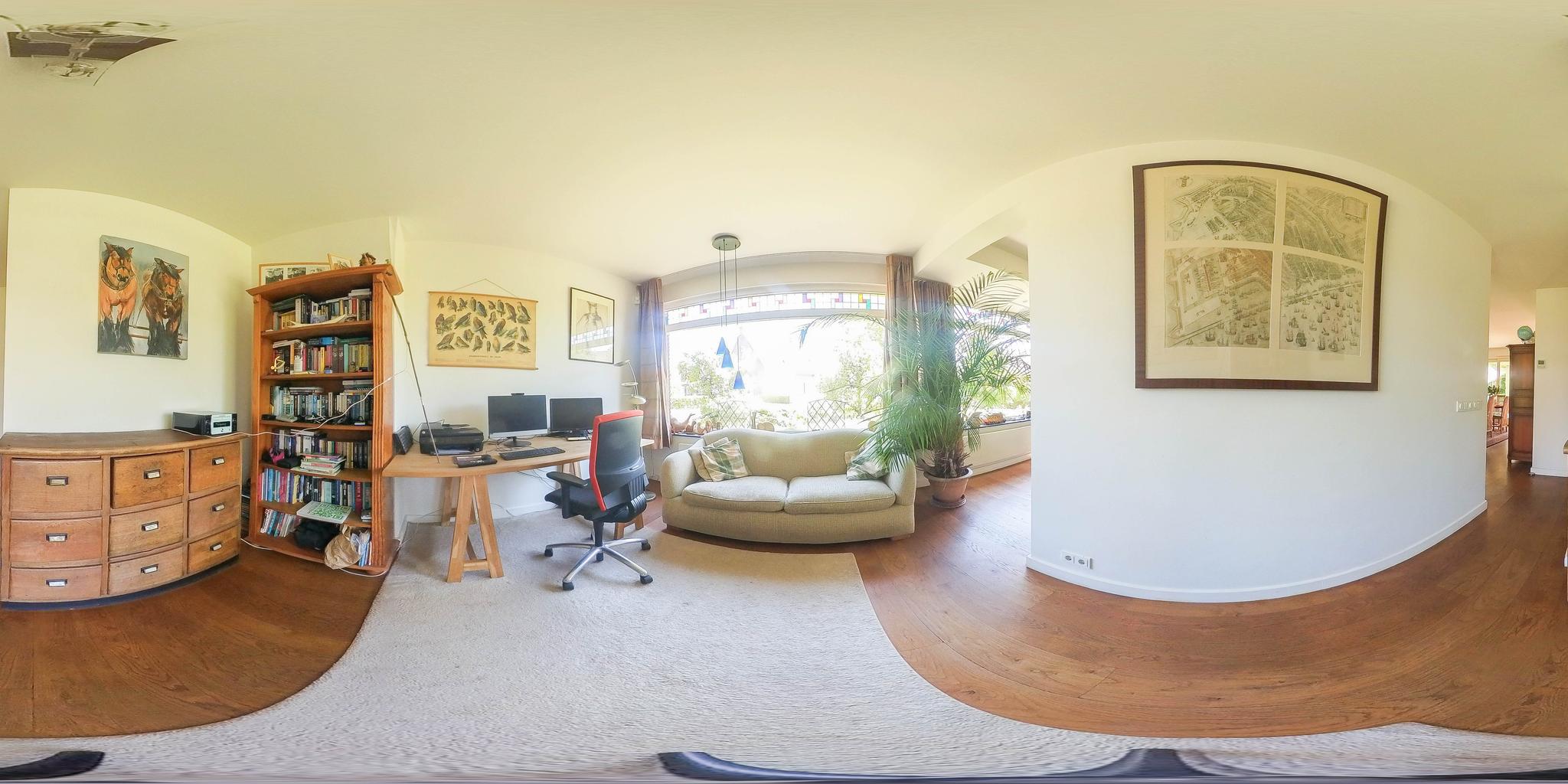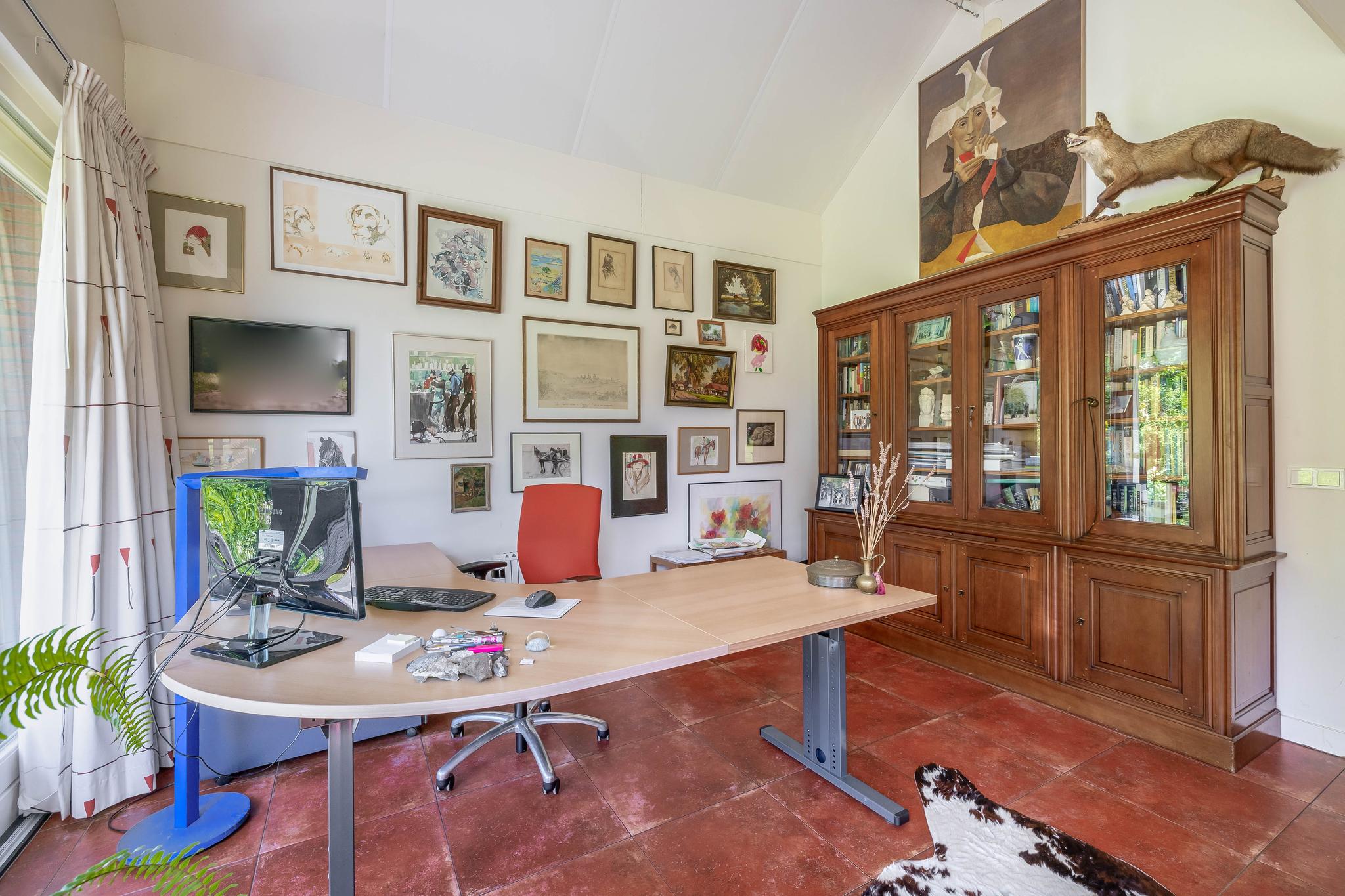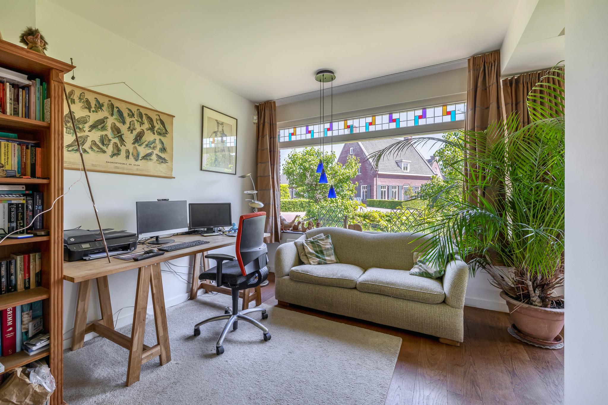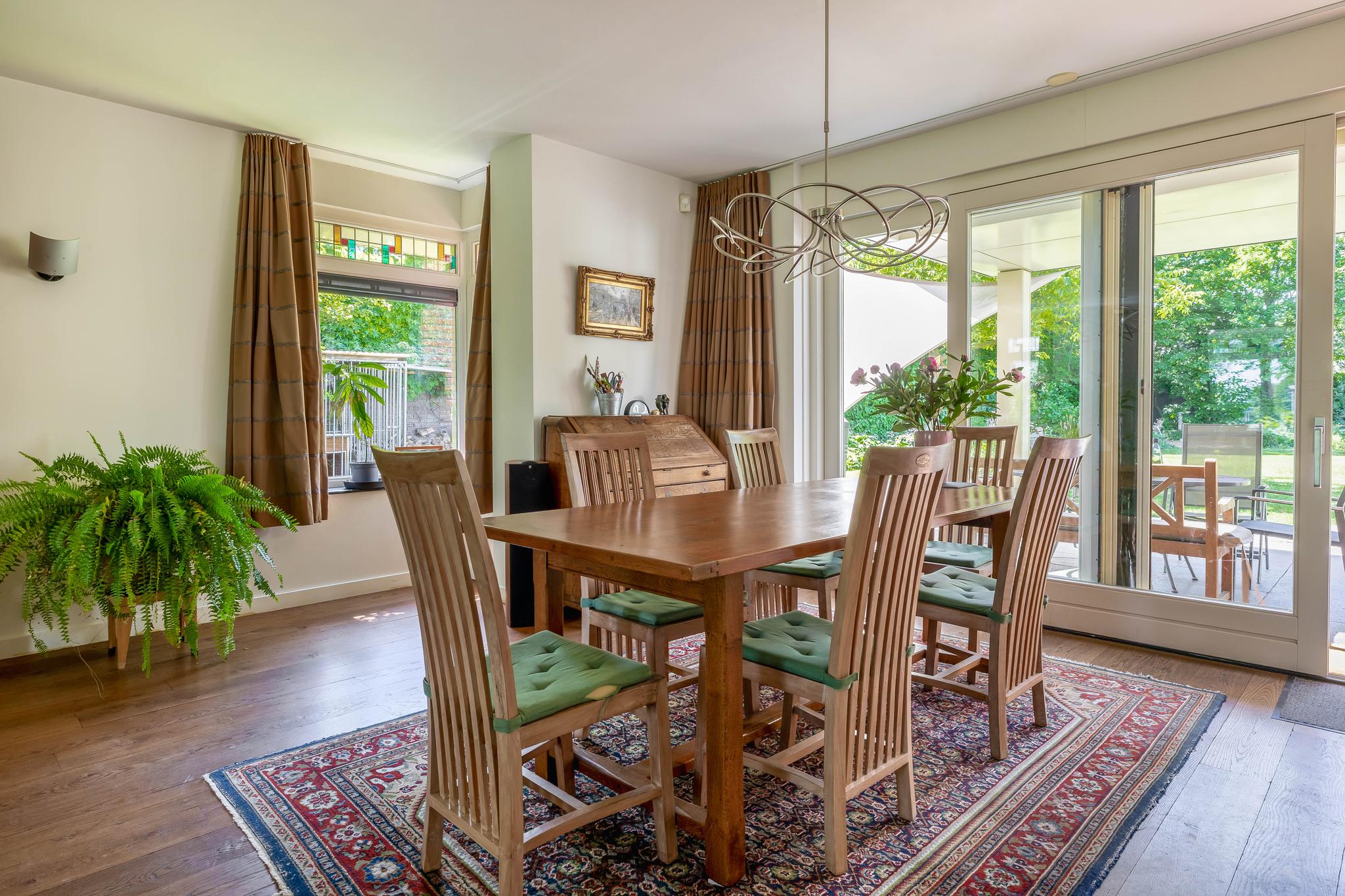 From the reception hall, you enter the very spacious living room, a wonderful place to relax. It is divided into a study/TV corner and a spacious sitting area with a wood-burning stove. The large dining area is adjacent to the garden and has sliding doors to the backyard and the covered terrace. Thanks to the large windows, the bay window at the front with stained glass in the upper part of the windows in the living room, there is plenty of natural light.