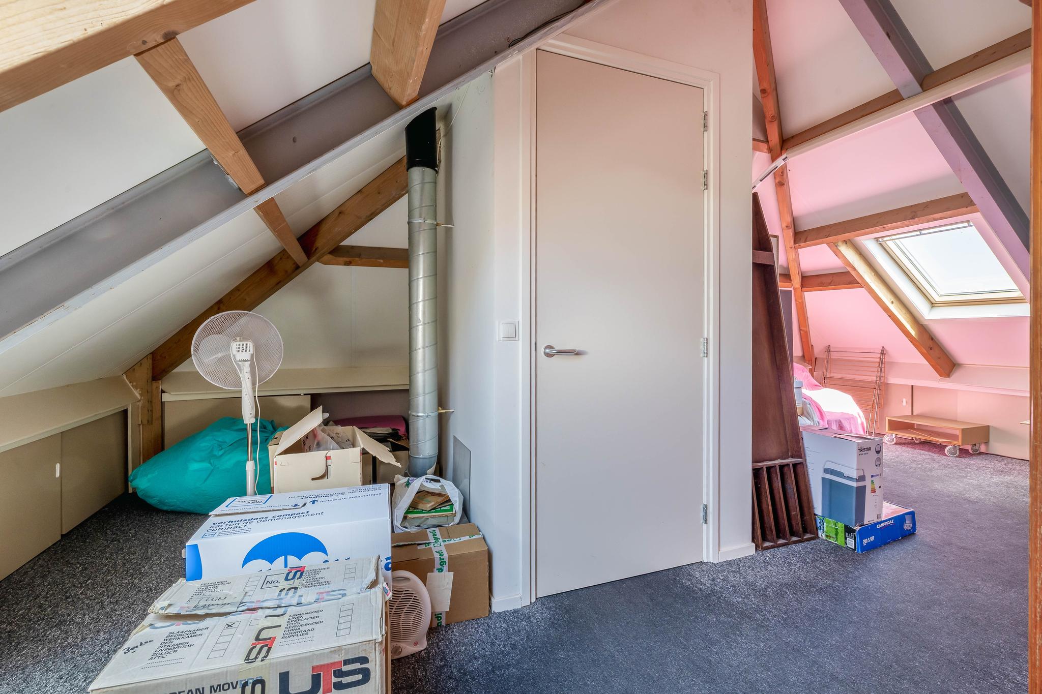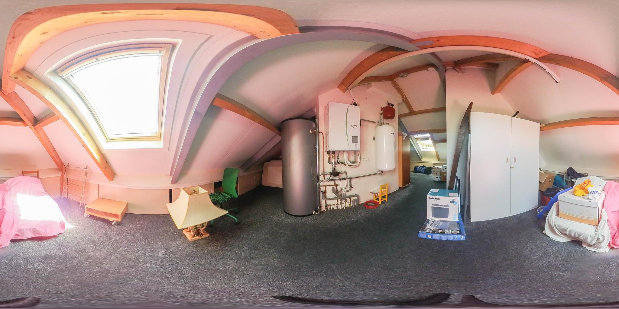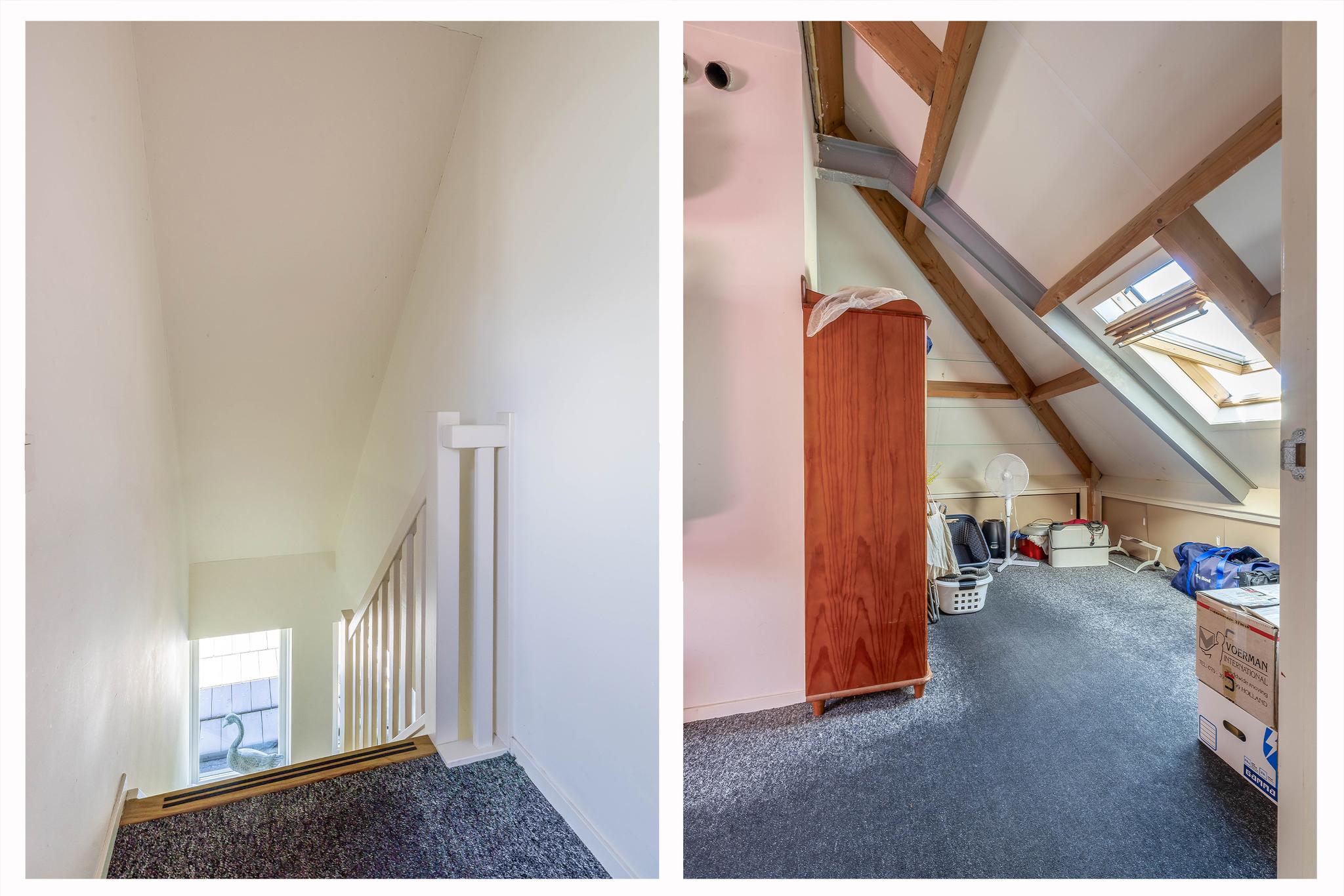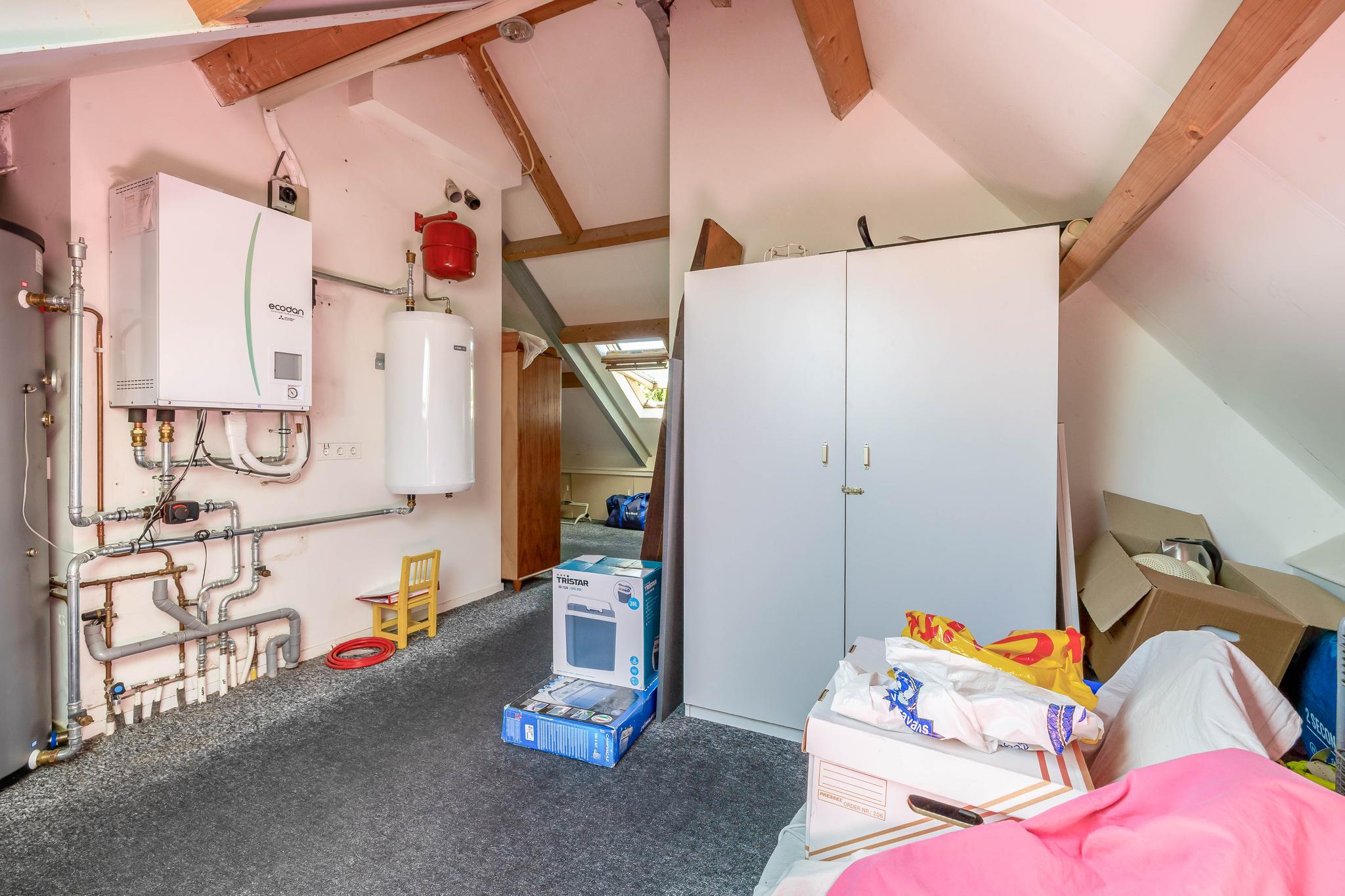 A fixed open staircase from the landing leads to the spacious attic. This space could be converted into an extra room. It houses the heat pump installation and the solar boiler. There is also cupboard space under the sloping roof and two Velux skylights provide daylight.