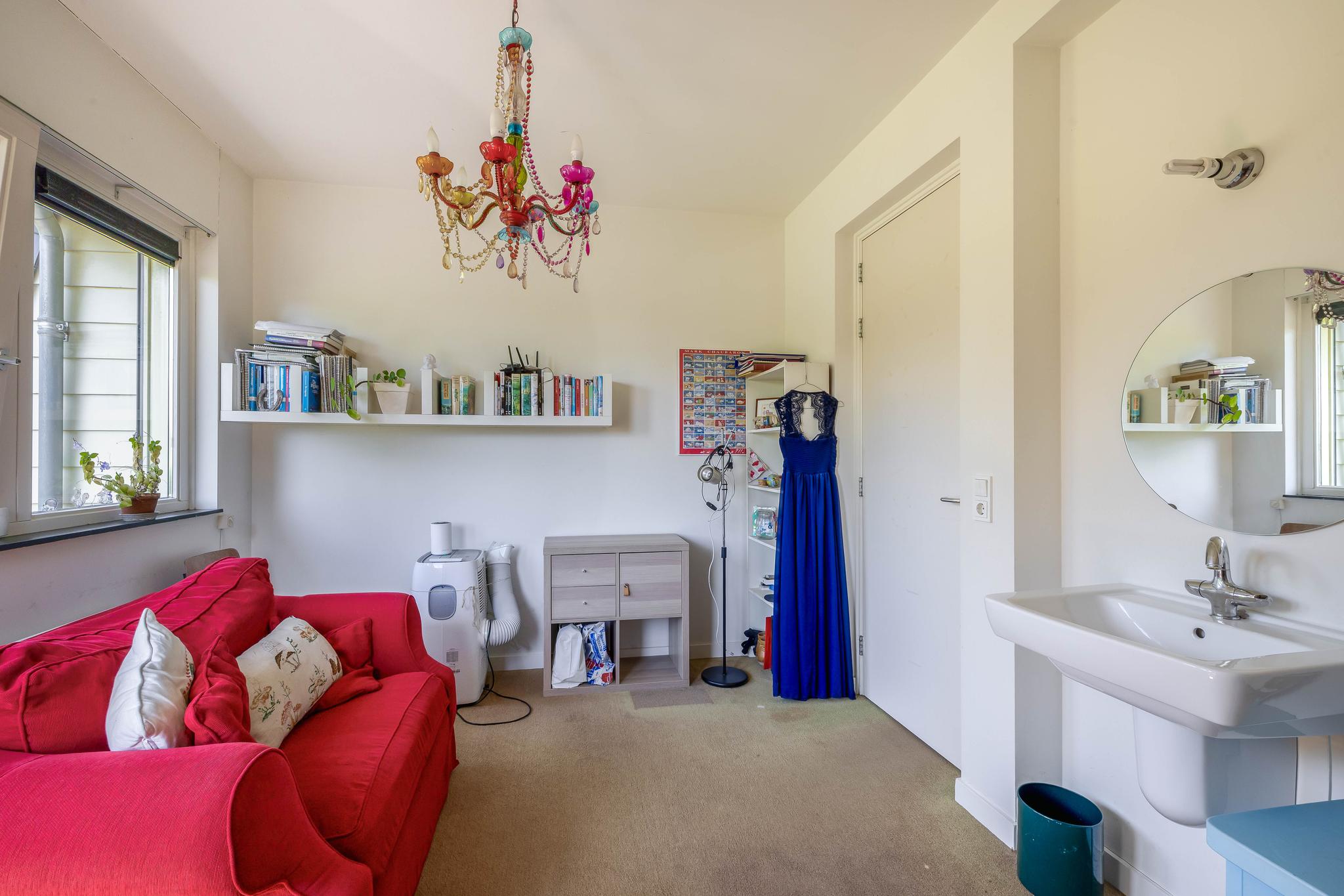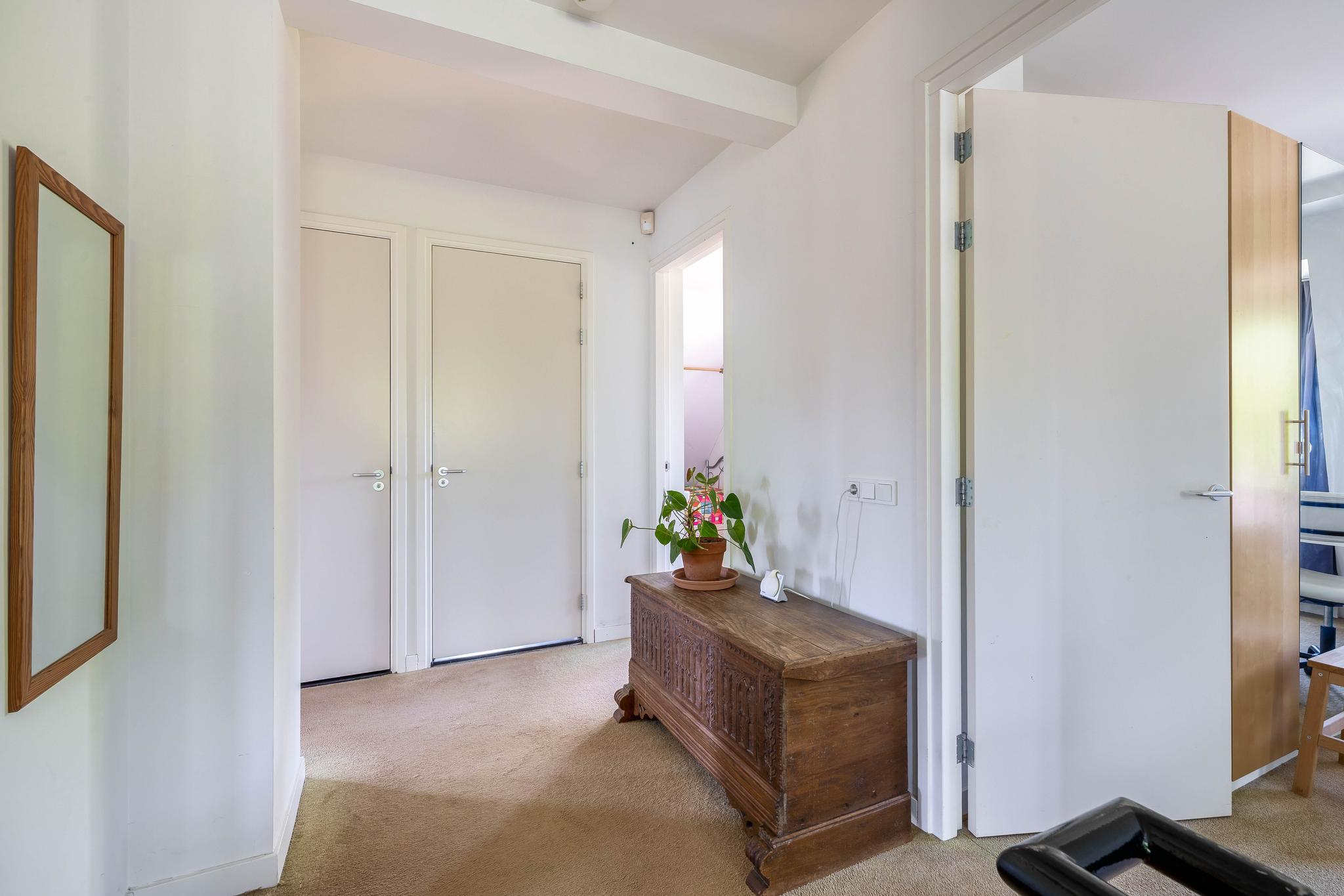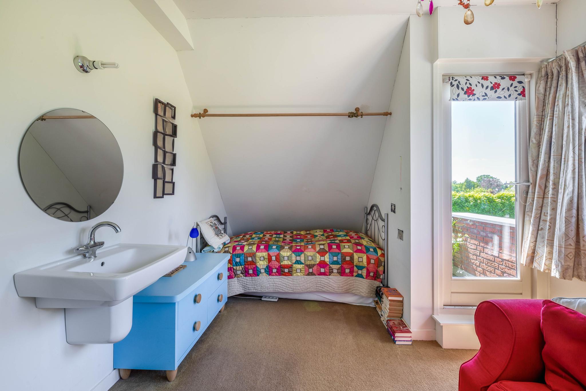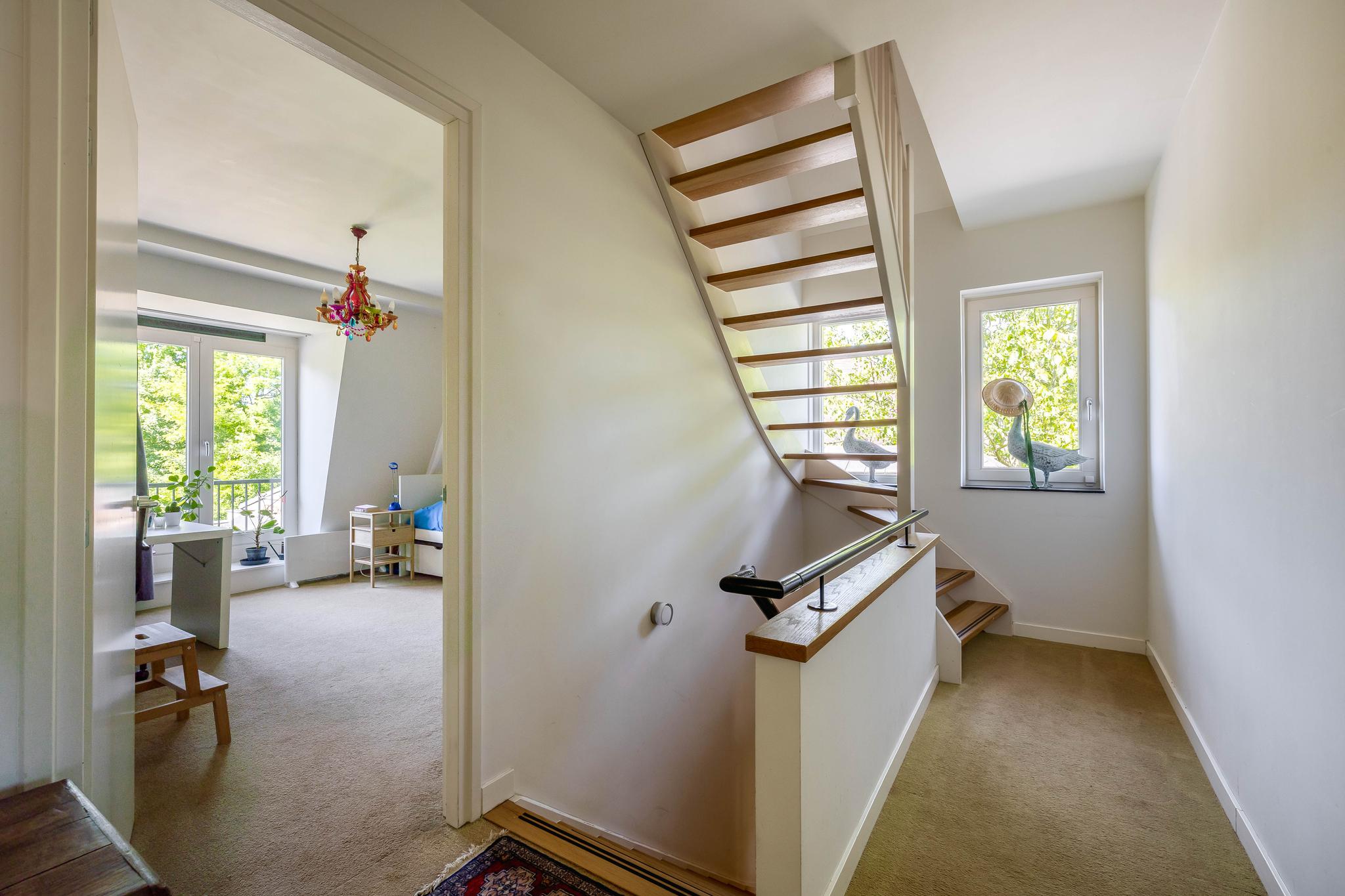 A fixed open staircase from the landing leads to the spacious attic. This space could be converted into an extra room. It houses the heat pump installation and the solar boiler. There is also cupboard space under the sloping roof and two Velux skylights provide daylight.